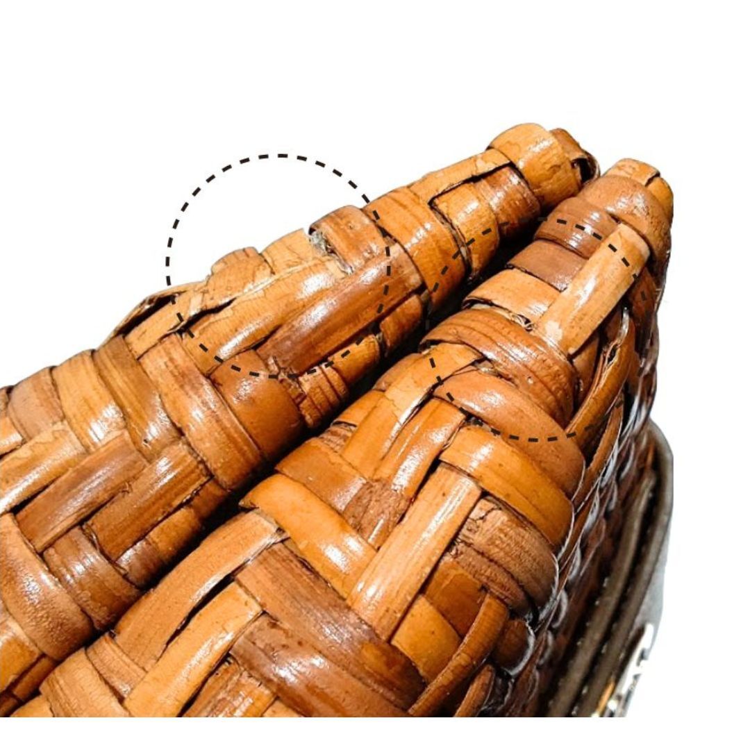 ・外側ラタンに軽微なスレ・ヒビがあります(写真9枚目参照)。大きな剥がれや割れはありません。一部透明の糸が見えている部分がありますが、内張留めで、リペア跡ではありません(写真10枚目参照)。