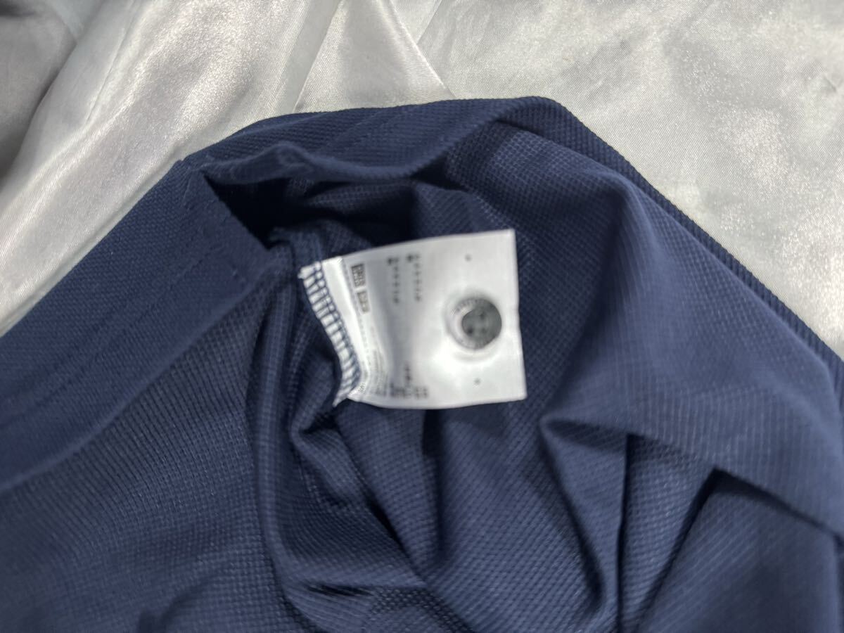 ネイビーのUNIQLOポロシャツ、襟に赤と白のストライプ。