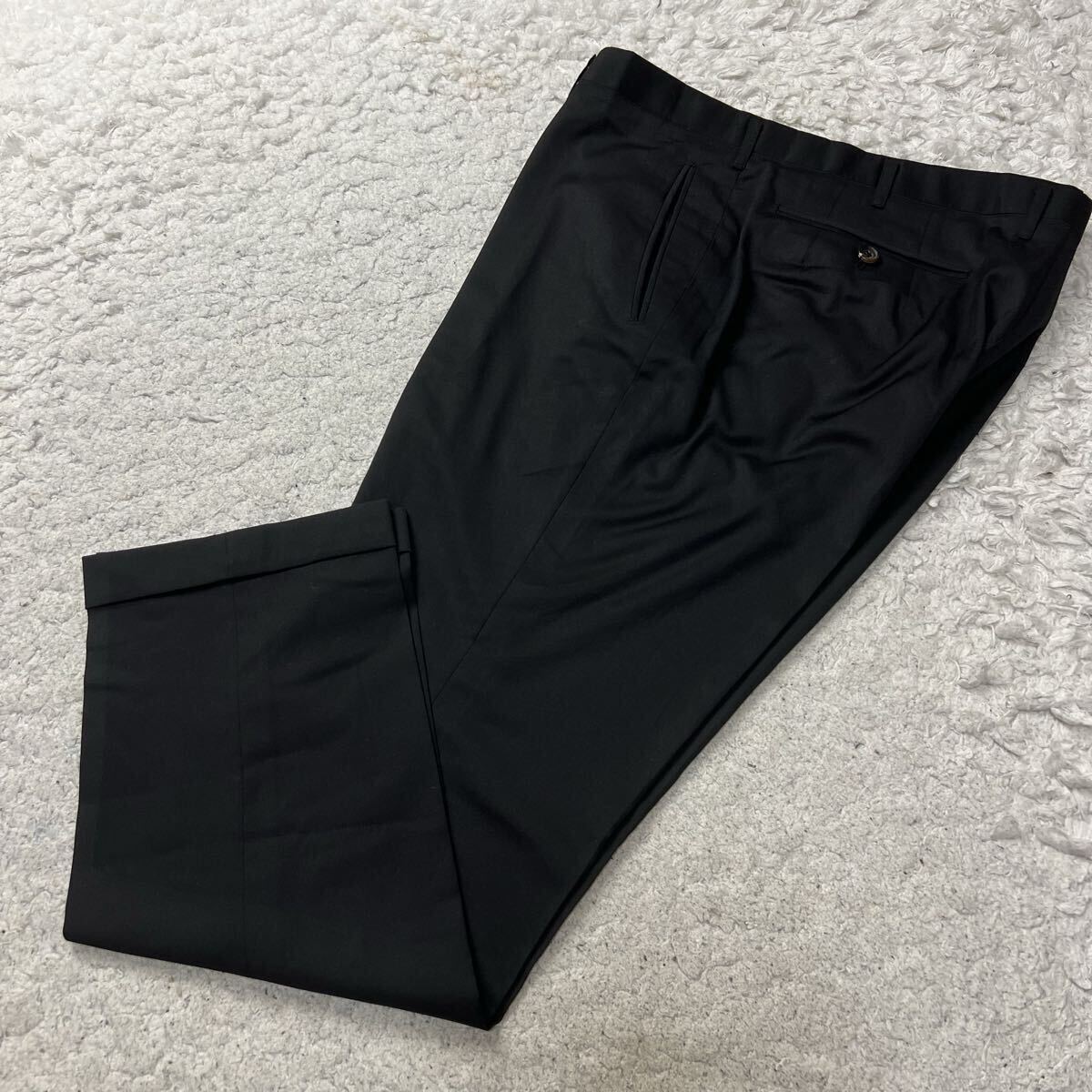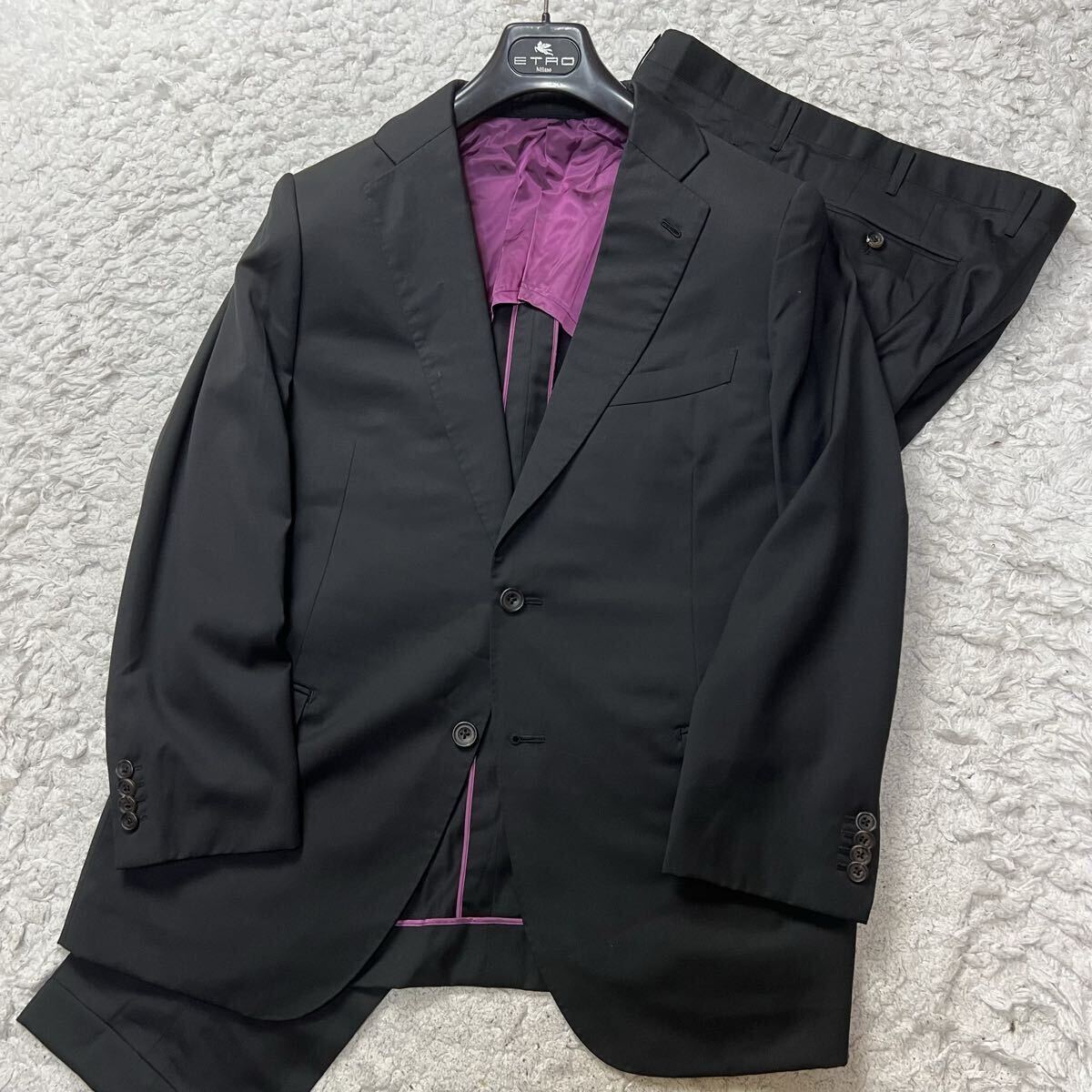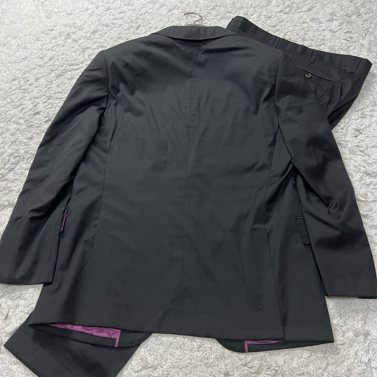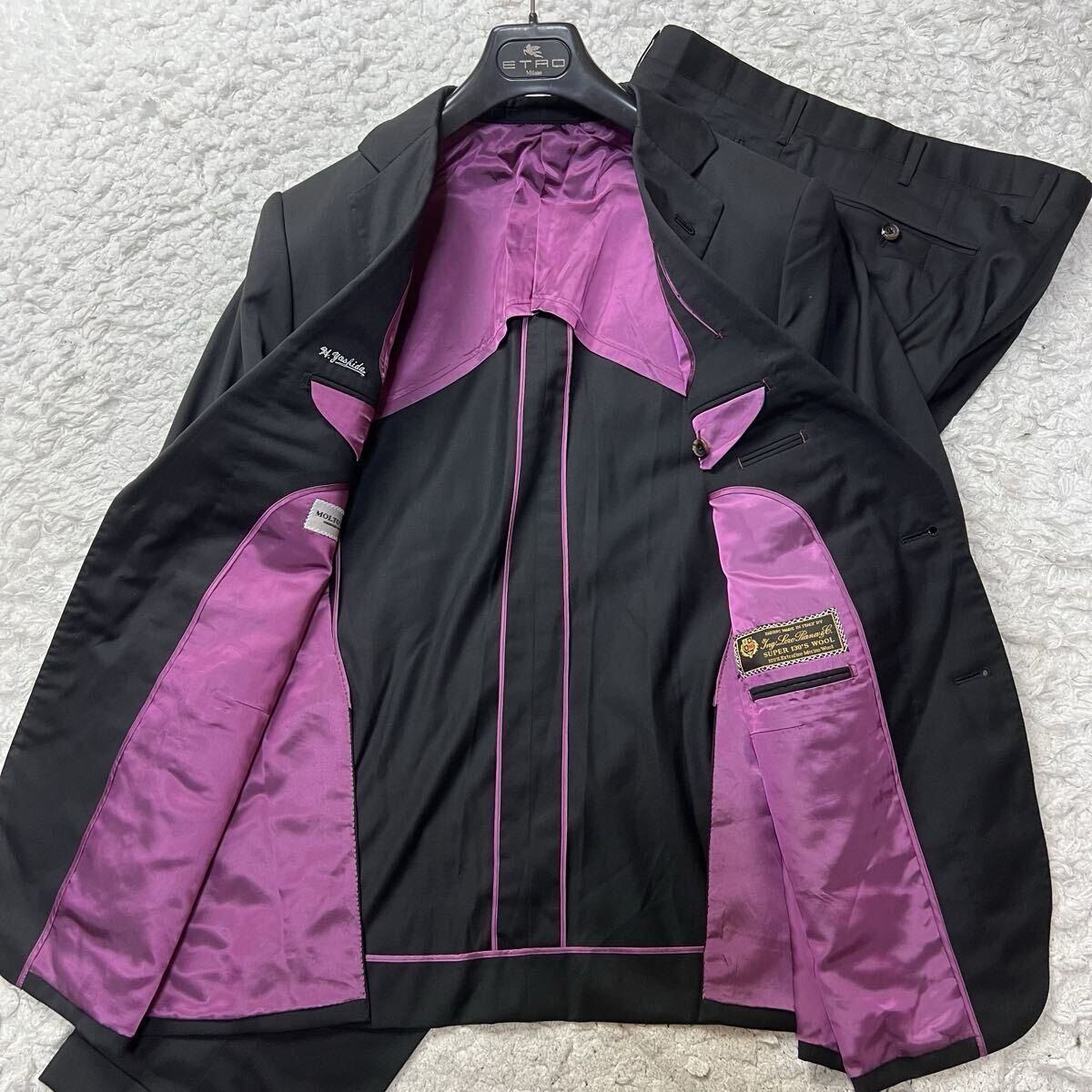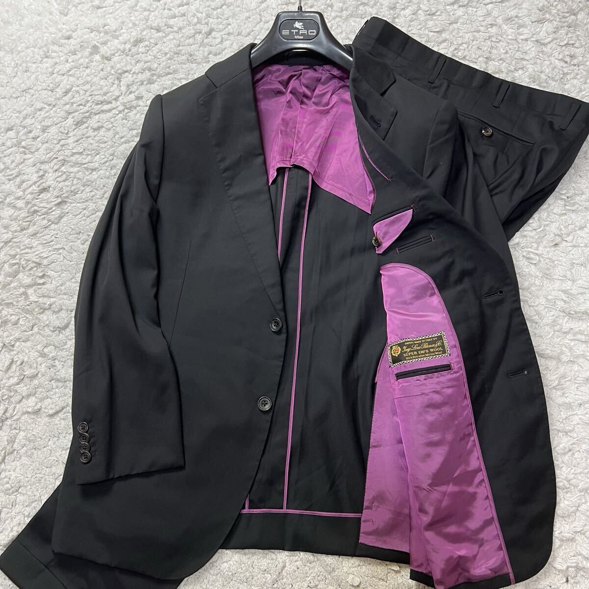 極美品 / スーツセットアップ(上下) / Super130’s / 100% EXTRAFINE MERINO WOOL / ブラック / 背抜き / 裏地ピンク / 光沢感あり / 2ボタン / サイドベンツ / イタリア生地使用 / オーダーメイド品 / サイズ表記無し(L相当)