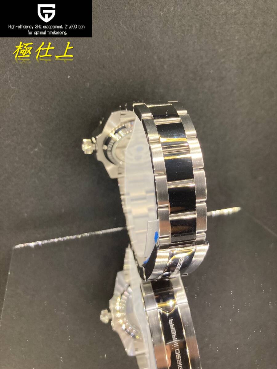 ■GMTモデルです。ベゼルは黒-青でとてもスポーティー爽やかな印象のモデルとなっております。極仕上げ品のため高級時計で感じられる「しっとり感」がございます。是非ご堪能下さい。