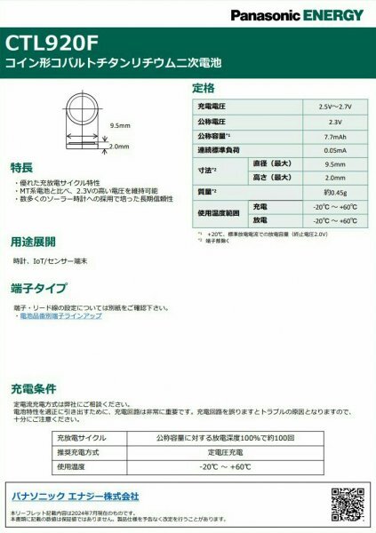 ★【新品・即決】Panasonic パナソニック CTL920F CTL系コイン形リチウム二次電池 1個 [並行輸入]★