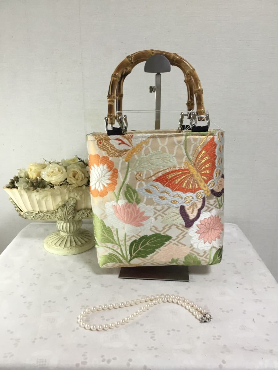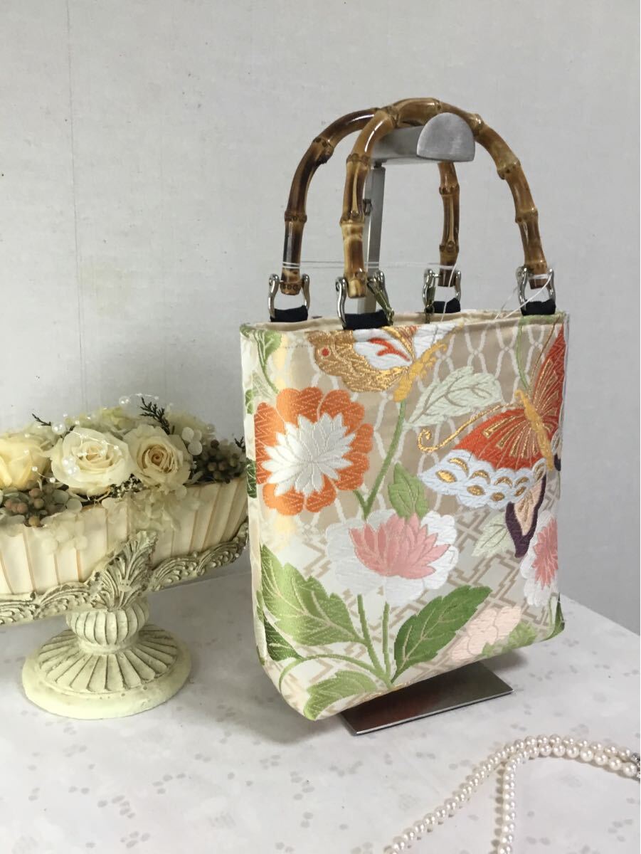 白地にお花や蝶が施されたのバックです。とても可愛いです。