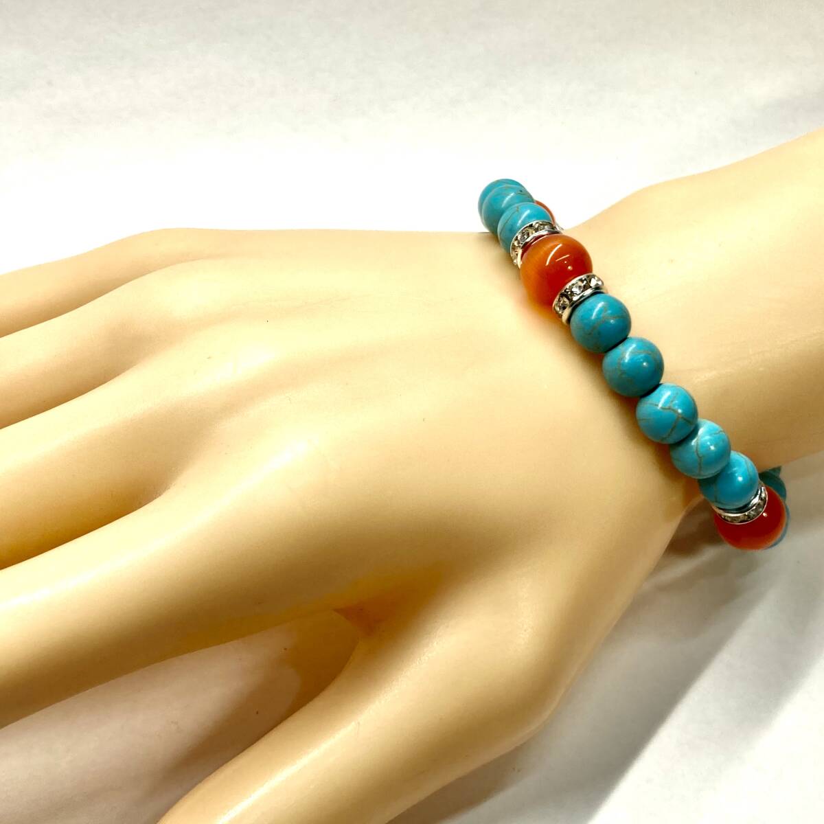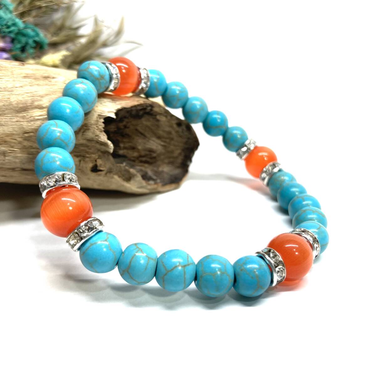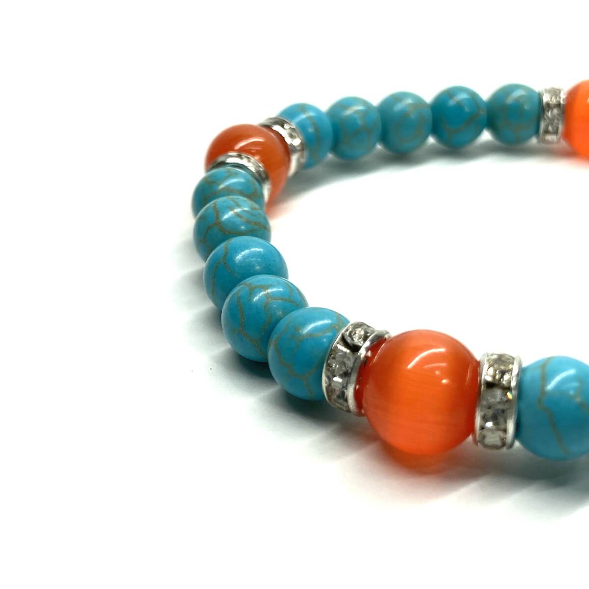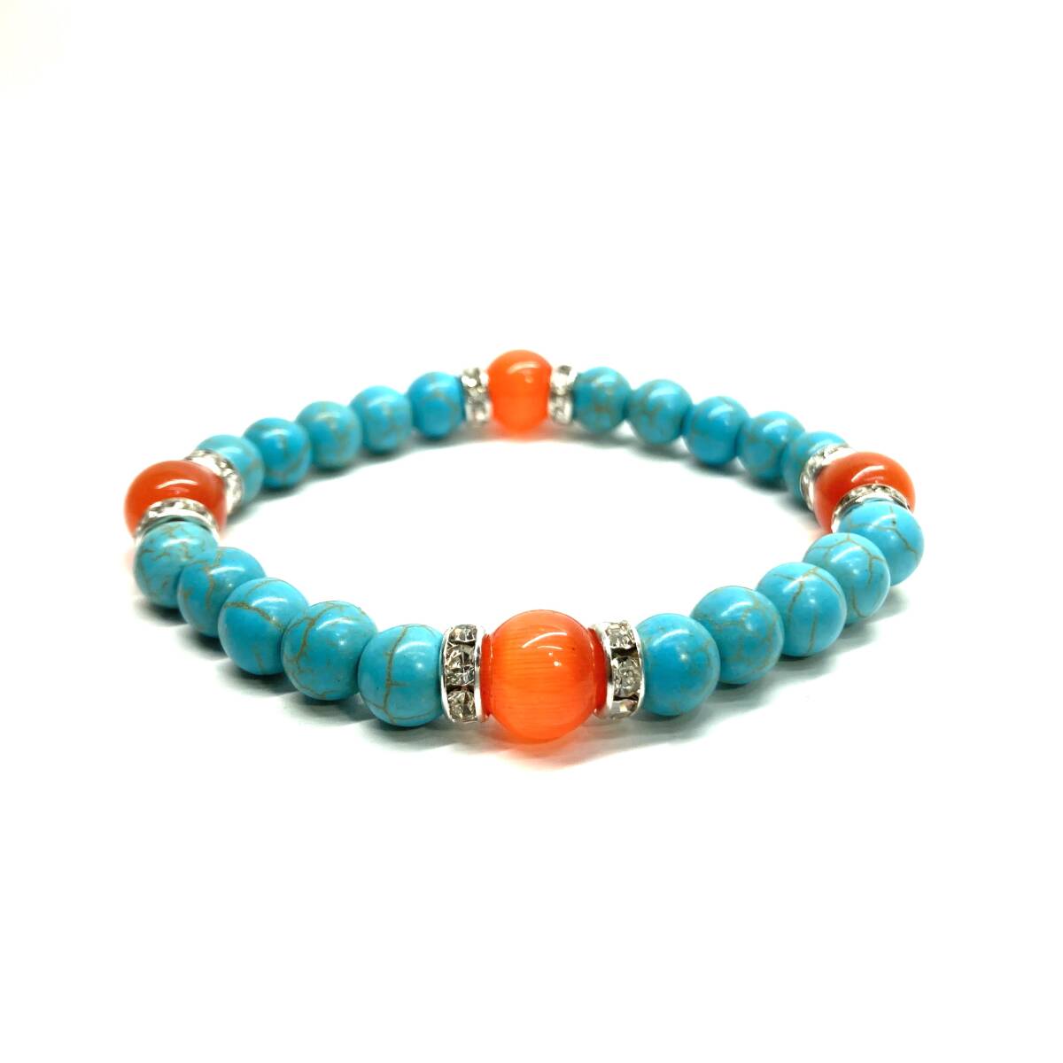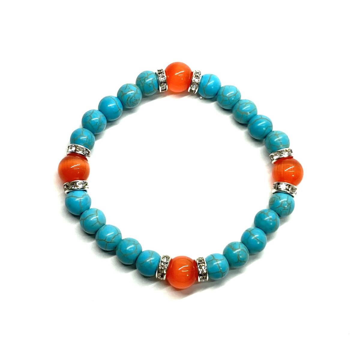 こちらは、8mm玉のキャッツアイとターコイズを使用したパワーストーンブレスレットです。間にはロンデルを挟み高級感ある大人っぽいデザインに仕上がっています。内周約17cmです。気になる方は是非この機会にどうぞ。