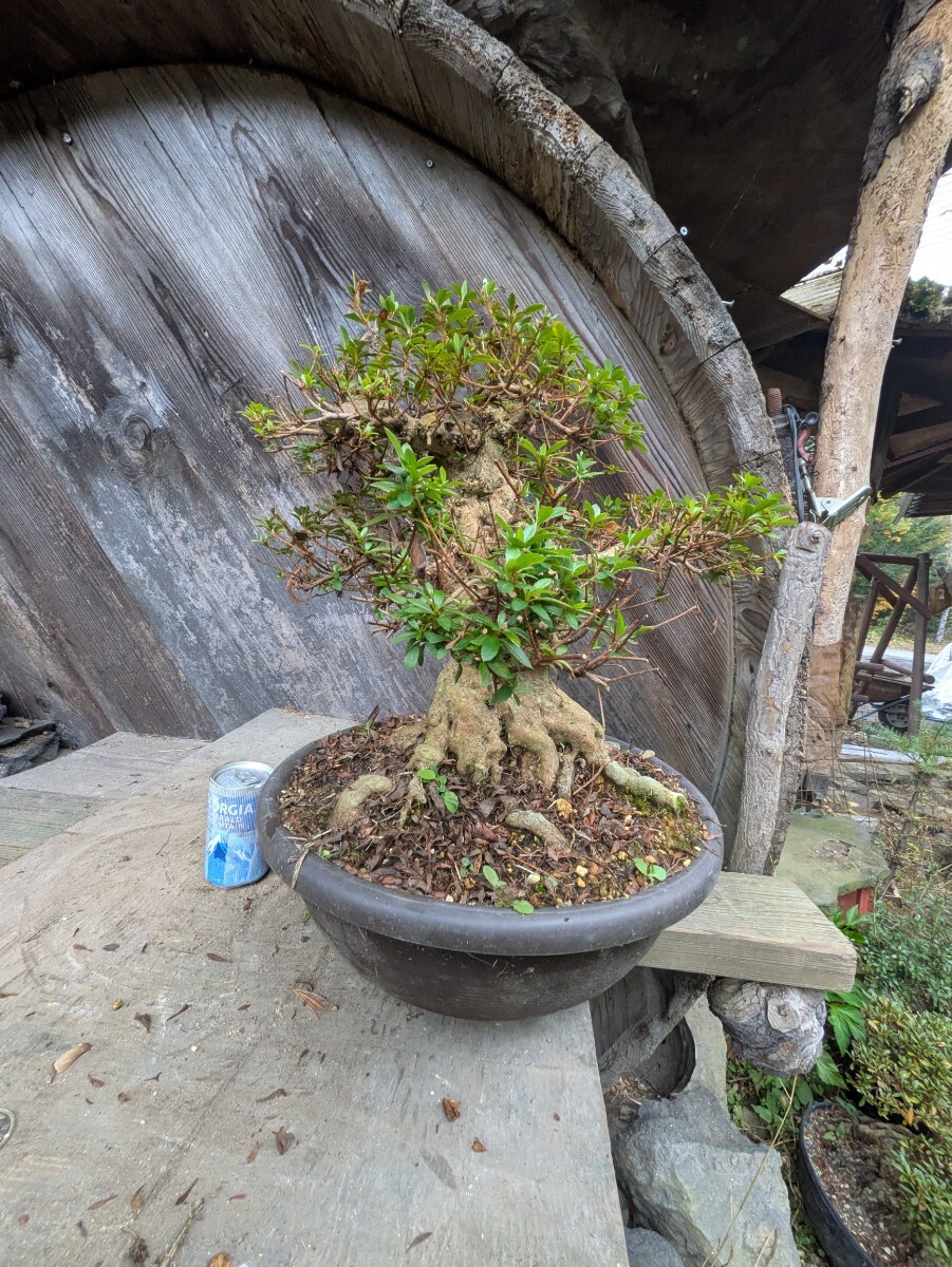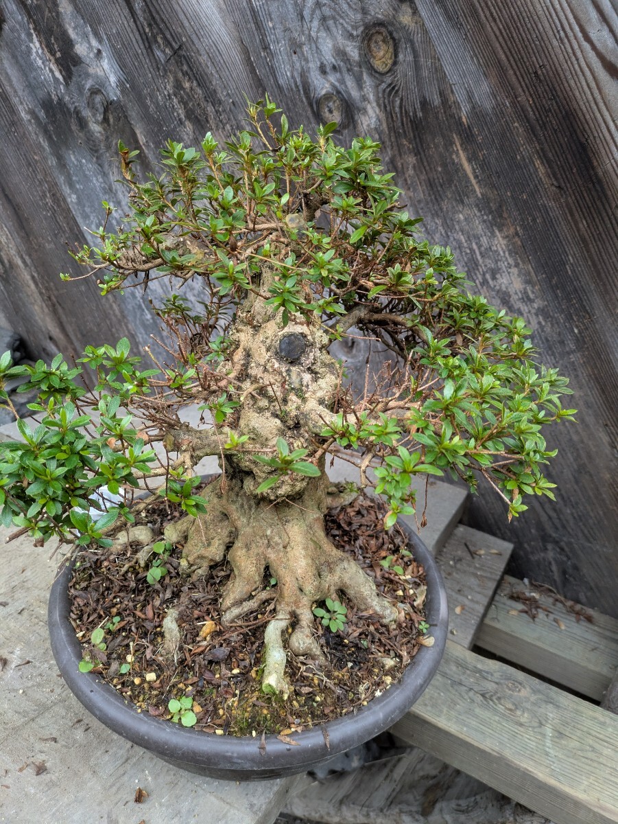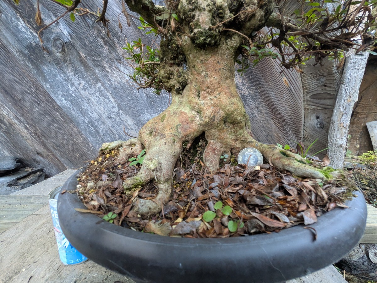 およそは40x40x48cmの枠に入るサイズ。根本付近からの高さは35cmくらい。10年くらい前に 現在の頭下の主幹を大きく切り 太幹で小さく根張りのコンパクトな木にしてます。その切ったヶ所も肉乗りしたり擁護材を出したりしてます。枝も主幹近くにしてきたので 小枝が枯れたりしてる部分もあります。プラ鉢は長年で老朽化してます。発送梱包の際に痛むヶ所が有るかもしれません。佐川急便にて発送する事も有ります。
