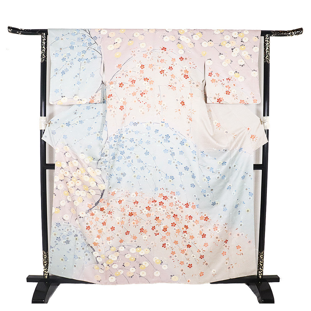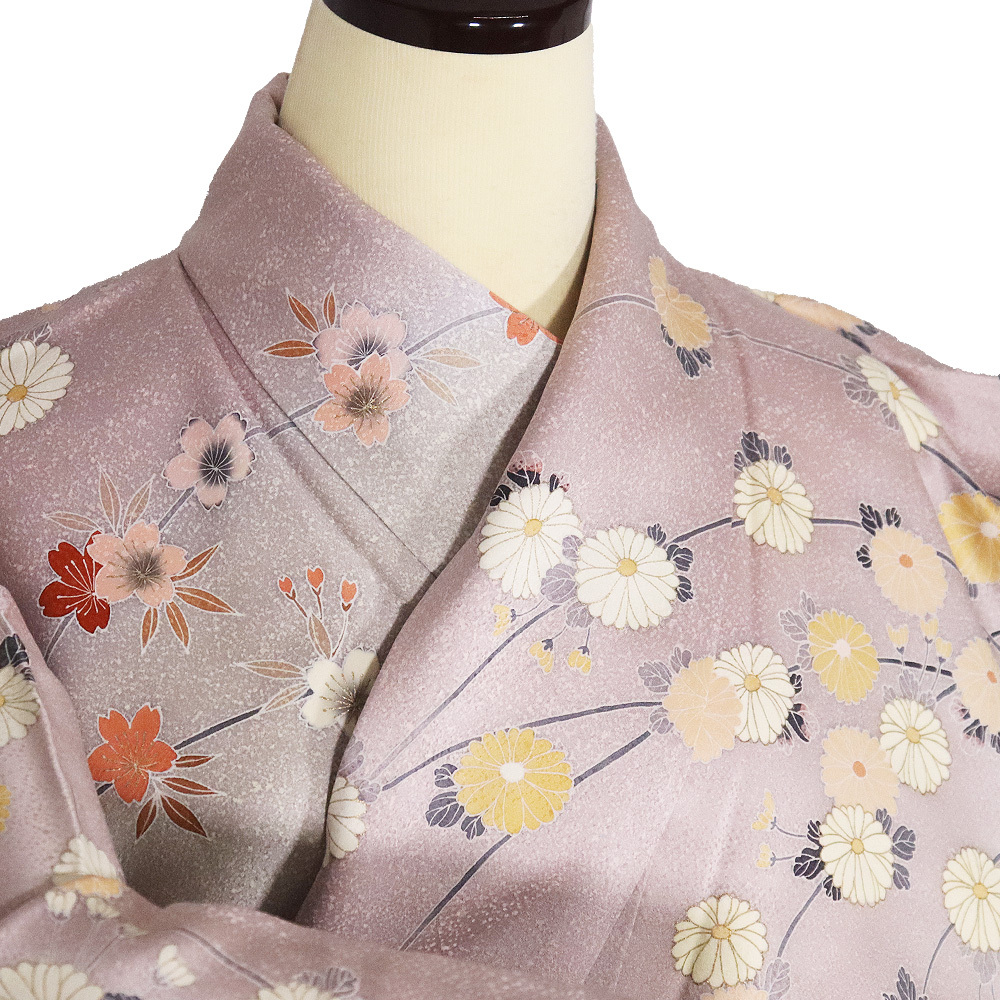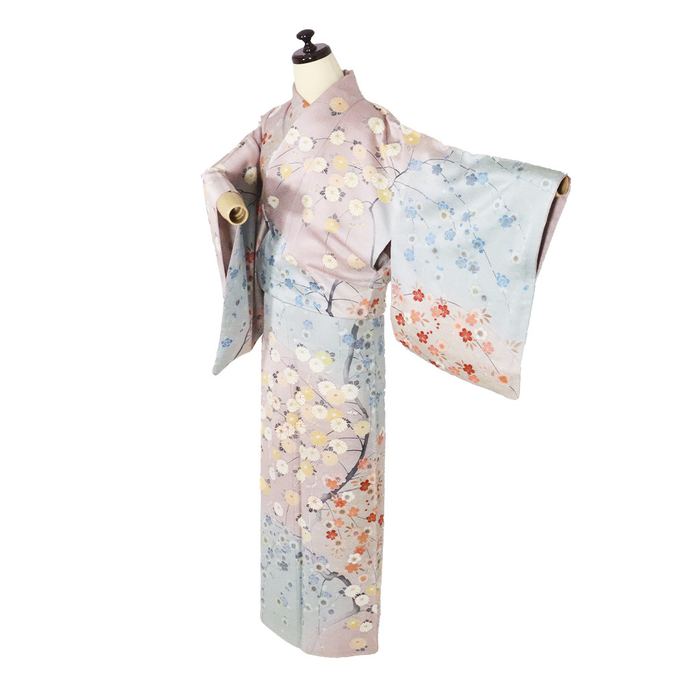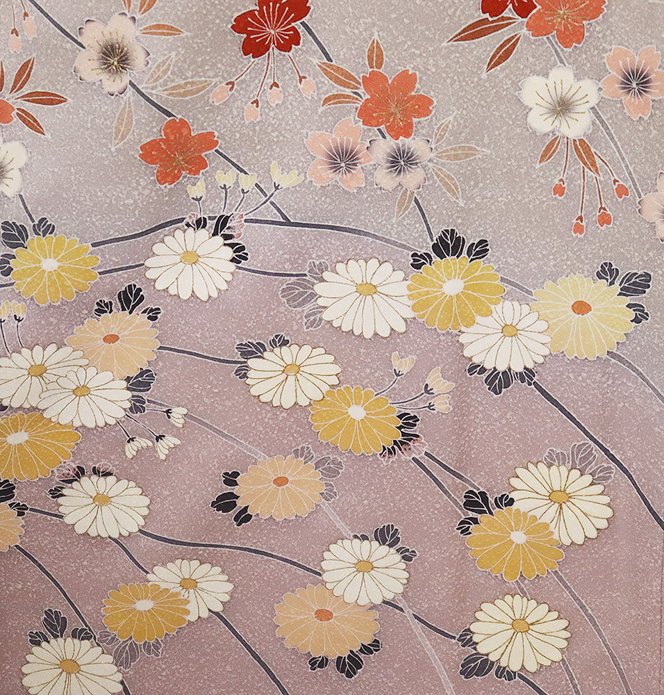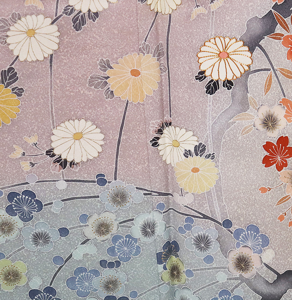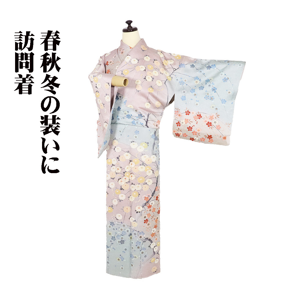 | 色・柄 | 訪問着 袷 丹後縮緬地 緑(瓶覗色)・赤紫(石竹色)・暈し地 菊・桜・梅 (写真では上手く色が出ない場合があります。ご了承下さい) |