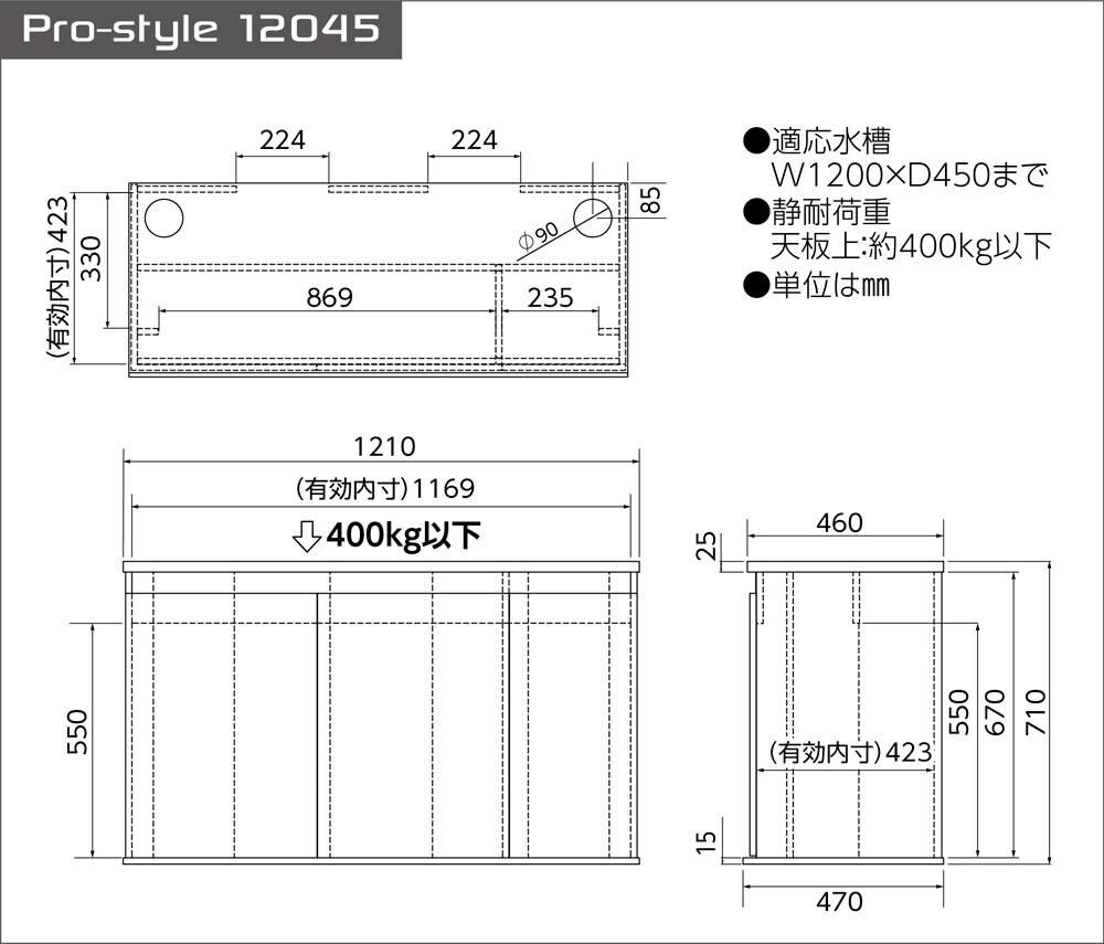 ※この水槽台は内部に補強板があるため、前側の有効内寸が869mmになります。
