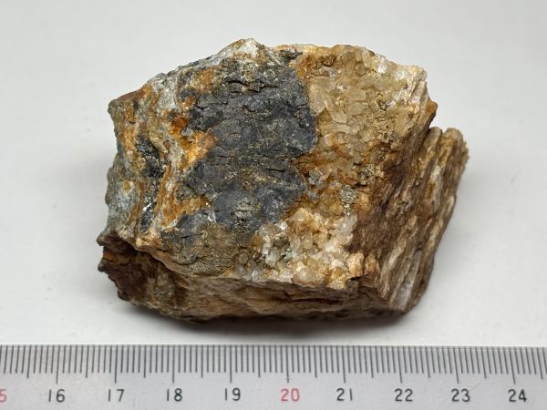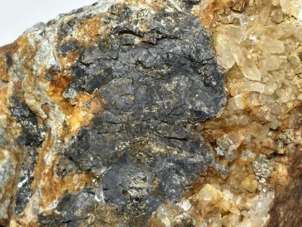 大森鉱山産閃亜鉛鉱です石英中に黒色の閃亜鉛鉱が産出します。