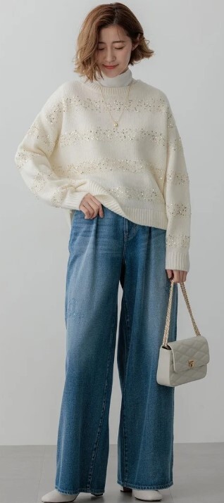 パンツでもスカートでも合わせやすく、一点投入で華やぎコーデが完成する存在感のあるニットです。