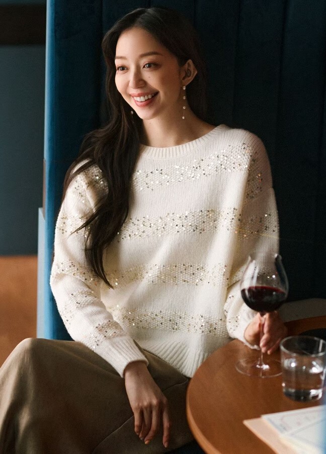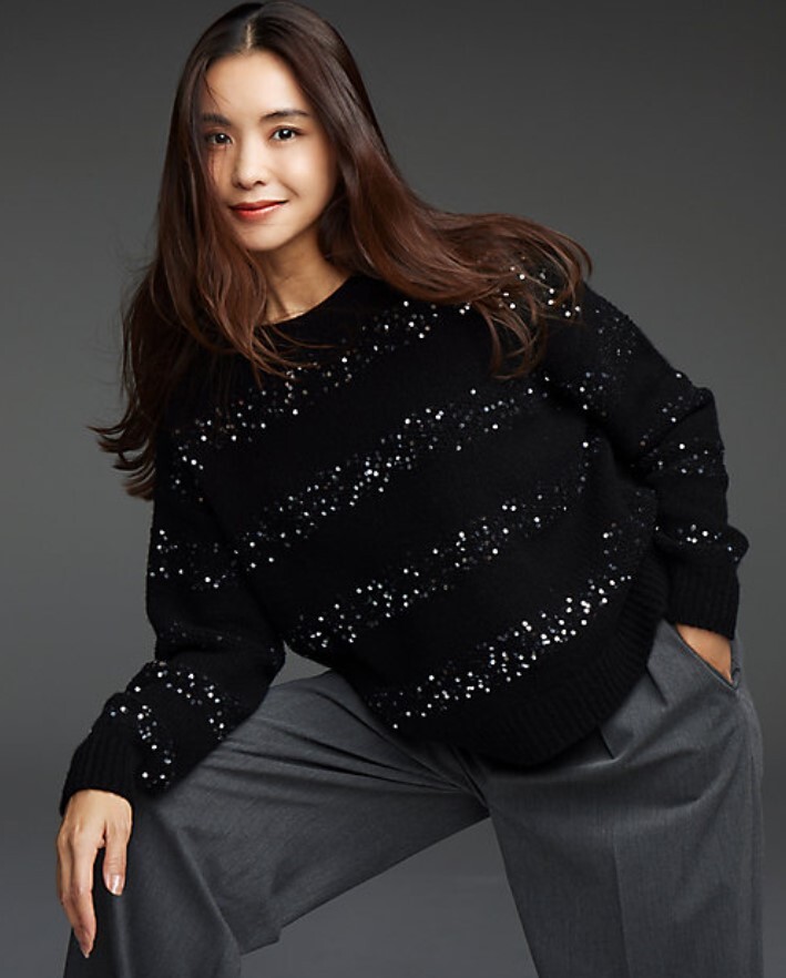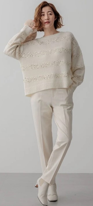 スパンコールをふんだんに編み込んだ大人の華やぎニット。