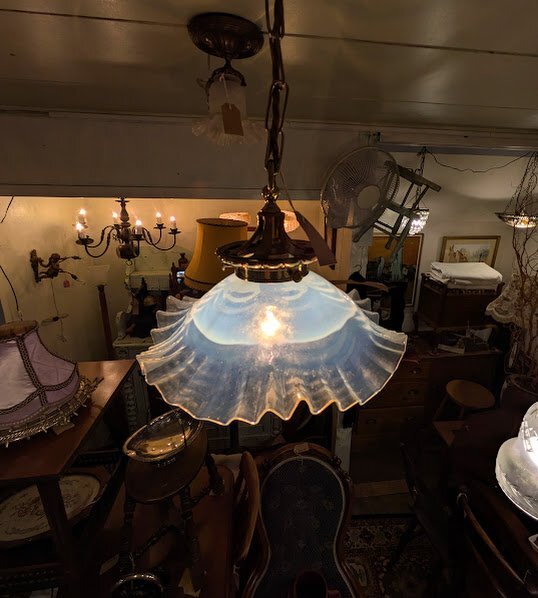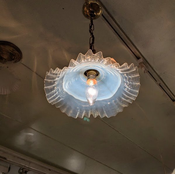 淡いブルーを帯びた乳白色のシェードが、点灯時には柔らかな光を広げ、お部屋全体を包み込むような優しい雰囲気を演出します。波打つフリル状の縁は花びらのように繊細で、真鍮の金具やチェーンとの組み合わせが上品な印象です。