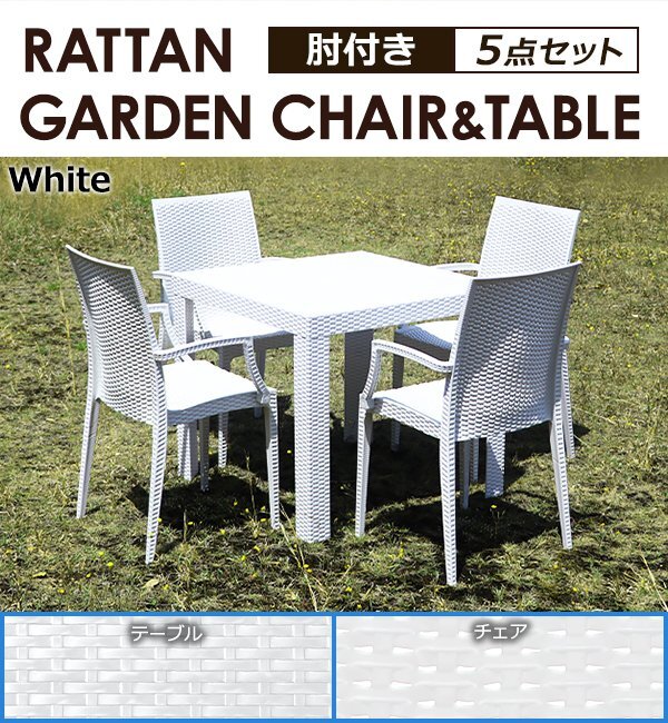 | 商品名 | 送料無料 ラタン調 ラタンテーブル ラタンチェア プラスチックチェア ガーデンチェア ガーデンテーブル 5点セット 肘付きチェア テーブル幅約80cm UVカット 4脚 軽量 ラタン調ガーデンセット 庭 パラソル使用可 屋外用 PP rtntablet |