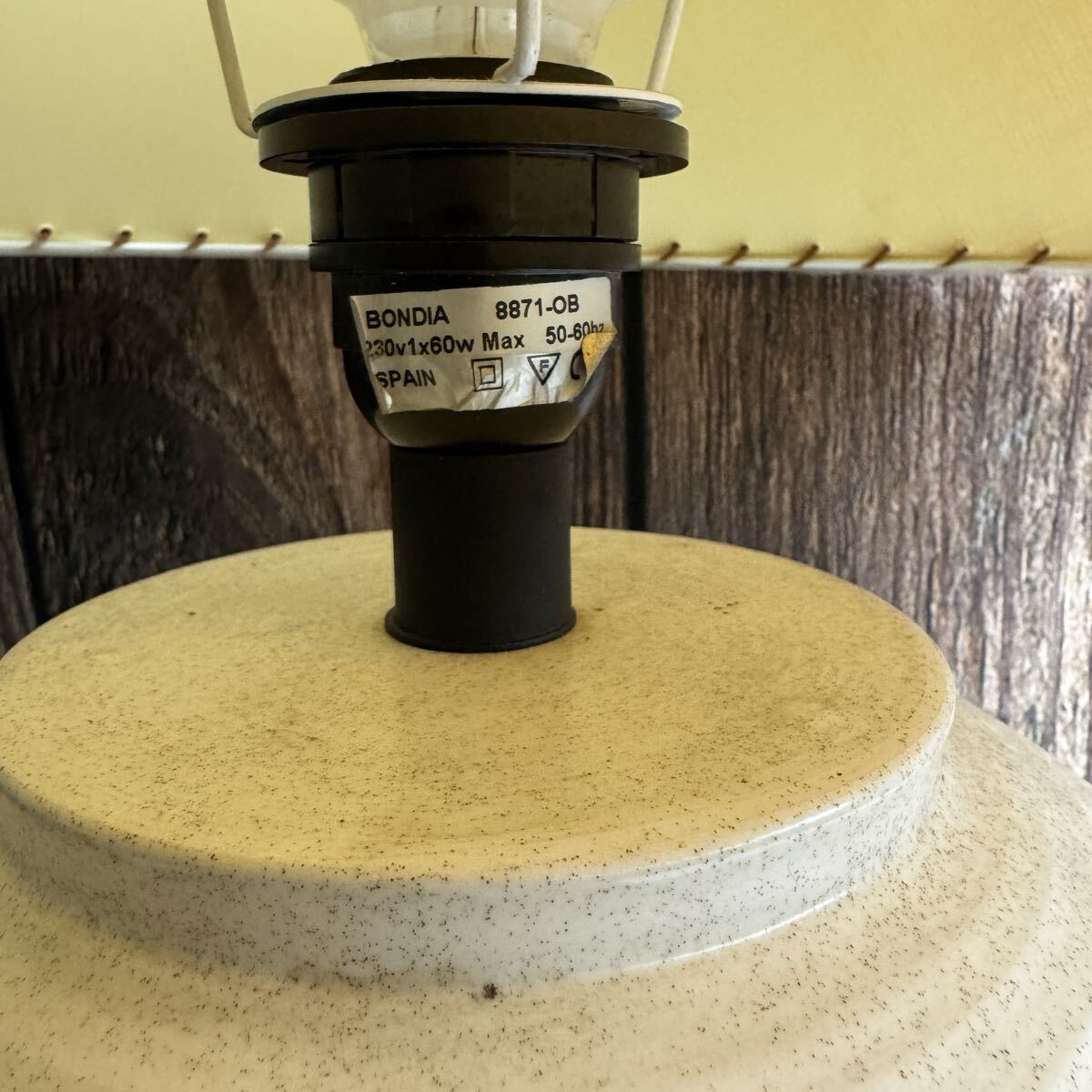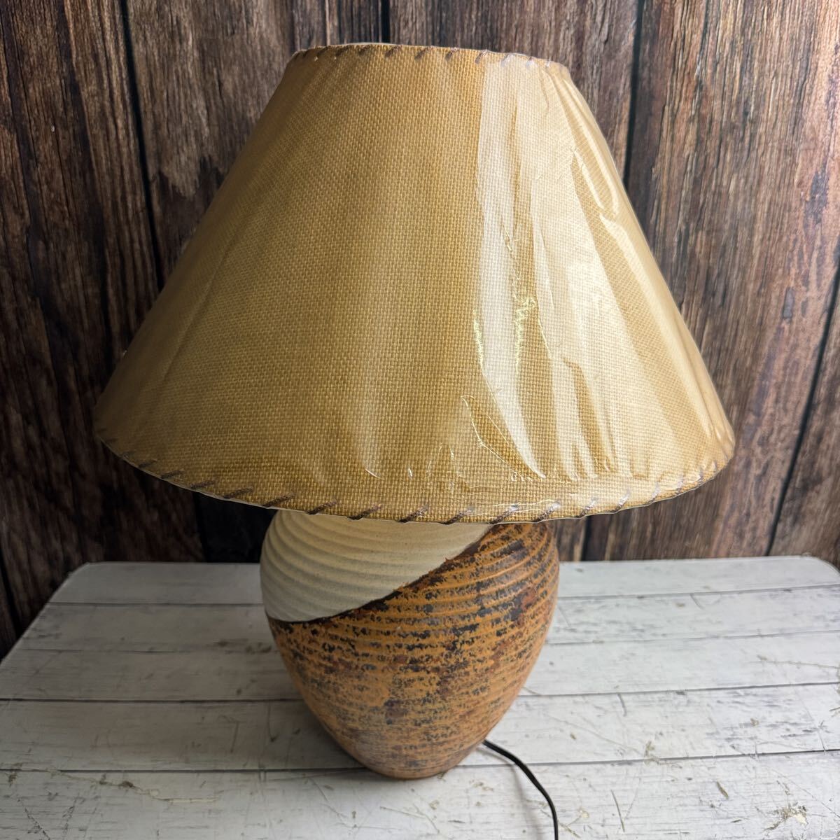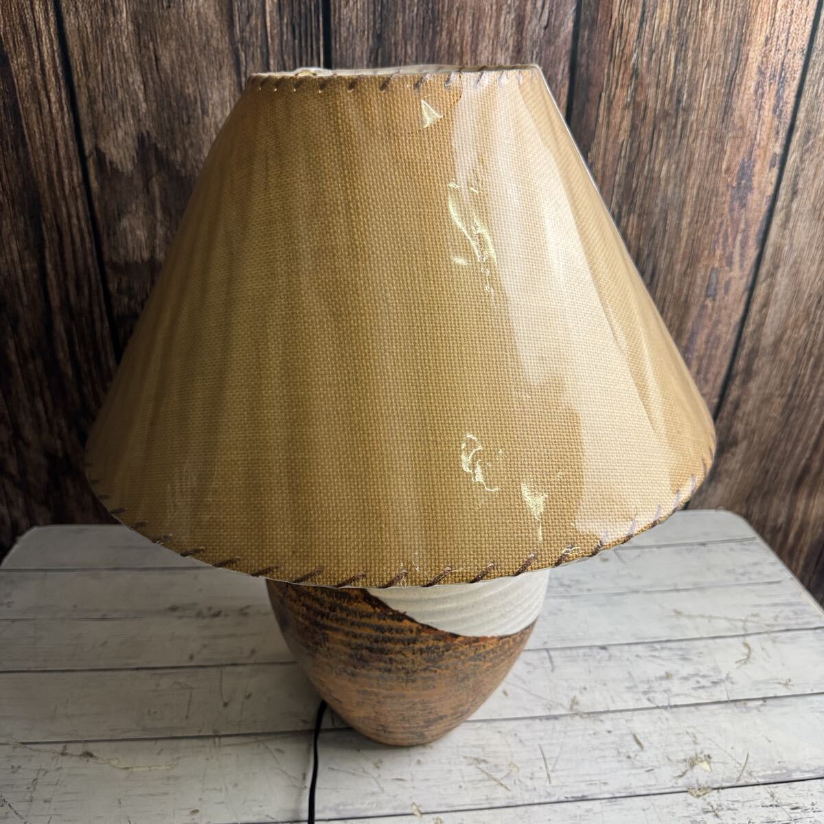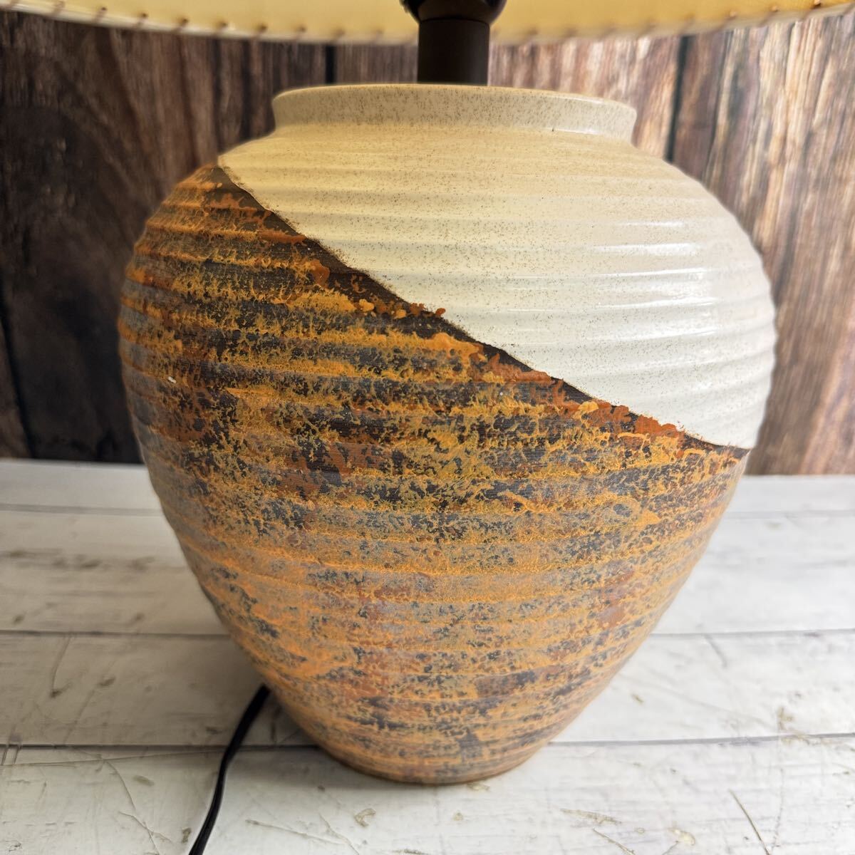 ベージュの布製シェードが付いた、白と素焼き風の質感の陶器製テーブルランプです。