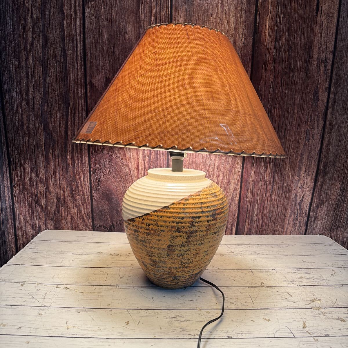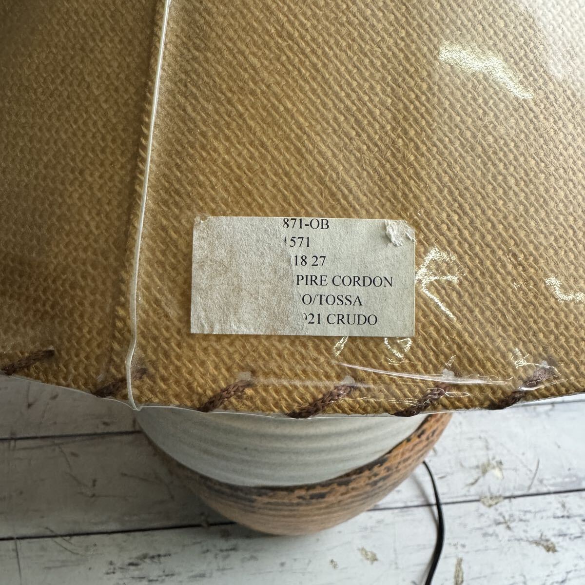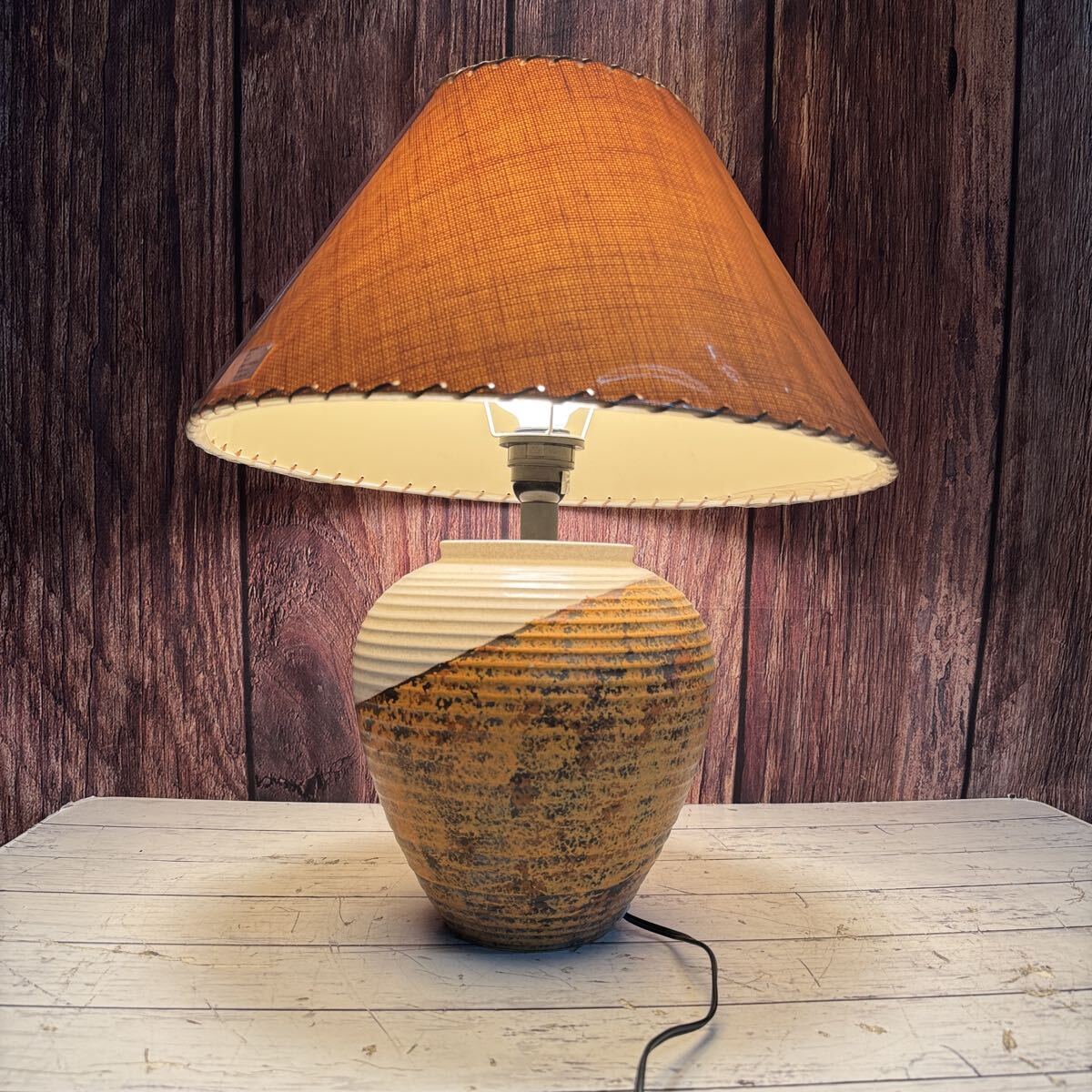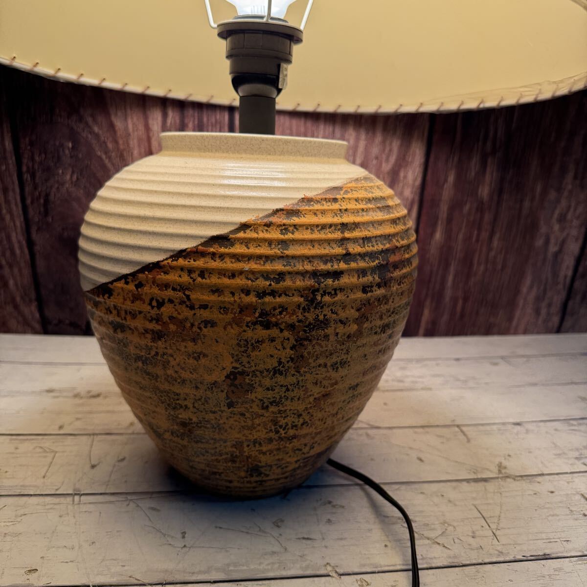 ベージュの布製シェードが付いた、白と素焼き風の質感の陶器製テーブルランプです。