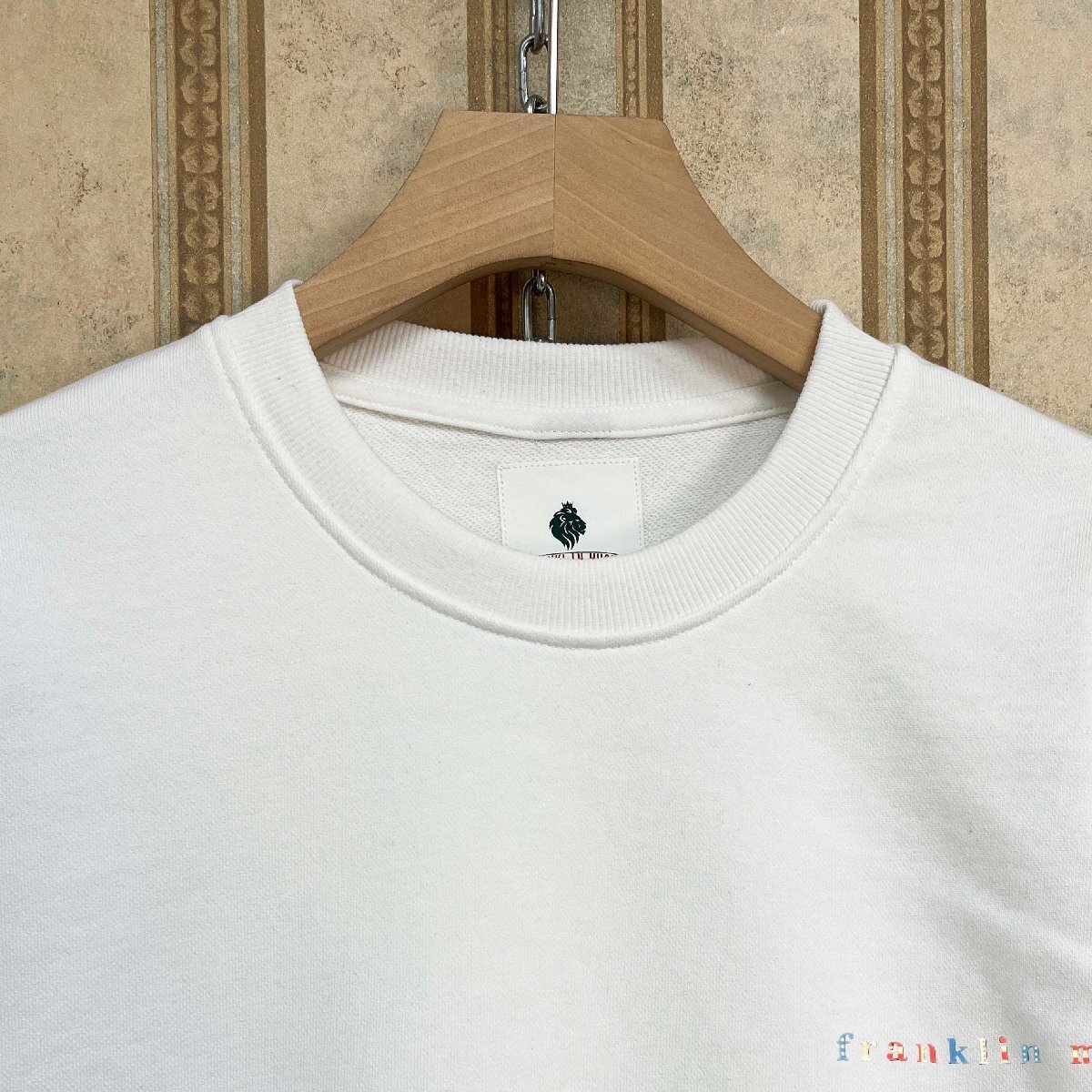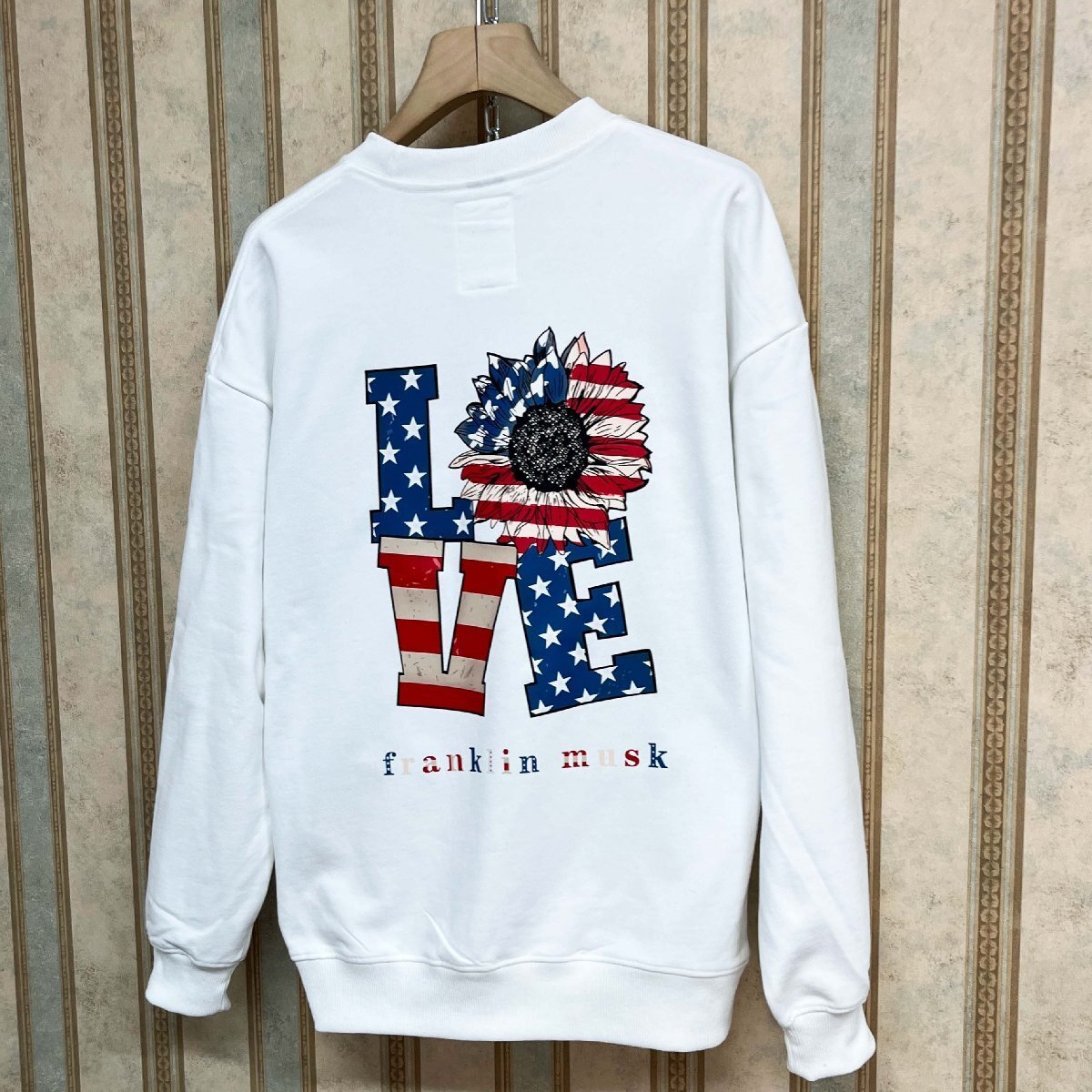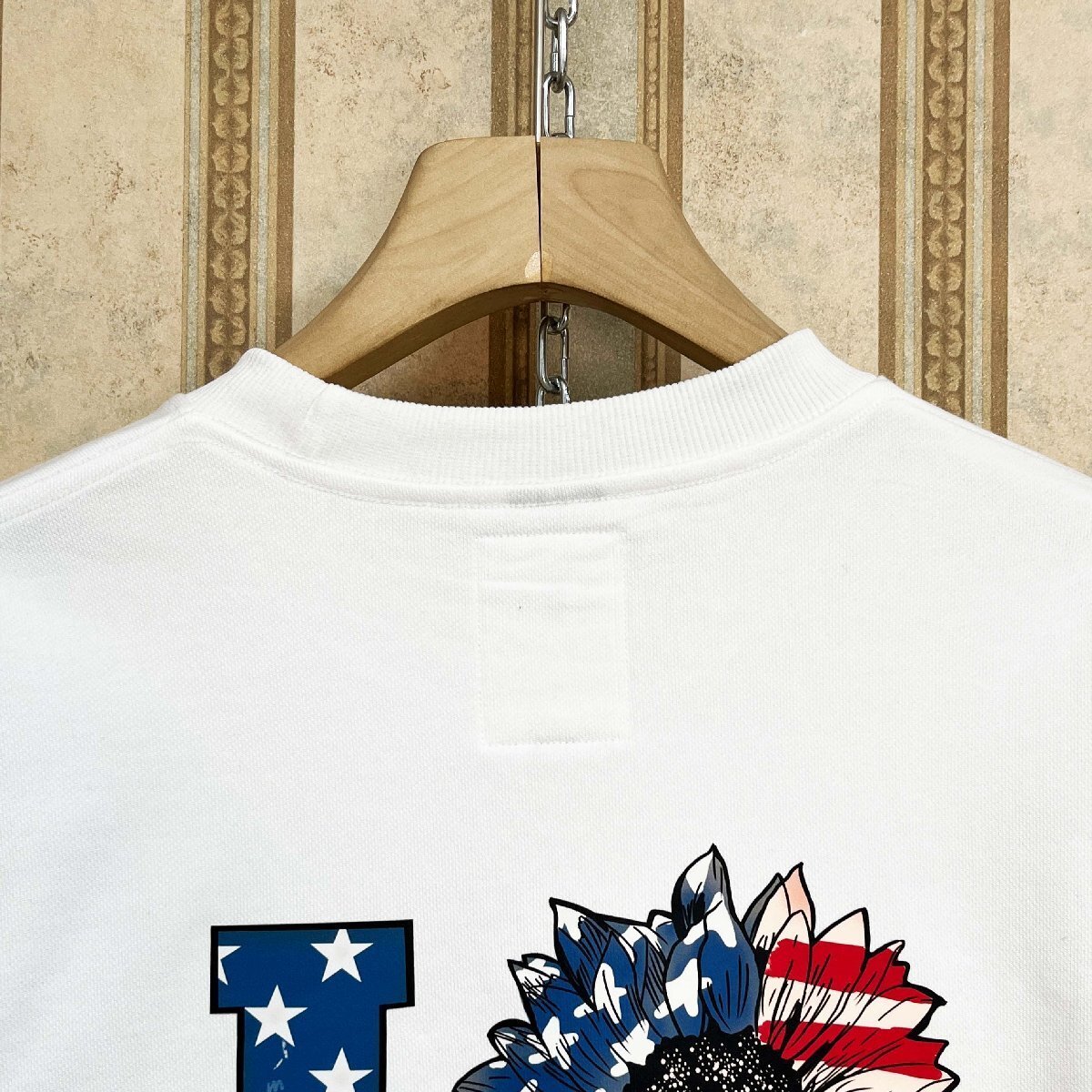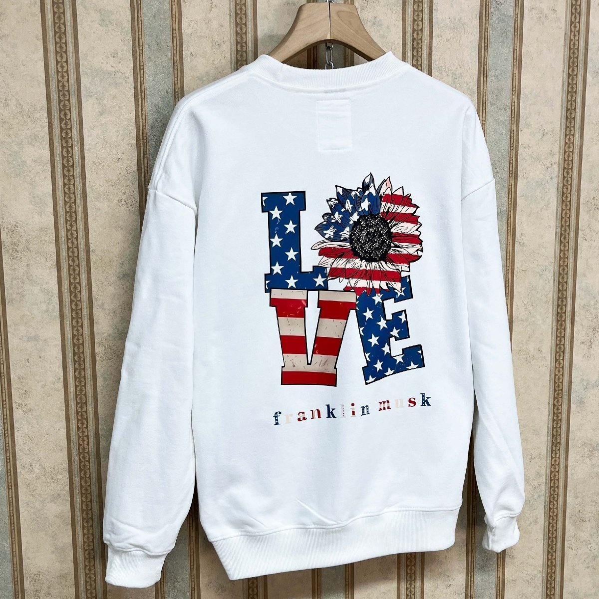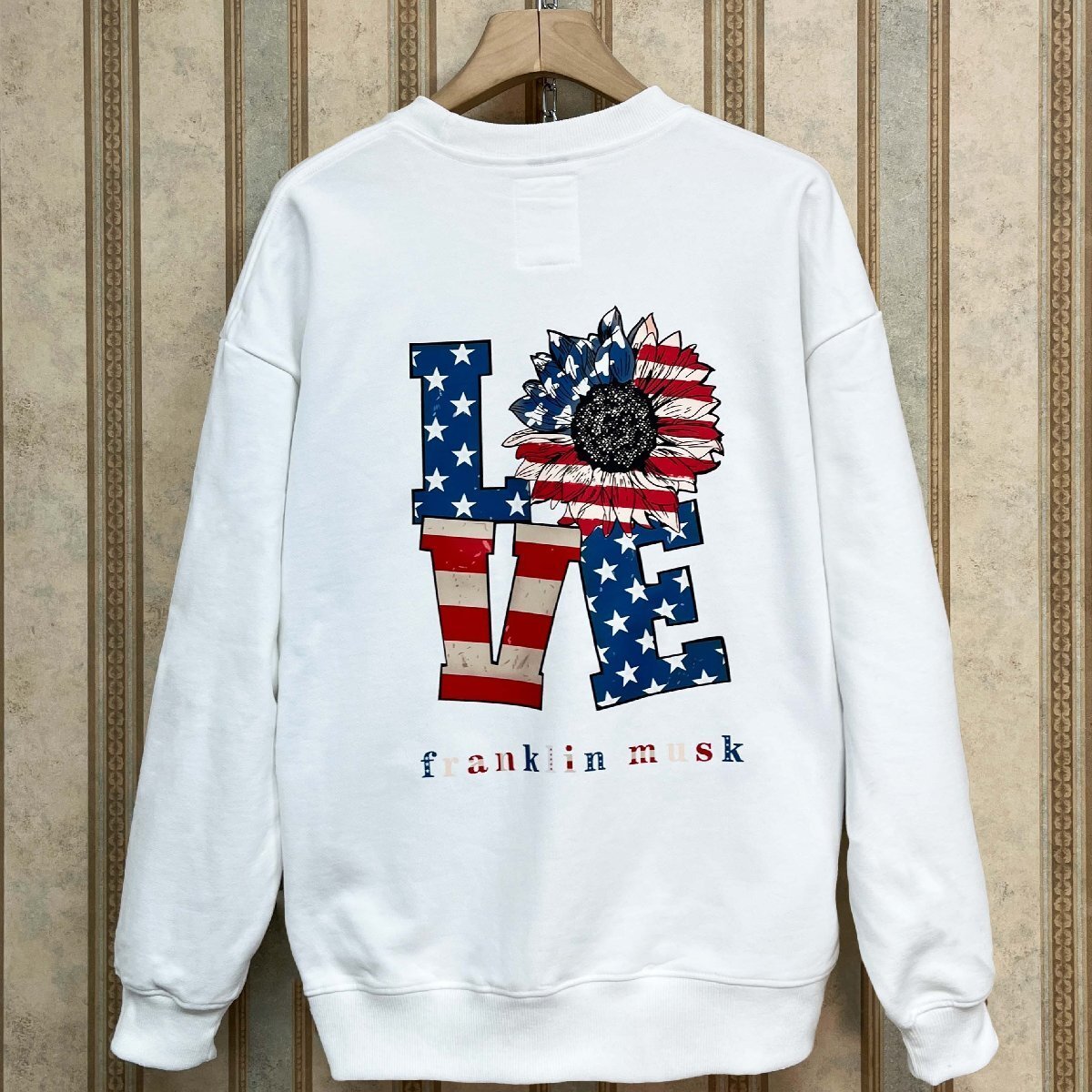 ゆったりとしたクラシックシルエットで体型を選ばず、胸元にさりげなく配置された英文がアクセントに。背面には“LOVE”の文字と、アメリカ国旗、ひまわりのモチーフを組み合わせたデザインが描かれています。自由と希望を象徴する一着です。一枚で二つの表情を楽しめる逸品です。