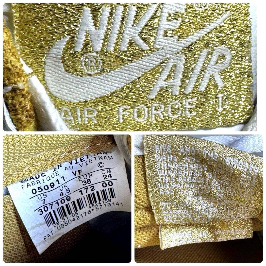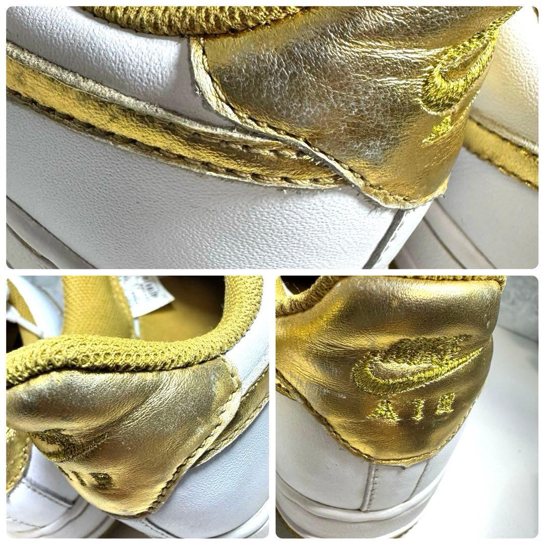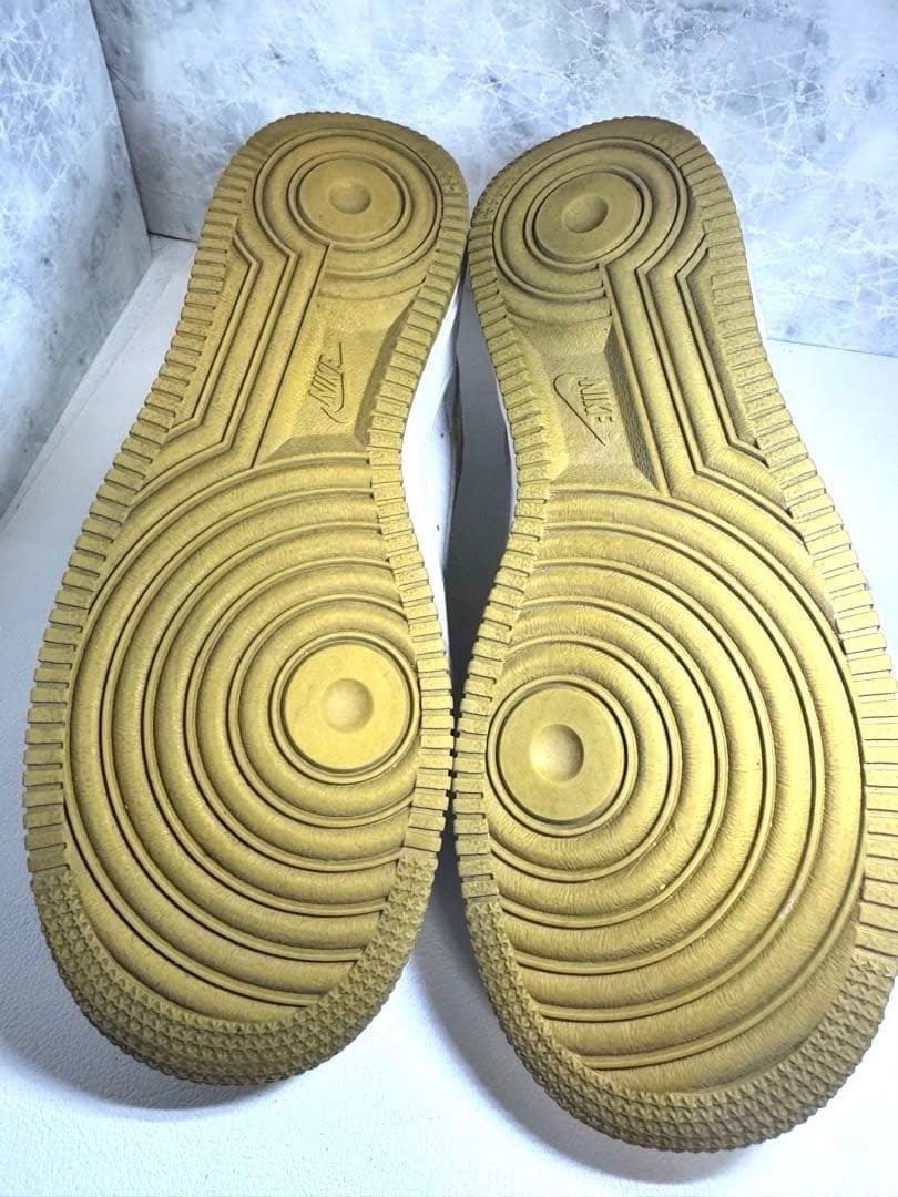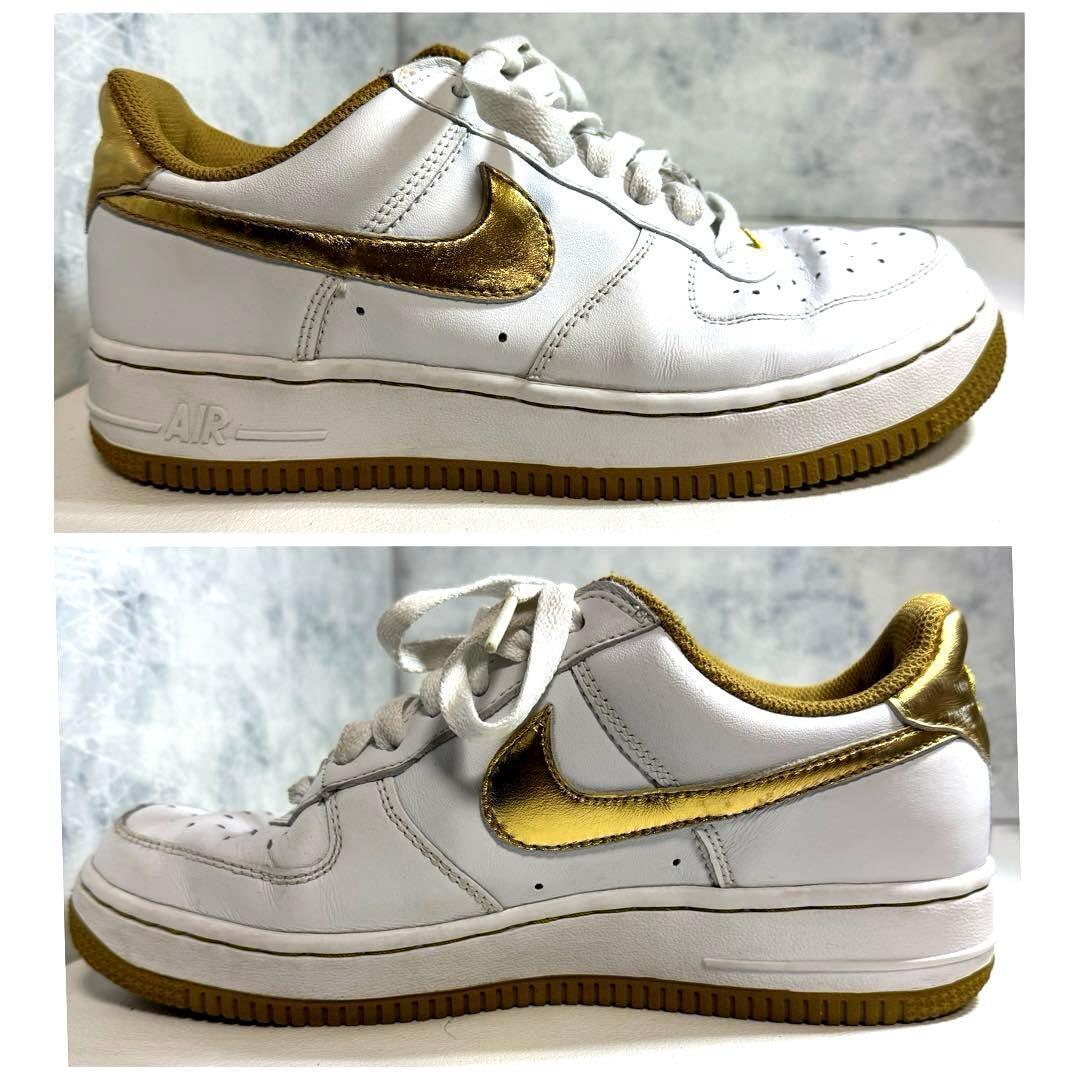 NIKEの定番モデル「AIR FORCE 1」ホワイト×ゴールドの24cmです。普段使いでの使用感はありますが、表面は比較的キレイで雰囲気の良い1足。ゴールドの刺繍やタンのロゴがアクセントになっており、カジュアル〜ストリートまで合わせやすいです。箱(ダメージあり)をおまけでお付けします。写真で状態をご確認の上ご検討ください。