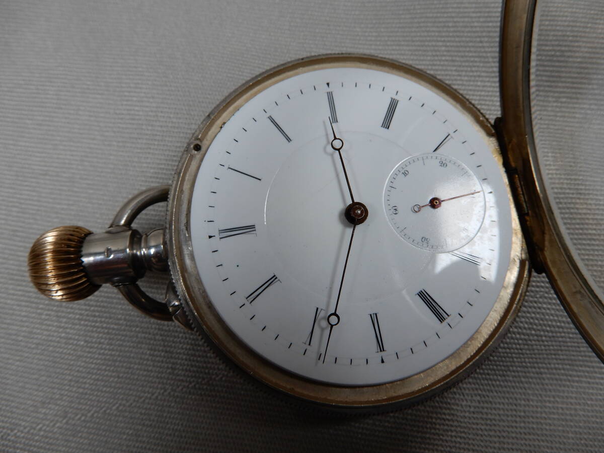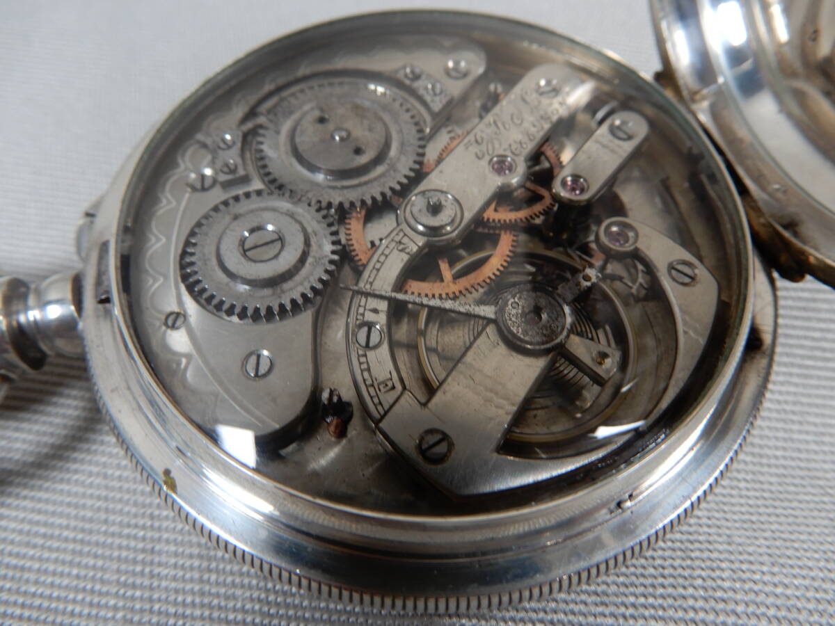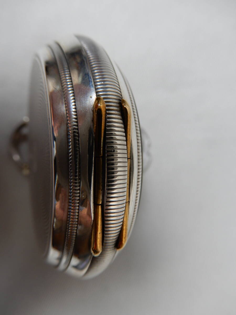 ■ケース;銀無垢のオリジナルケースは、多少の小さな小傷等はありますが、目立つ傷等はなく綺麗です。裏蓋は竜頭を押すとバネの力で90度以内にきちっと開きます。ガラス風防は、キズも少なく綺麗です。風防と裏蓋の丁番は材質は不明ですが綺麗な金色が使われています。そのケースの裏蓋内には「獅子印にJ.C. & Co. コロン 56882」と刻印されています。ムーブメントと同一のS/Nですので当初からのオリジナルケースだと思います・なお、状態については個人的な主観になります。また、刻印の読み方に間違いがあるかもしれませんので、写真での確認をお願いいたします。あくまで写真優先とさせていただきますのでご理解の程お願いいたします。