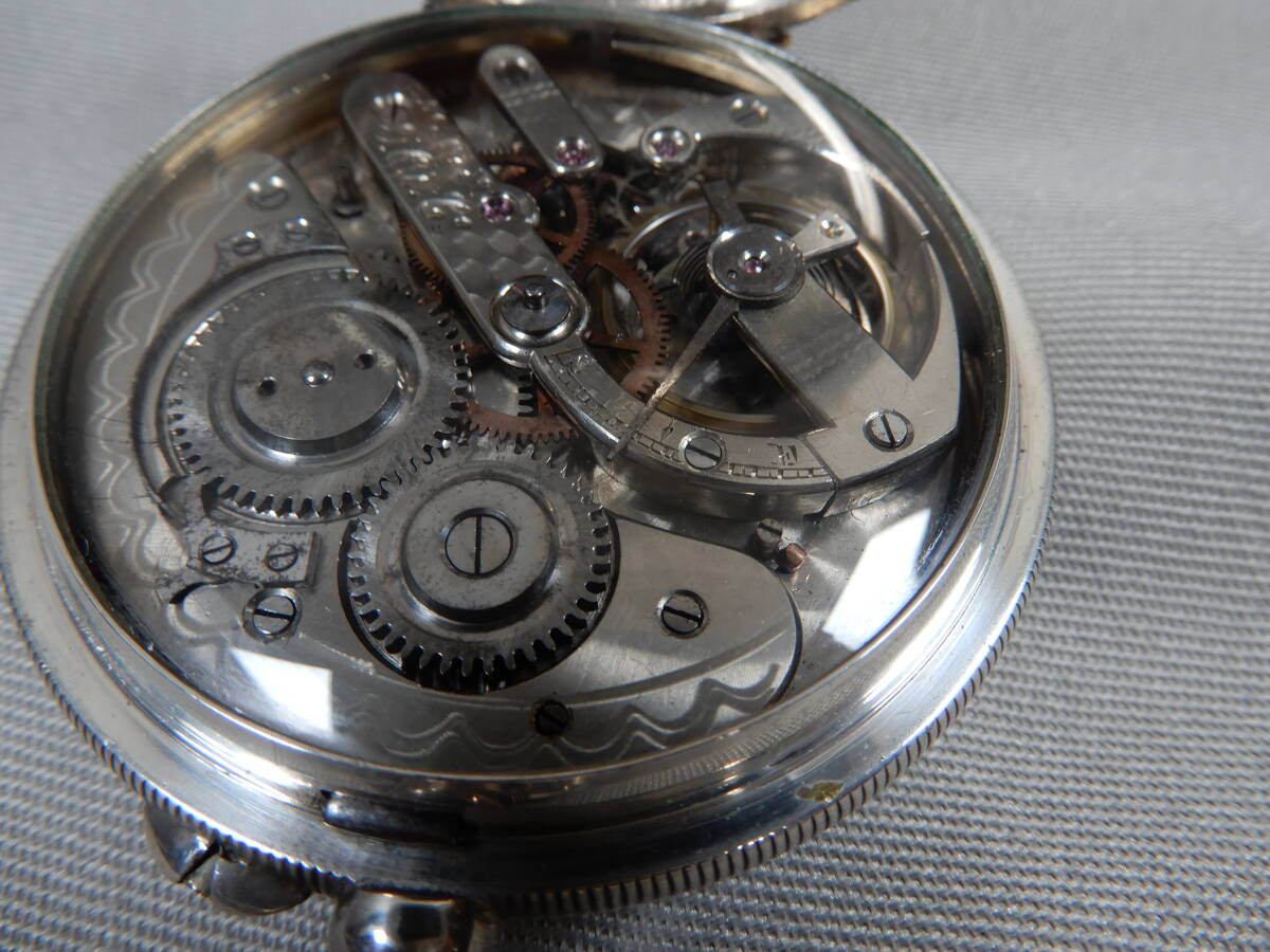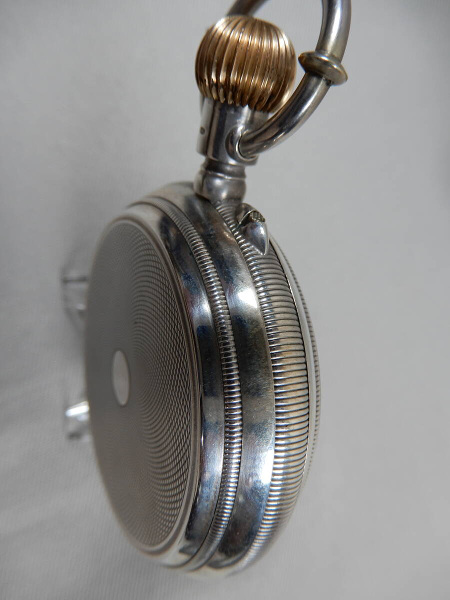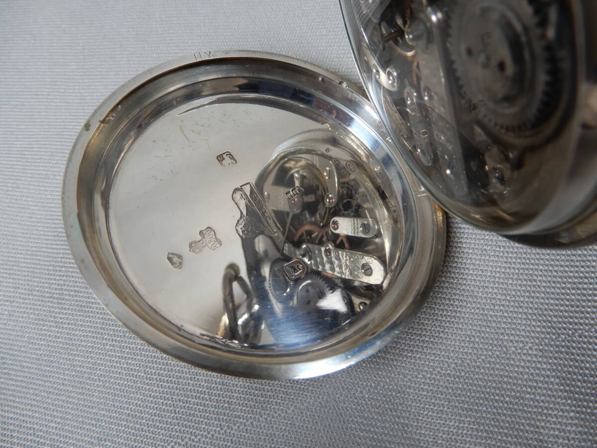■ケース;銀無垢のオリジナルケースは、多少の小さな小傷等はありますが、目立つ傷等はなく綺麗です。裏蓋は竜頭を押すとバネの力で90度以内にきちっと開きます。ガラス風防は、キズも少なく綺麗です。風防と裏蓋の丁番は材質は不明ですが綺麗な金色が使われています。そのケースの裏蓋内には「獅子印にJ.C. & Co. コロン 56882」と刻印されています。ムーブメントと同一のS/Nですので当初からのオリジナルケースだと思います・なお、状態については個人的な主観になります。また、刻印の読み方に間違いがあるかもしれませんので、写真での確認をお願いいたします。あくまで写真優先とさせていただきますのでご理解の程お願いいたします。