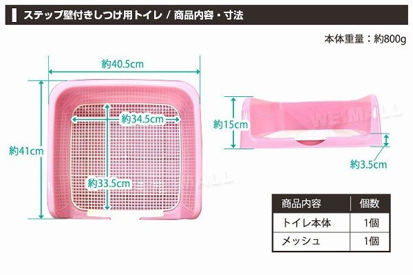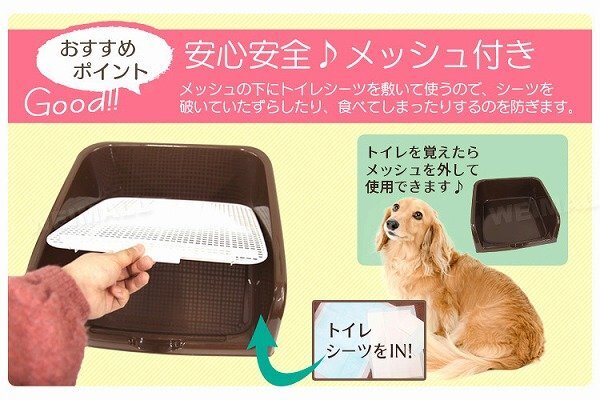 子犬がトイレをおぼえやすい囲い付きタイプ。 壁付きなのでトイレのしつけがしやすく、おしっこの飛び散りや漏れを抑えます。 メッシュを外すことができ、簡単にシーツの交換ができます。 トイレトレーニングが終われば、メッシュを外して通常のトイレとして使用することができます。 プラスチック製なので、水洗いできてお手入れ簡単です。 【商品仕様】 対象:超小型犬、小型犬 カラー:ブラウン サイズ(約):幅40.5×奥行41×高さ15cm 重量(約):800g 材質:ポリプロピレン |