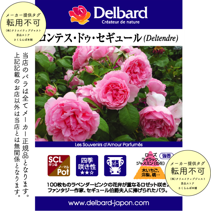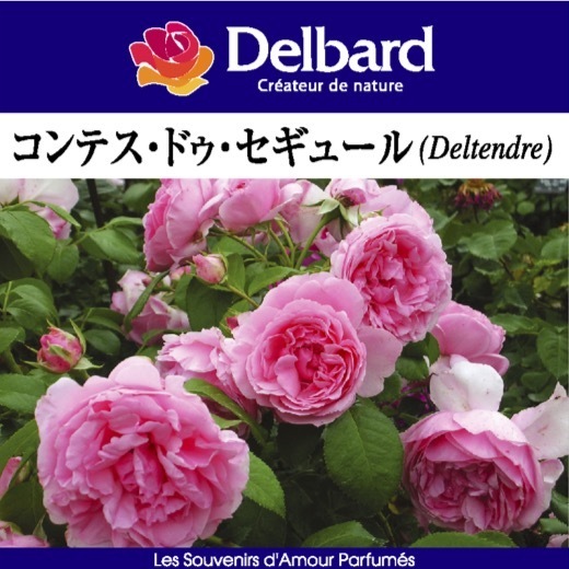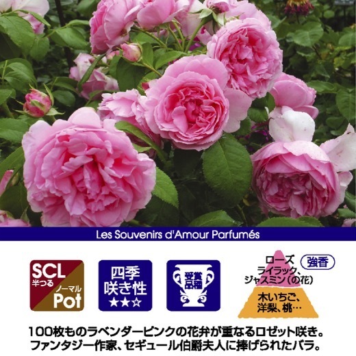 ラベンダーピンクの花弁が重なるロゼット咲き。しなやかに伸びた枝の先に房咲きでたわわに咲く。耐病性が強く花傷みも少ない。繰り返し良く咲く。ローズの香りに、ベースはフランボワーズなどフルーツ香。ファンタジー作家、セギュール伯爵夫人に捧げられたバラ。