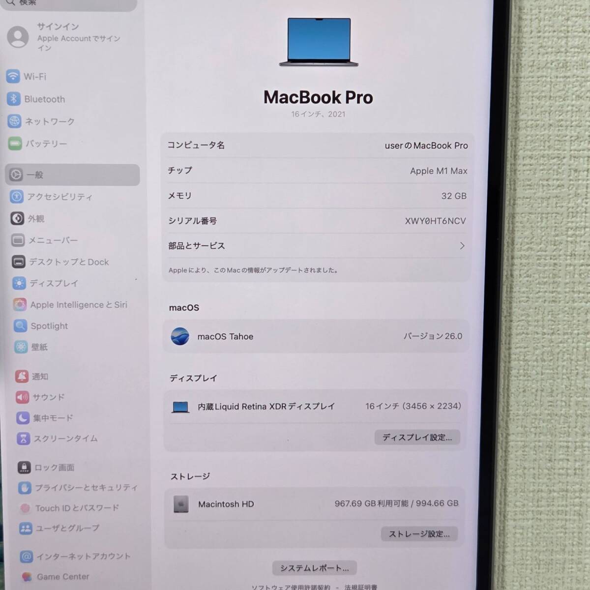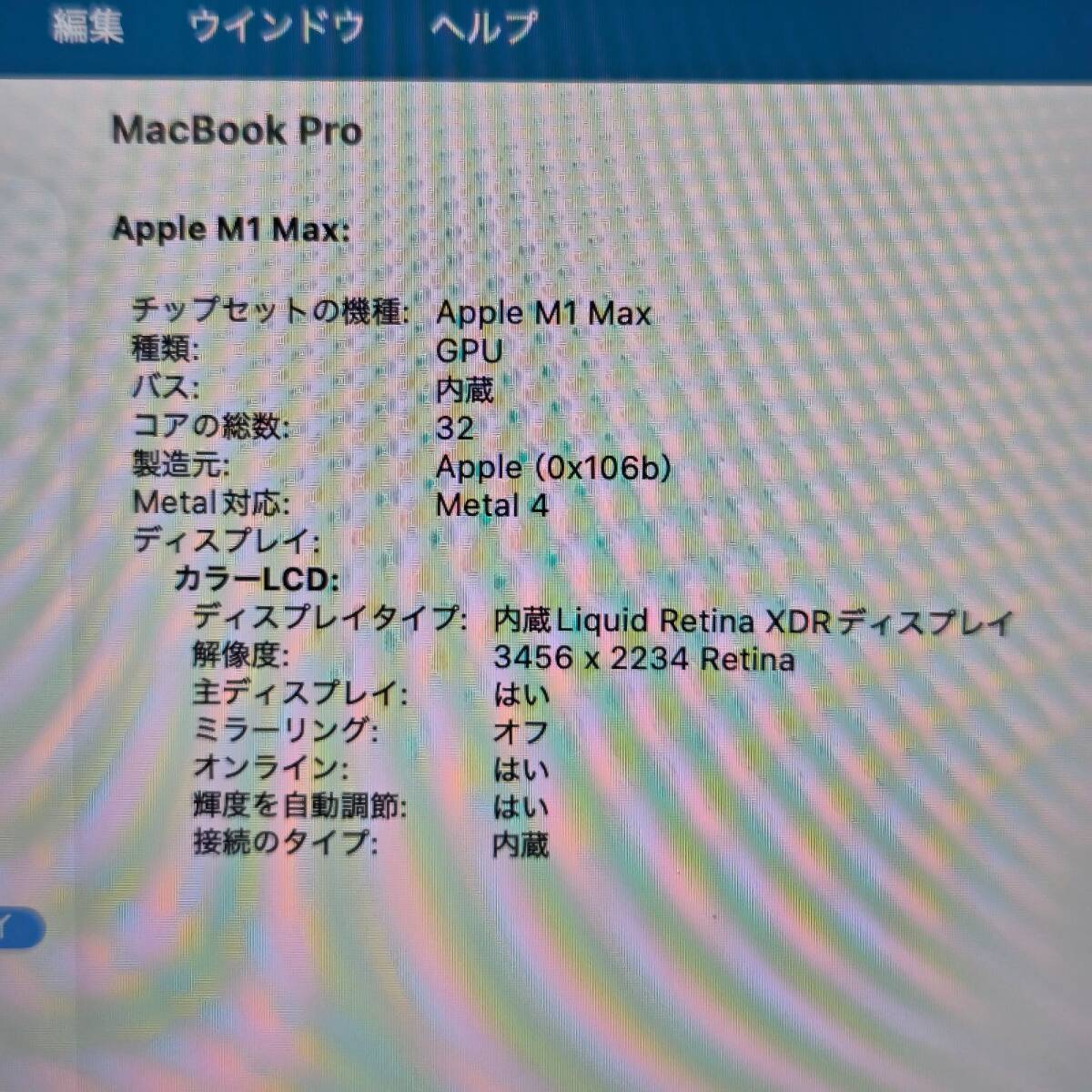 Appleシリコン上位モデル「M1 Max」搭載の16インチMacBook Proです。GPU32コアモデルのため、動画編集・画像処理・3D用途などでも非常に快適に動作します。