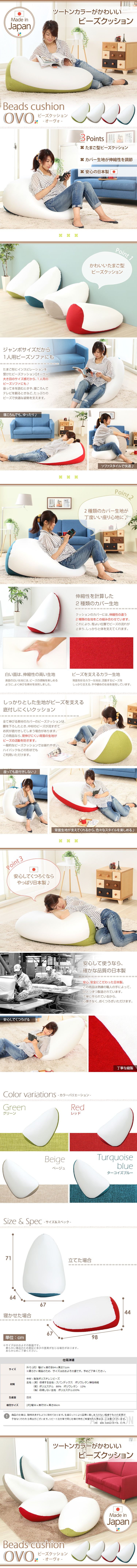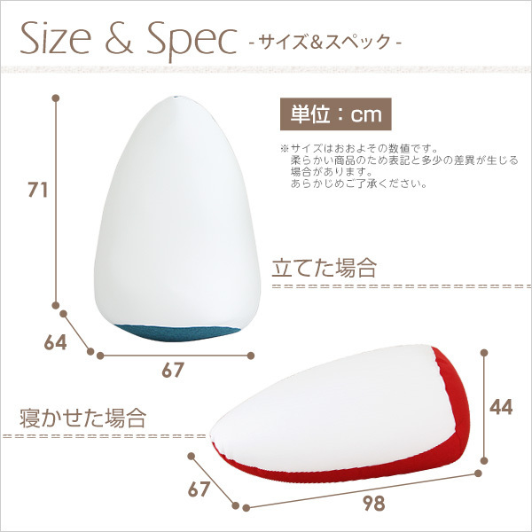 【ポイント】 ツートンカラーがかわいい、たまご型ビーズクッションです。 ジャンボサイズだから、ビーズソファにも♪ 2種のカバー生地が伸縮性を調節! 安心してくつろげる、高品質な日本製です。 カラーは4色展開です。 |