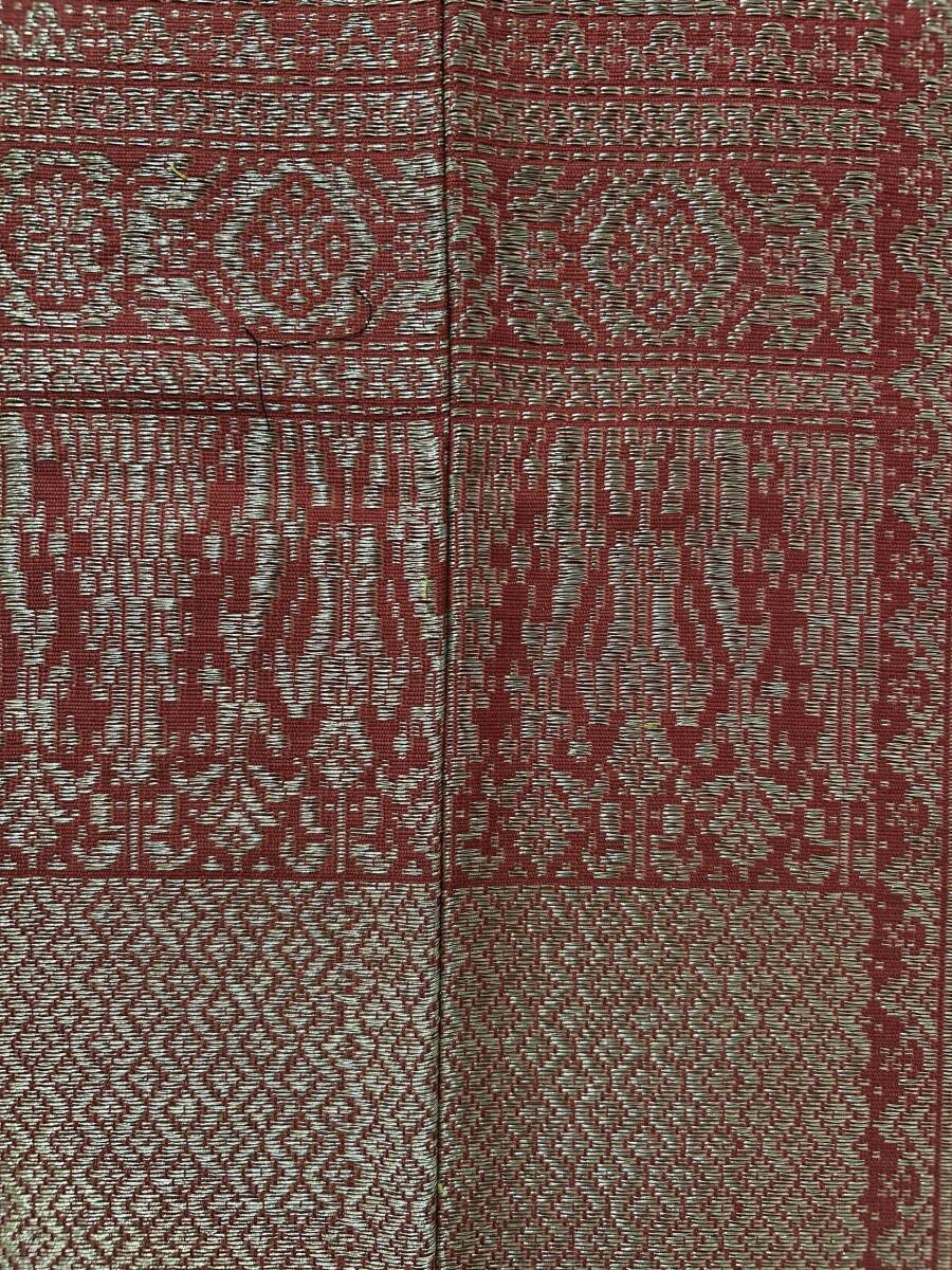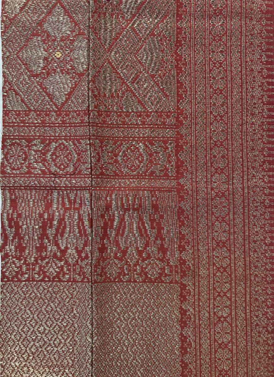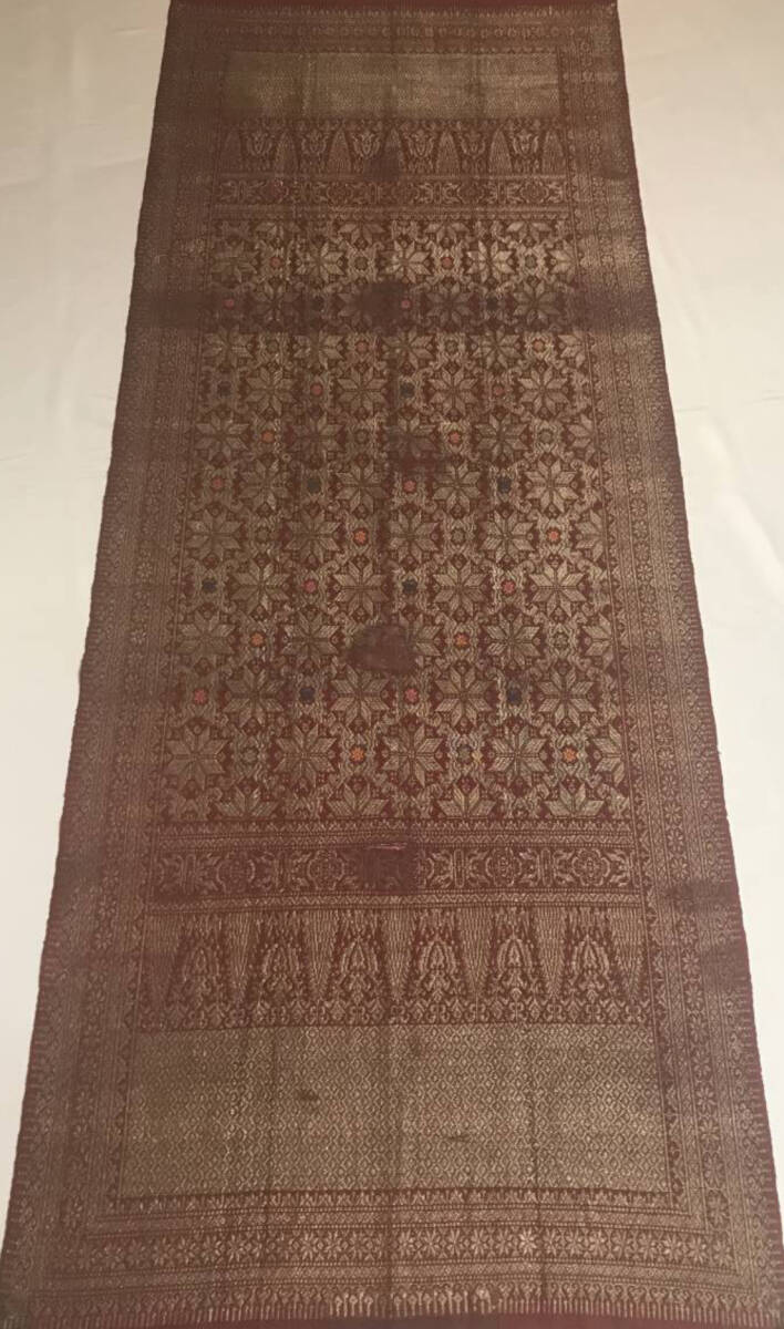 参考資料として持っていた裂です。インドネシア スマトラ島 パレンバンで製作された「ソンケット」と呼ばれる儀礼用布のはぎれです。隙間のないほどびっしりと精緻な浮織がなされた裂ですので、完全な長さで残っていれば、大変高価であったことでしょう。状態の良い部分が取られており、いざ探してもなかなか無い裂ですので、大変リーズナブルかと思います。