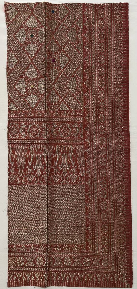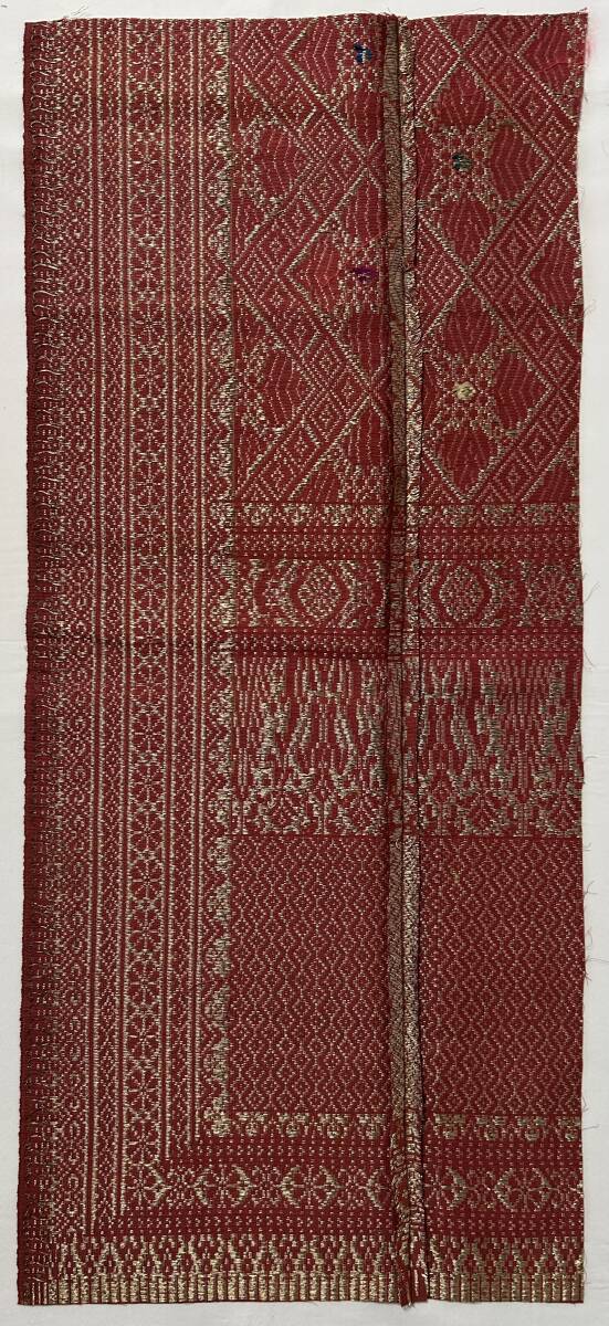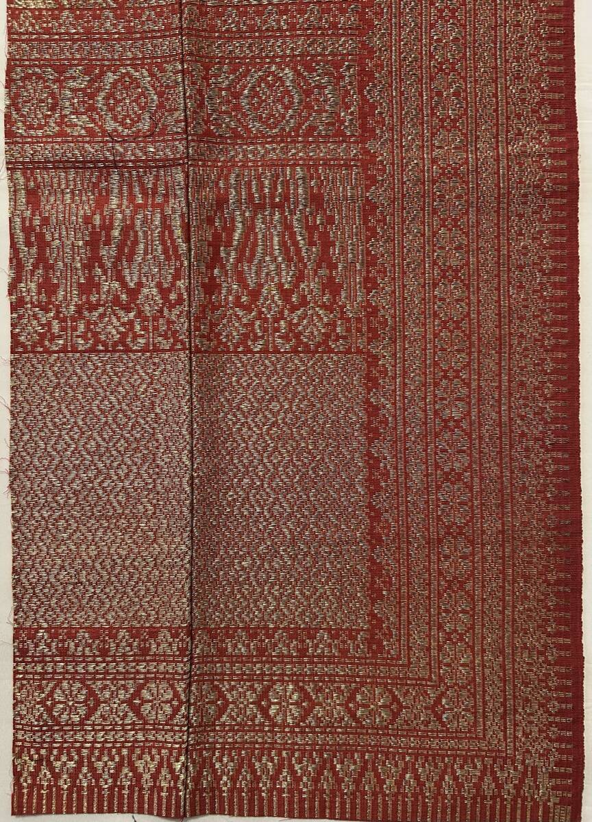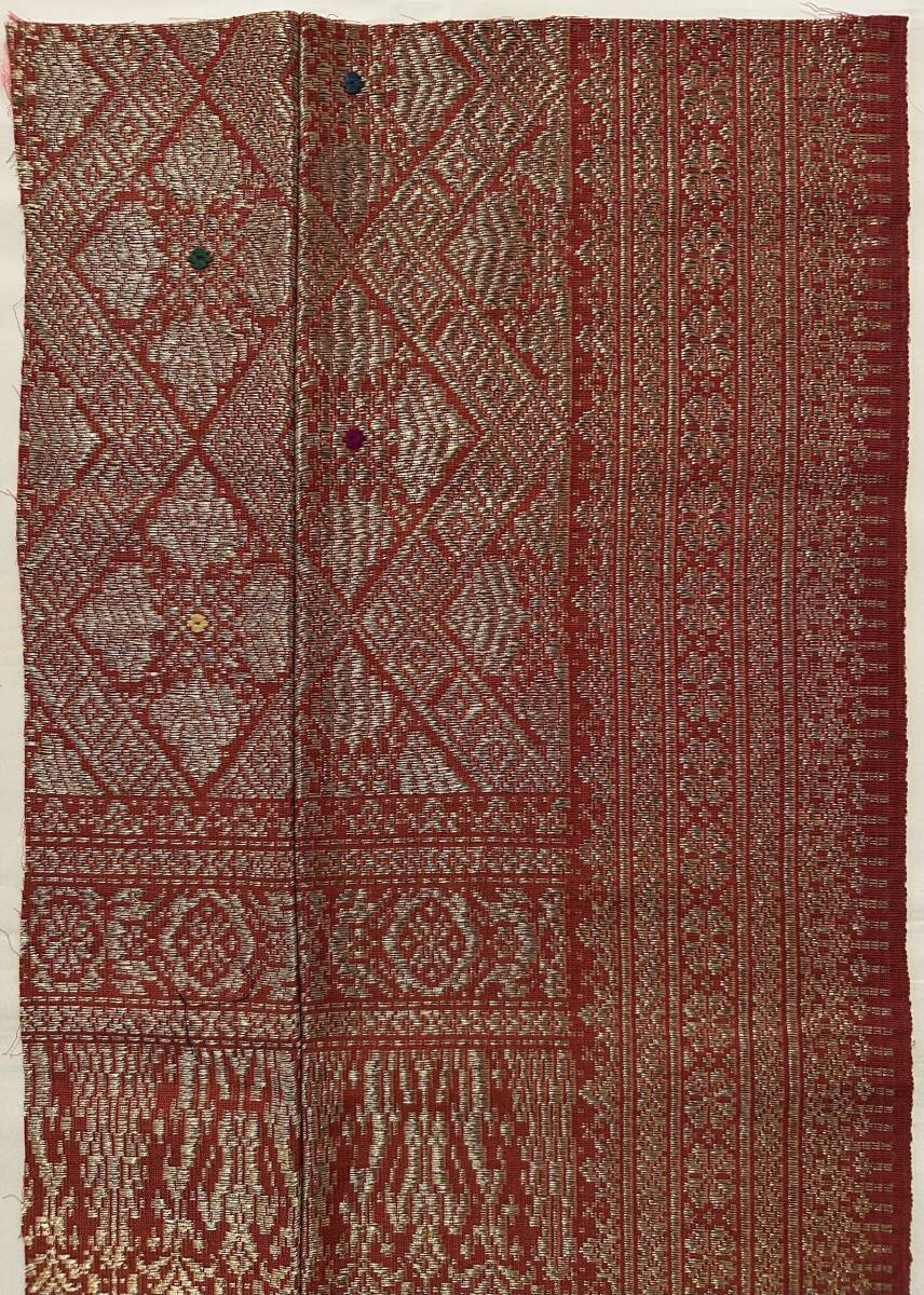 参考資料として持っていた裂です。インドネシア スマトラ島 パレンバンで製作された「ソンケット」と呼ばれる儀礼用布のはぎれです。隙間のないほどびっしりと精緻な浮織がなされた裂ですので、完全な長さで残っていれば、大変高価であったことでしょう。状態の良い部分が取られており、いざ探してもなかなか無い裂ですので、大変リーズナブルかと思います。