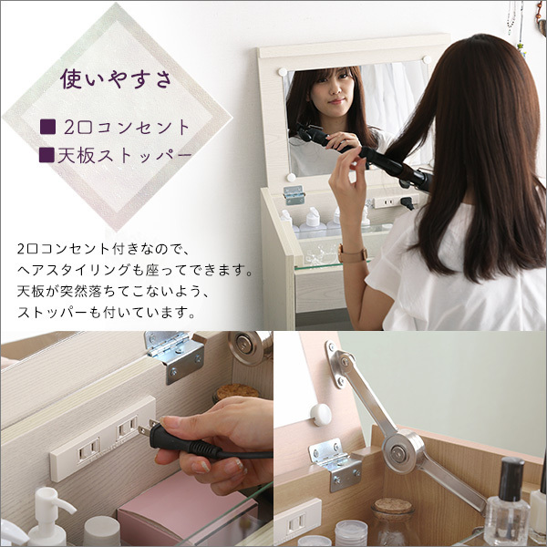 その上、スツールとコンセント付きなので、その場でサッとお支度OK!