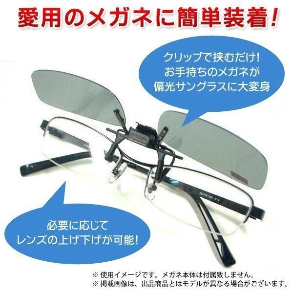 | 特長 | クリップをつまんで、お手持ちのメガネをはさみます。 レンズを下ろすだけで普通のメガネからサングラスに変えることができます。 素早く取り付けられ、簡単に使用できます。 |