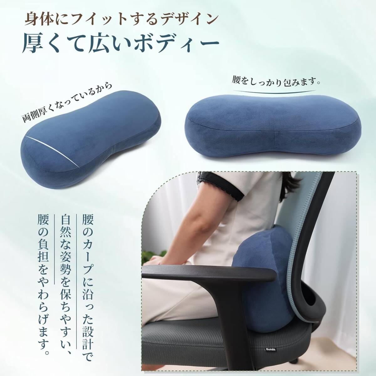 • 「理想的なサポート」:腰の自然なカーブにぴったりフィットする設計。背骨の正しい姿勢を保ち、腰への負担をしっかり軽減します。デスクワークや運転時の辛さを和らげます。