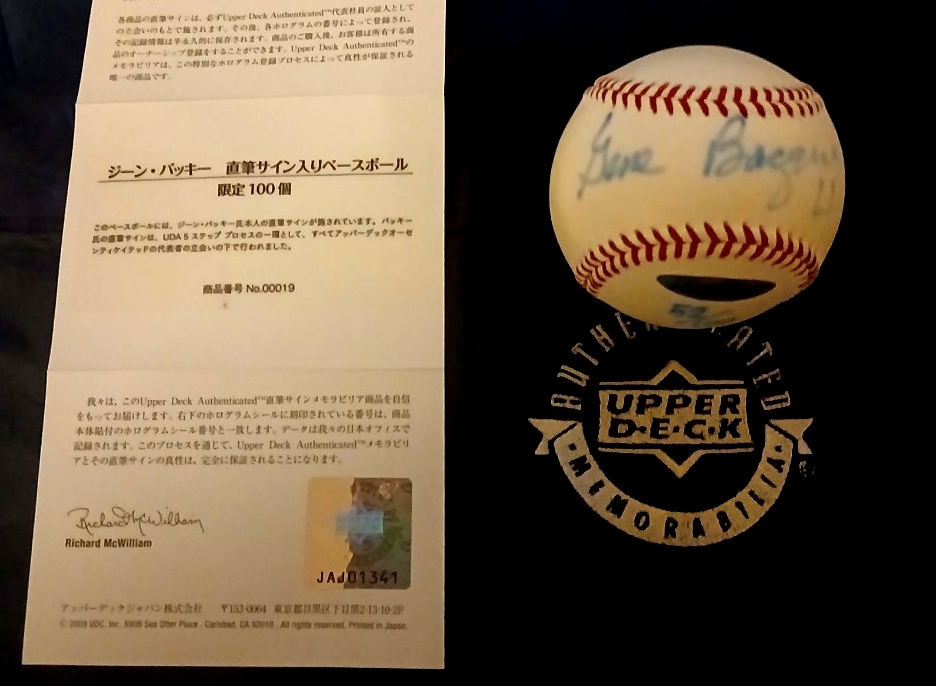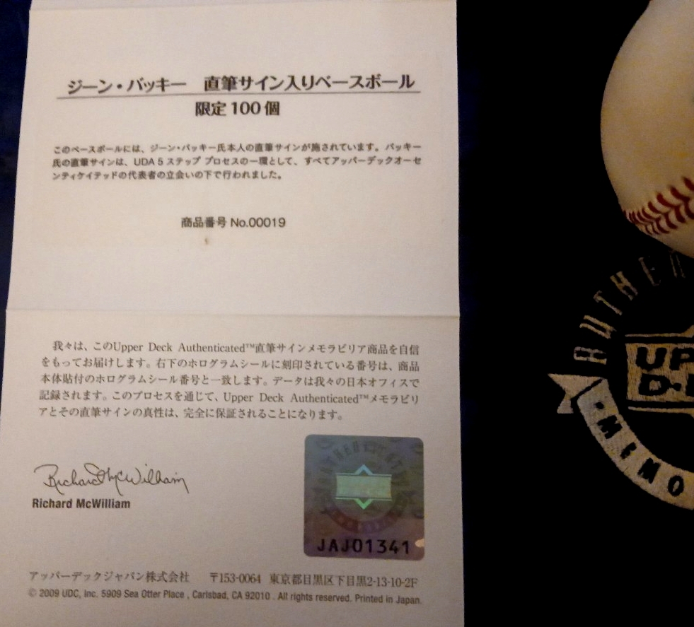 阪神タイガース ジーン・バッキー 直筆サインボール (Upper Deck社 のホログラム・袋・箱付、登録票は無し)