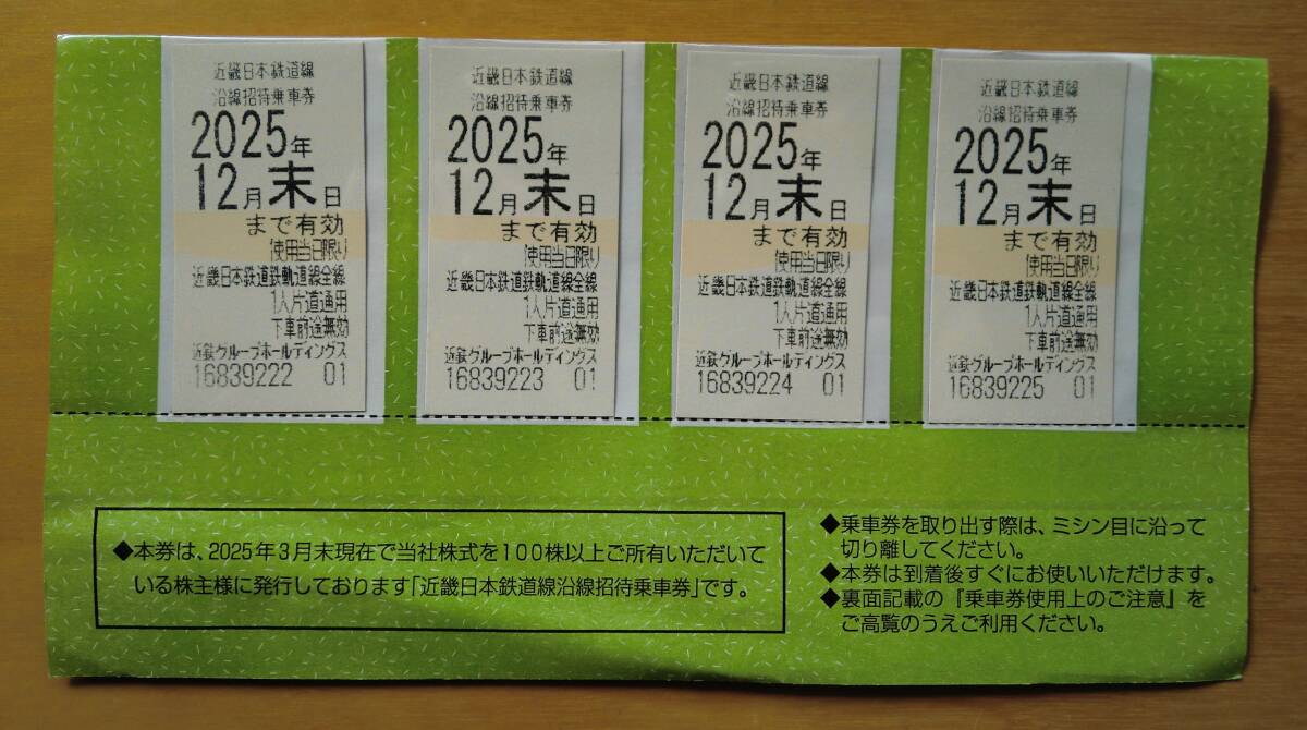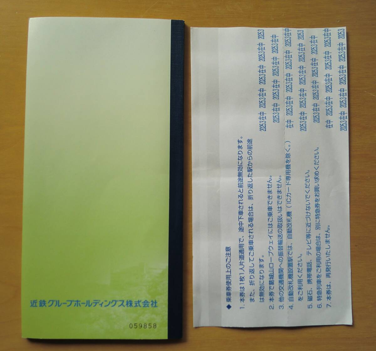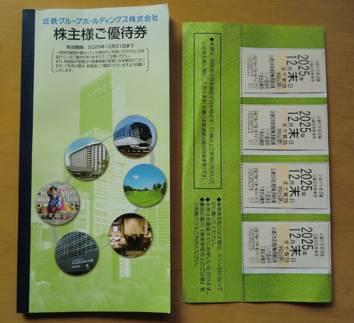| 近畿日本鉄道・近鉄グループホールディングス(株)「株主優待乗車券 4枚+株主優待券 1冊」セット 未使用です。 優待乗車券の有効期限は2025年12月末日までになります。 株主優待券冊子の有効期限は2025年12月31日までになります。 商品の発送はスマートレターに限り、当方にて送料を負担します。(追跡・保障とも無し) 但し、万が一配達事故等が発生した場合、落札代金等の補償は一切行えませんのでご了承下さい。 そのほかの発送方法をご希望の場合は、送料をご負担いただければ対応可能です。 落札されましたときにゆうパック・レターパック(プラス・ライト)・スマートレターから選んでください。 その他の発送方法はご相談ください。 何か不明な点がございましたら、お気軽にお尋ねください。 完璧を求められる方はご遠慮ください。 安値での出品とさせていただきますので、よろしくお願いします。 最近、イタズラ入札・入金をされない等がかなり多いし使用期間が短いので、落札のご連絡の発信後、12時間以内のご連絡、 またそのあとのご入金のご案内のご連絡の発信後、24時間以内のご入金が無ければ 落札者の都合扱いでキャンセルとさせていただきます。 その場合、非常に悪いの評価が付きますのでご了承・ご理解ください。 新規の方・5以上悪い評価のある方のご入札は固くお断り致します。 万が一落札した場合でも、落札者都合で取り消す場合がありますのでご了承ください。 どうしてもご入札したい方は、事前に質問欄よりご相談下さい。 申し訳ありませんが、ご了承・ご理解・ご協力ください。 よろしくお願いします。 | |