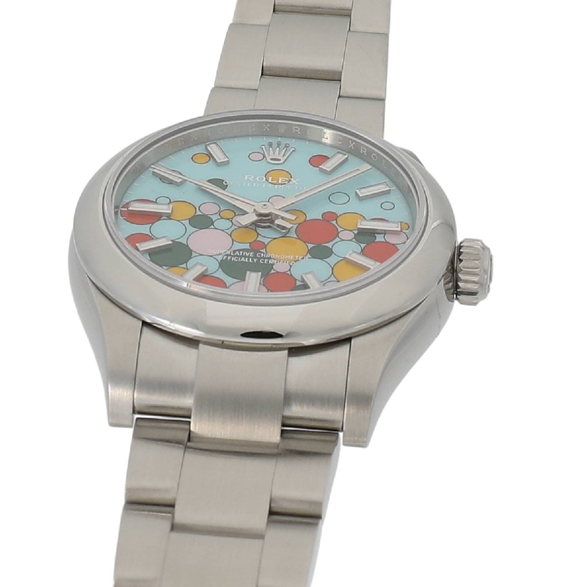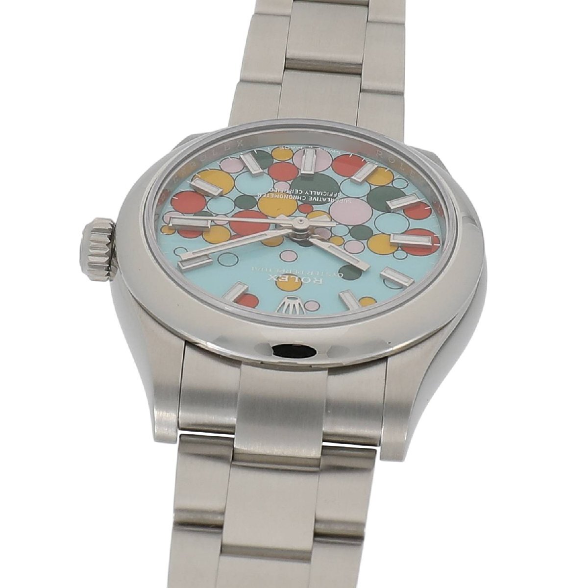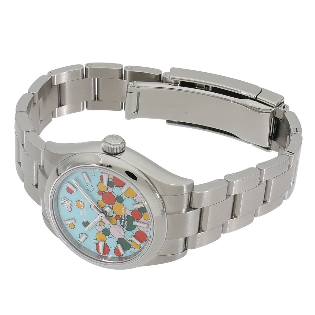 | モデルについて | 2023年の新作 デイト表示を持たない最もシンプルなオイスターパーペチュアル。防水=オイスターと自動巻き=パーペチュアルをモデル名とし、まさにロレックスの原点とも言えるモデルです。ターコイズブルーをベースに黒いフチ取りが施されたコーラルレッド、キャンディピンク、グリーン、イエローのバブル状のドット柄を文字盤に敷き詰めた、ロレックスとしては珍しいポップで華やかな印象を放つセレブレーションダイヤルです。31mmと少し大きめな時計を好まれる女性にお勧めしたいモデルです。手首周りが細めの男性にもおススメ出来ます。 |