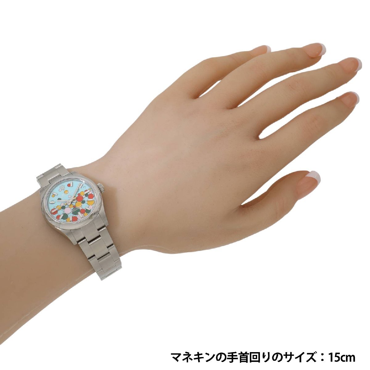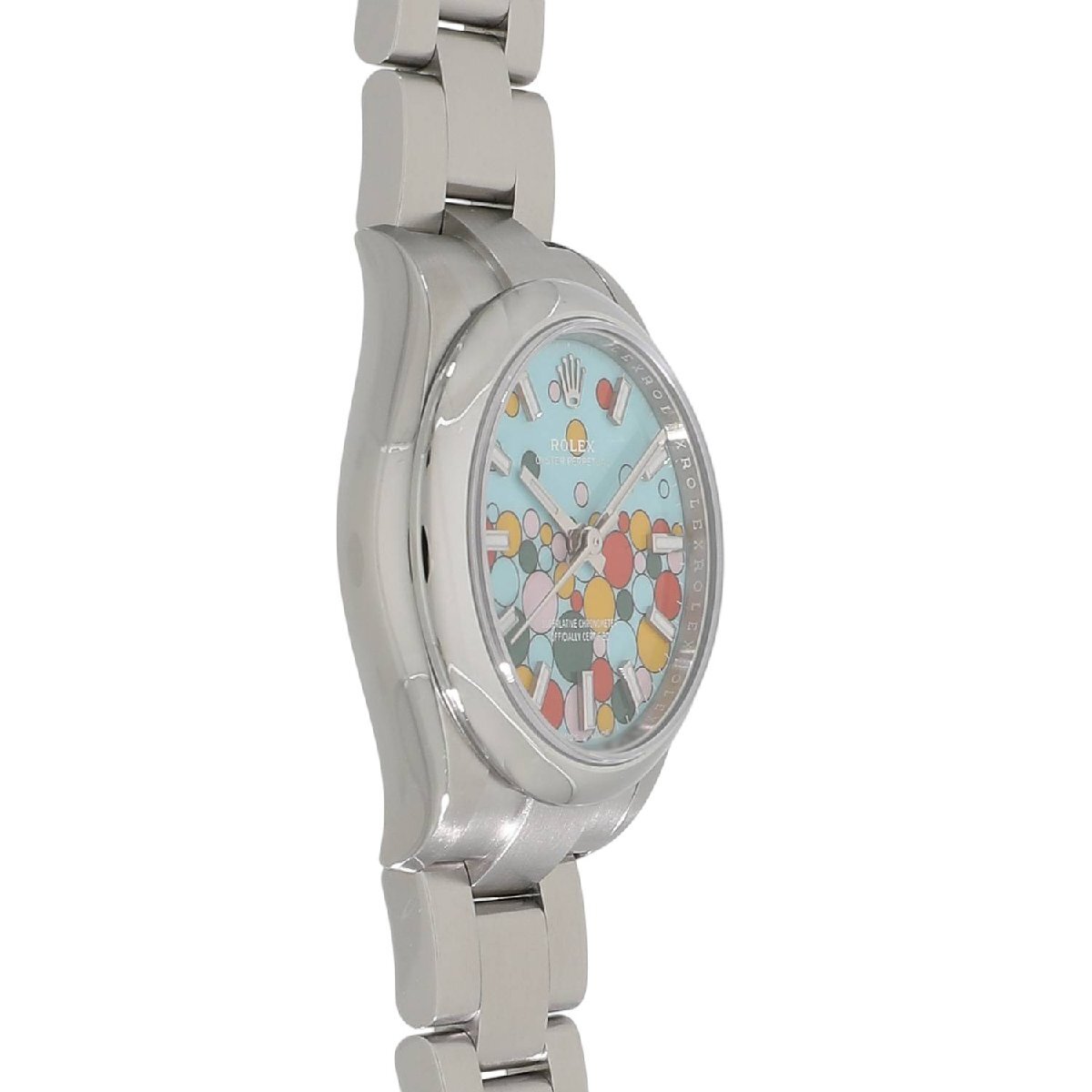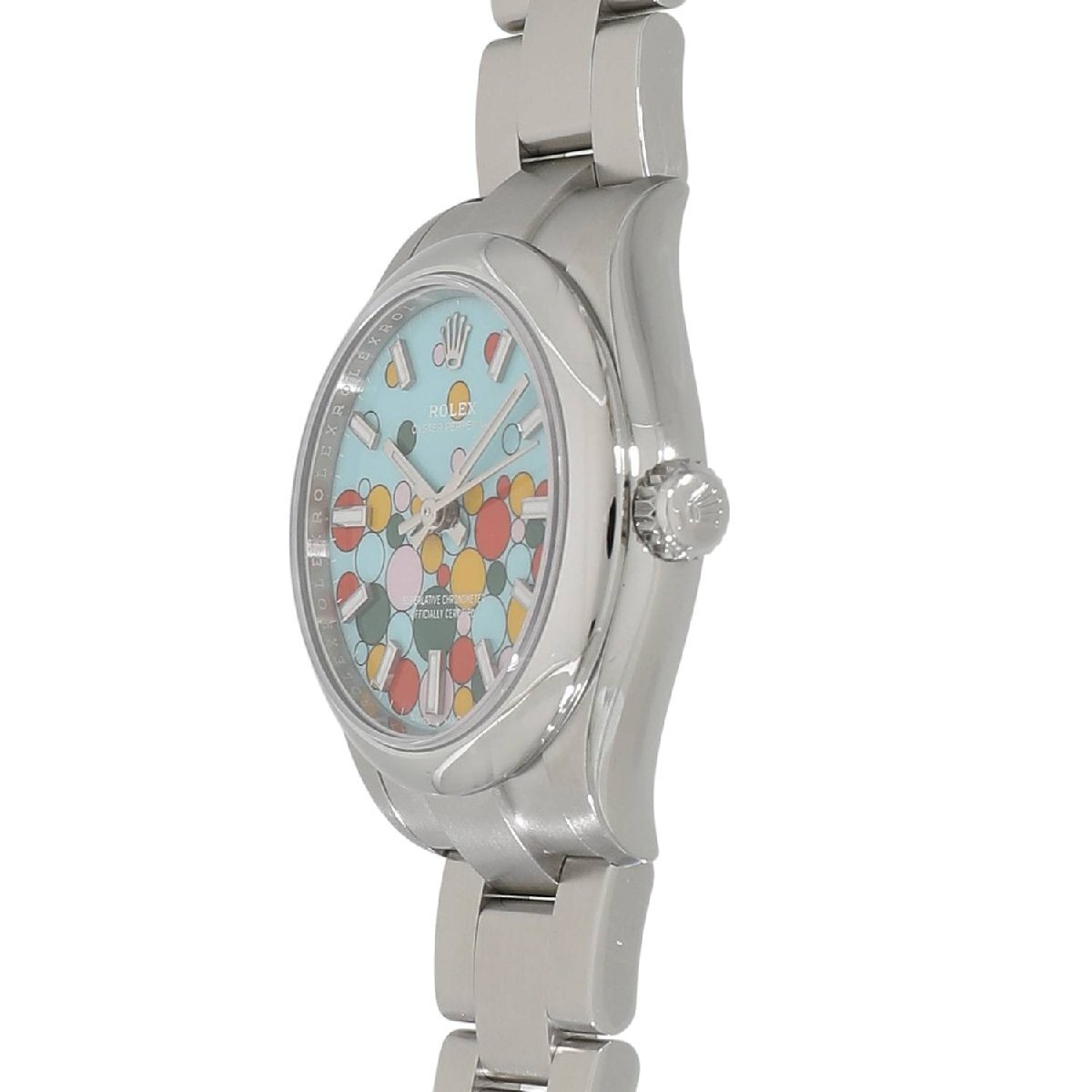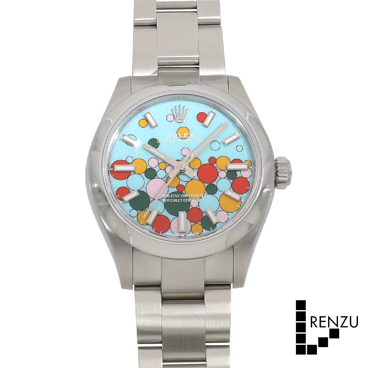 | モデルについて | 2023年の新作 デイト表示を持たない最もシンプルなオイスターパーペチュアル。防水=オイスターと自動巻き=パーペチュアルをモデル名とし、まさにロレックスの原点とも言えるモデルです。ターコイズブルーをベースに黒いフチ取りが施されたコーラルレッド、キャンディピンク、グリーン、イエローのバブル状のドット柄を文字盤に敷き詰めた、ロレックスとしては珍しいポップで華やかな印象を放つセレブレーションダイヤルです。31mmと少し大きめな時計を好まれる女性にお勧めしたいモデルです。手首周りが細めの男性にもおススメ出来ます。 |