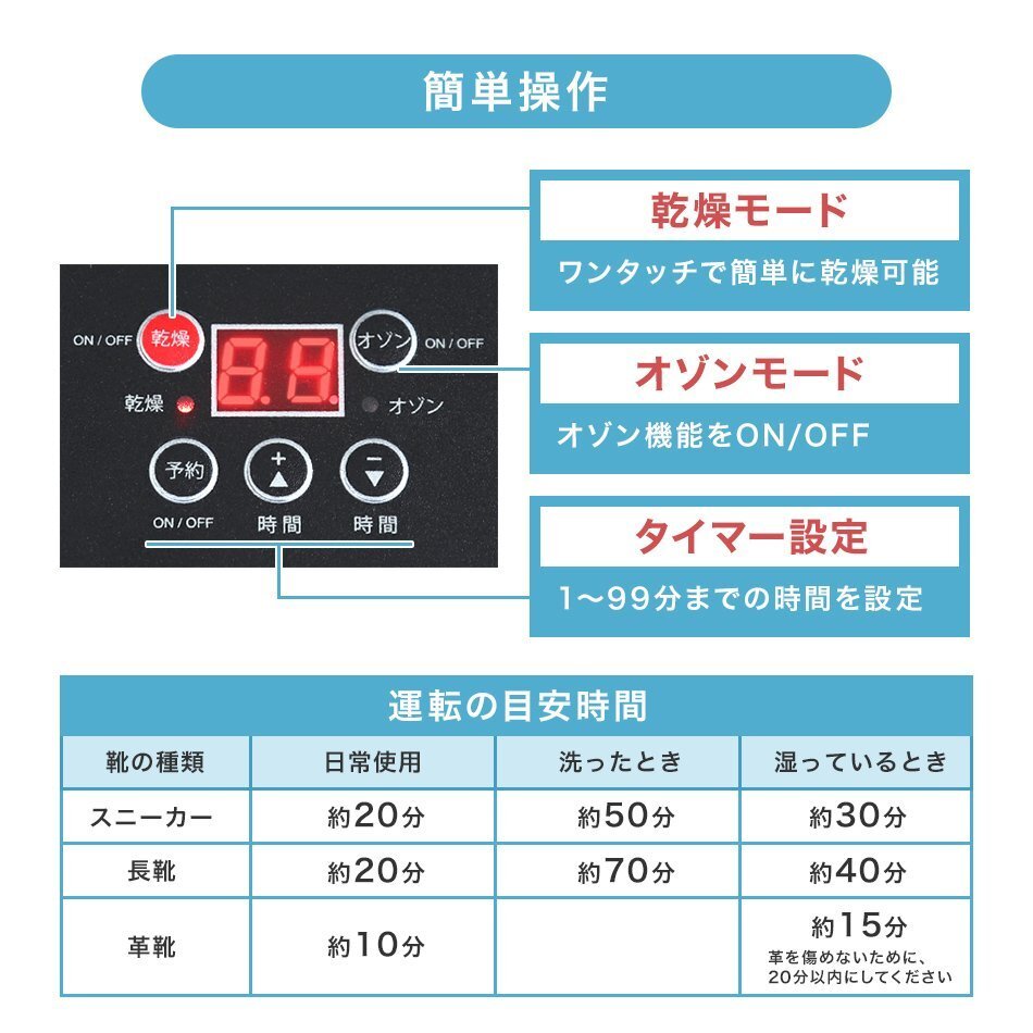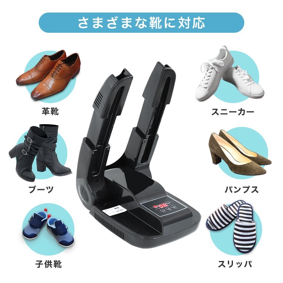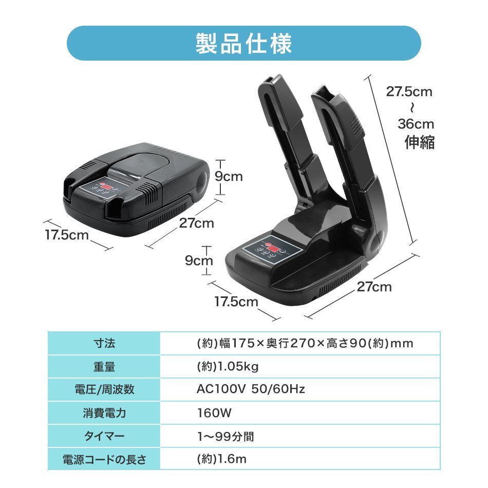 いつでも清潔で気持ちよく! オゾンの力で除菌・消臭!くつ乾燥機です。 オゾンを含んだ乾燥風が、ニオイ物質や菌類を無害化! 乾燥後の蒸れやニオイも気になりません♪ スニーカー・子ども靴・長靴・ブーツ・革靴など… さまざまな靴に対応! 最大99分のタイマー機能付きだから、忙しい時も安心! 使わないときは折りたたんで、超コンパクトに収納できます。 商品コード:FTD001BK ■商品内容 サイズ(約):幅17.5cm×奥行27cm×高さ9cm 重さ(約):1.05kg 電圧/周波数:AC100V 50/60Hz 消費電力:160W コードの長さ(約):1.6m ■保障期間 1年間 ※使用開始時期や使用期間に関わらず、お買い上げ日から1年間です。 ※商品到着後から30日以内に不具合が発生しご連絡をいただいた場合は、初期不良対応として交換の際の往復送料は当店にて負担させていただきます。 30日を過ぎますと、交換の際の往復送料はお客様負担となりますのでご了承ください。 ■注意事項 ※商品は、モニターによって色合いが異なって見える場合があります。 ※仕様・デザインは改良のため予告なく変更することがあります。 【もちろん新品未使用品です】 |