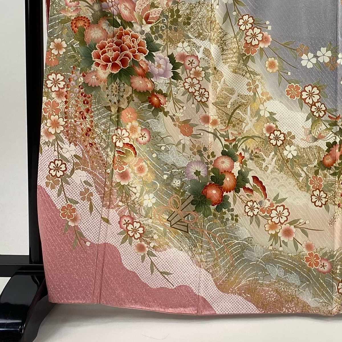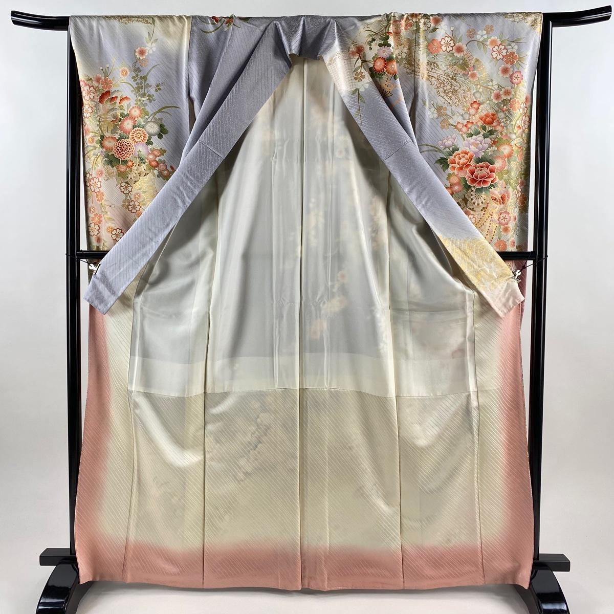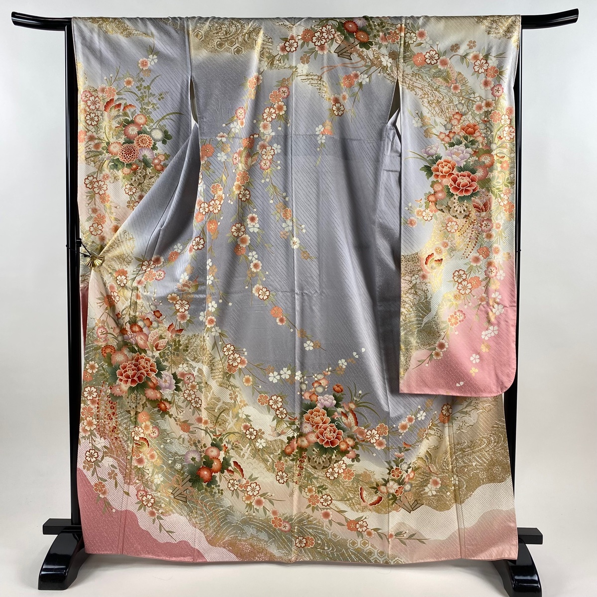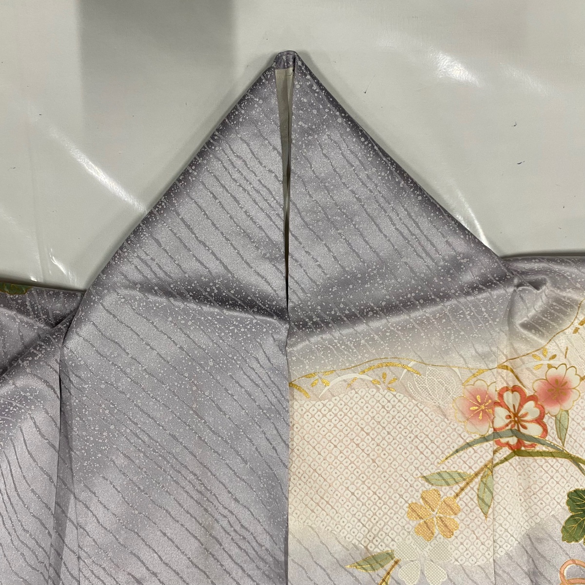 | 振袖 秀品 花車 波 金彩 灰紫 袷 身丈168 裄丈67 M 正絹 【中古】 |