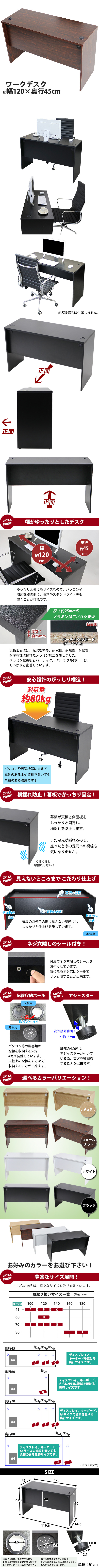 | 商品紹介 | ◆◆ワークデスク◆◆ ■作業スペースをゆったりと確保出来る、ワークデスクです。 ■天板には、メラミン加工を施しています。 ■幕板が天板と側面板をがっちりと固定!横揺れを防止します。 ■ネジ穴隠しのシール付き。 ■天板と幕板に配線収納ホールが2カ所ずつ備わっています。 ■アジャスターで高さの調節が可能です。(高さ調節範囲〜約15mm) ■材質:パーティクル(パーチクル)ボード(メラミン加工)(本体)、プラスチック(アジャスター、配線収納ホール) ■重量:約23kg ■耐荷重:約80kg ※こちらの商品は、組立て式です。組立てにはプラスドライバーが必要です。お客様でご用意下さい。 ※組立図が付属します。 ※カラーはウォールナットとなります。 |