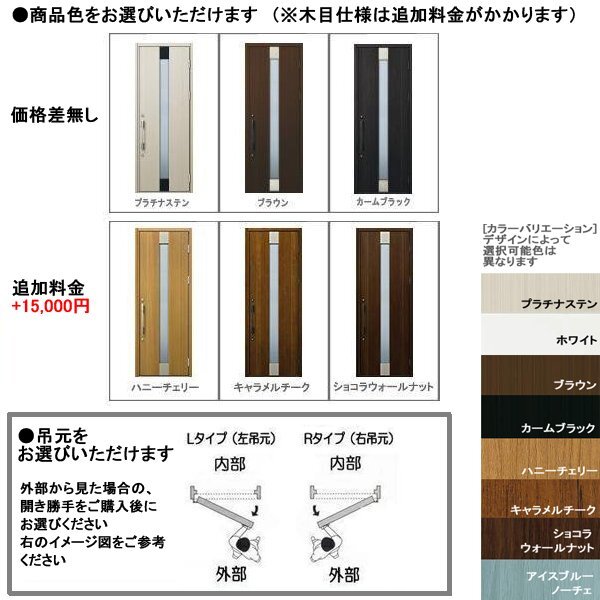 | 商品紹介 | ○ YKKAPのアルミサッシ 玄関ドア プロント S06 片開き 【仕様】 * 断熱D4仕様 * ドアクローザーを標準装備 * ピッキングに強いディンプルキー5本入り、工事用キー3本入りの仕様です ------------------------------------ 【玄関ドア プロント 片開き 選択項目】 ・玄関色 (ハニーチェリー、キャラメルチーク、ショコラウォールナットは、+15.000円です) ・吊元 ・ハンドル種類(手動錠) ロートアイアン調ハンドルは+3.000円) ・アングルの有無 (※有りの場合は、+4.000円) 【オプション】 ・オプション スマートコントロールキー 電気錠又は電池錠 *ピタットキー (+42.000円) *ポケットキー (+66.000円) ・スマートコントロールキー専用ハンドル (洋風カーブハンドルは、+5.000円) ------------------------------------