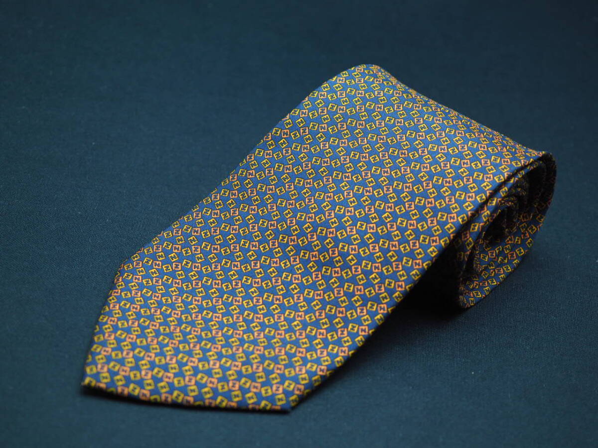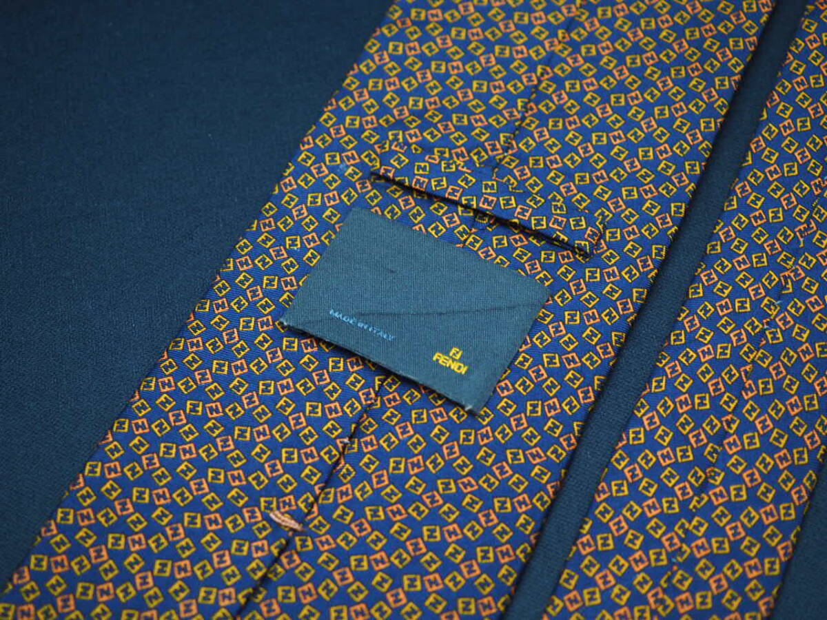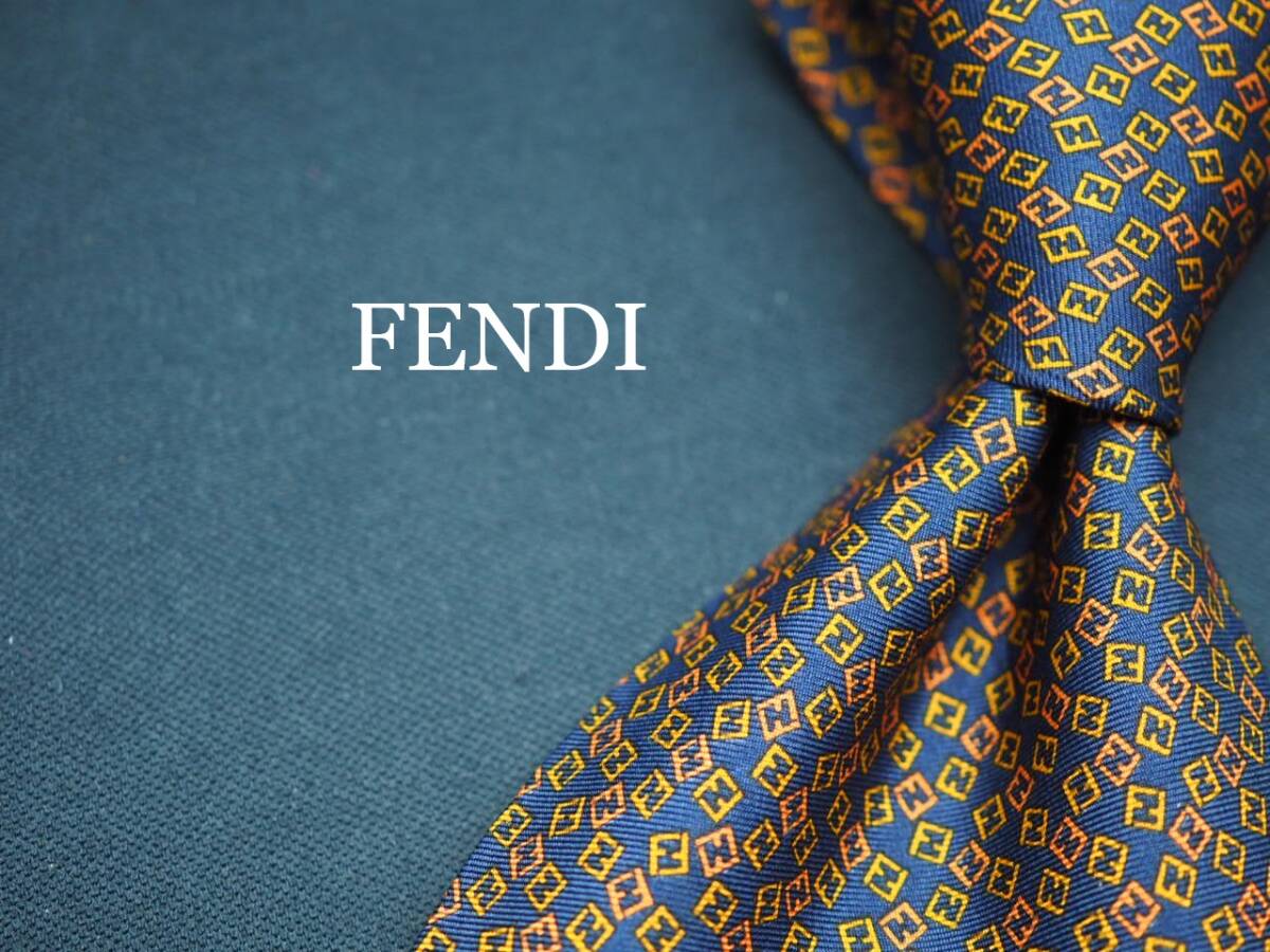 美品【FENDI フェンディ】 G1619 ロゴ ネイビーオレンジ系 SILK ブランド ネクタイ 古着 良品 転売 仕入