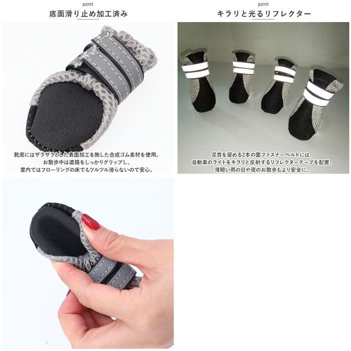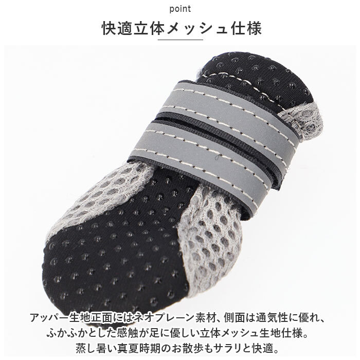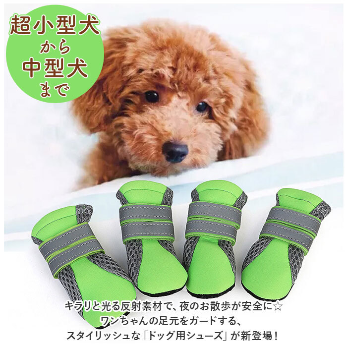 | 商品説明 | ・・キラリと光る反射素材で、夜のお散歩が安全に☆ワンちゃんの足元をガードする、スタイリッシュな「ドッグ用シューズ」が新登場! ・【傷つきやすい肉球を保護】 ・冬の乾燥時期や夏の焼けたアスファルトの上を歩く毎日のお散歩・・・。ワンちゃんの肉球は傷つきやすくてデリケート。そんな愛犬の足元を優しく守ってくれるワンちゃん専用シューズ。 ・【お散歩前にスポッと装着!】 ・シューズ履き口は背面側がV字型にカットされているので、ワンちゃんの足がスポッと入って装着スムーズ。 ・【脱げにくい安心仕様】 ・ワンちゃんの足首にシューズを装着したら、2本の面ファスナーベルトをぐるりと巻き付けてしっかり固定。たくさん歩くお散歩大好きなワンちゃんでも靴が脱げにくい! ・【快適立体メッシュ仕様】 ・アッパー生地正面にはネオプレーン素材、側面は通気性に優れ、ふかふかとした感触が足に優しい立体メッシュ生地仕様。蒸し暑い真夏時期のお散歩もサラリと快適。 ・【底面滑り止め加工済み】 ・靴底にはザラザラとした表面加工を施した合成ゴム素材を使用。お散歩中は道路をしっかりグリップし、室内ではフローリングの床でもツルツル滑らないので安心。 ・【キラリと光るリフレクター】 ・足首を留める2本の面ファスナーベルトには、自動車のライトをキラリと反射するリフレクターテープを配置。薄暗い雨の日や夜のお散歩もより安全に。 ・【ピッタリサイズをチョイス!】 ・超小型犬から中型犬まで、ワンちゃんの足の大きさに合わせてピッタリサイズが選べる、「Sサイズ」(足幅3.0cm)から「XLサイズ」(足幅4.8cm)までの5サイズ展開。 |