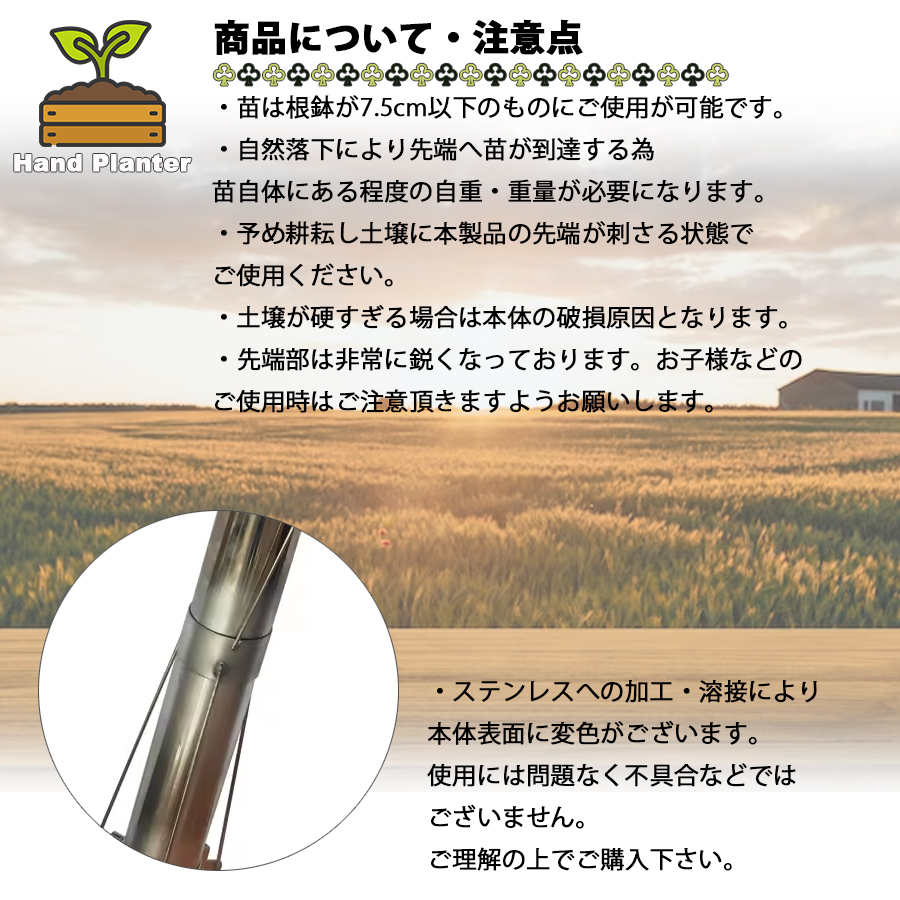 圃場は予め移植する深さまで耕耘していて、土壌に本製品の口ばしが刺さる状態であること。
