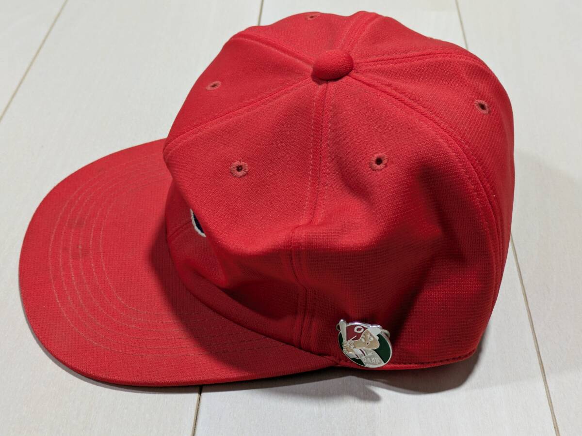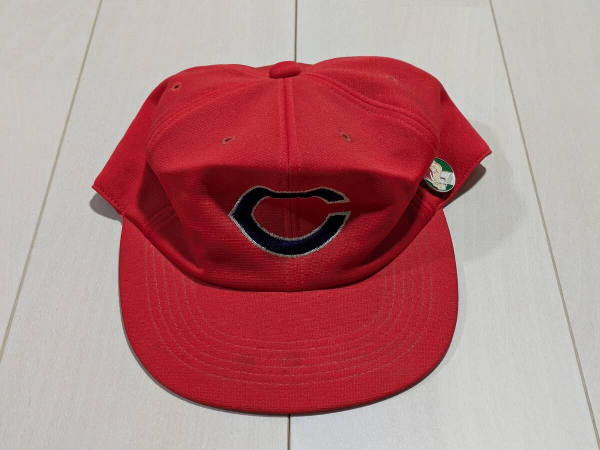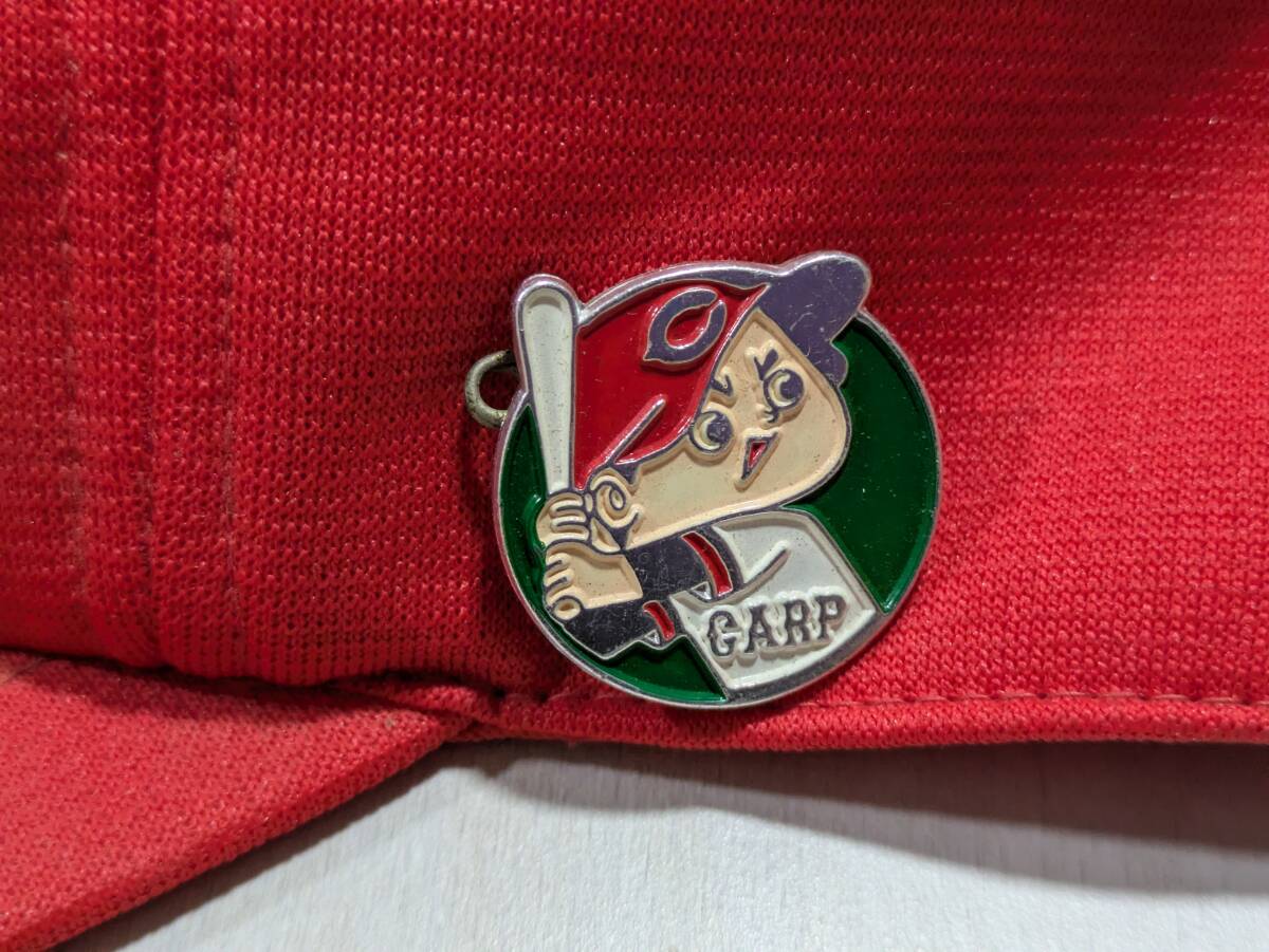 広島東洋カープの赤いキャップ、Cマーク刺繍と安全ピンのカープ坊やロゴ付き。
