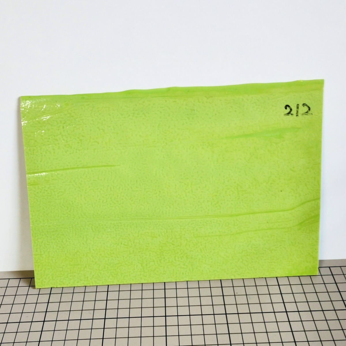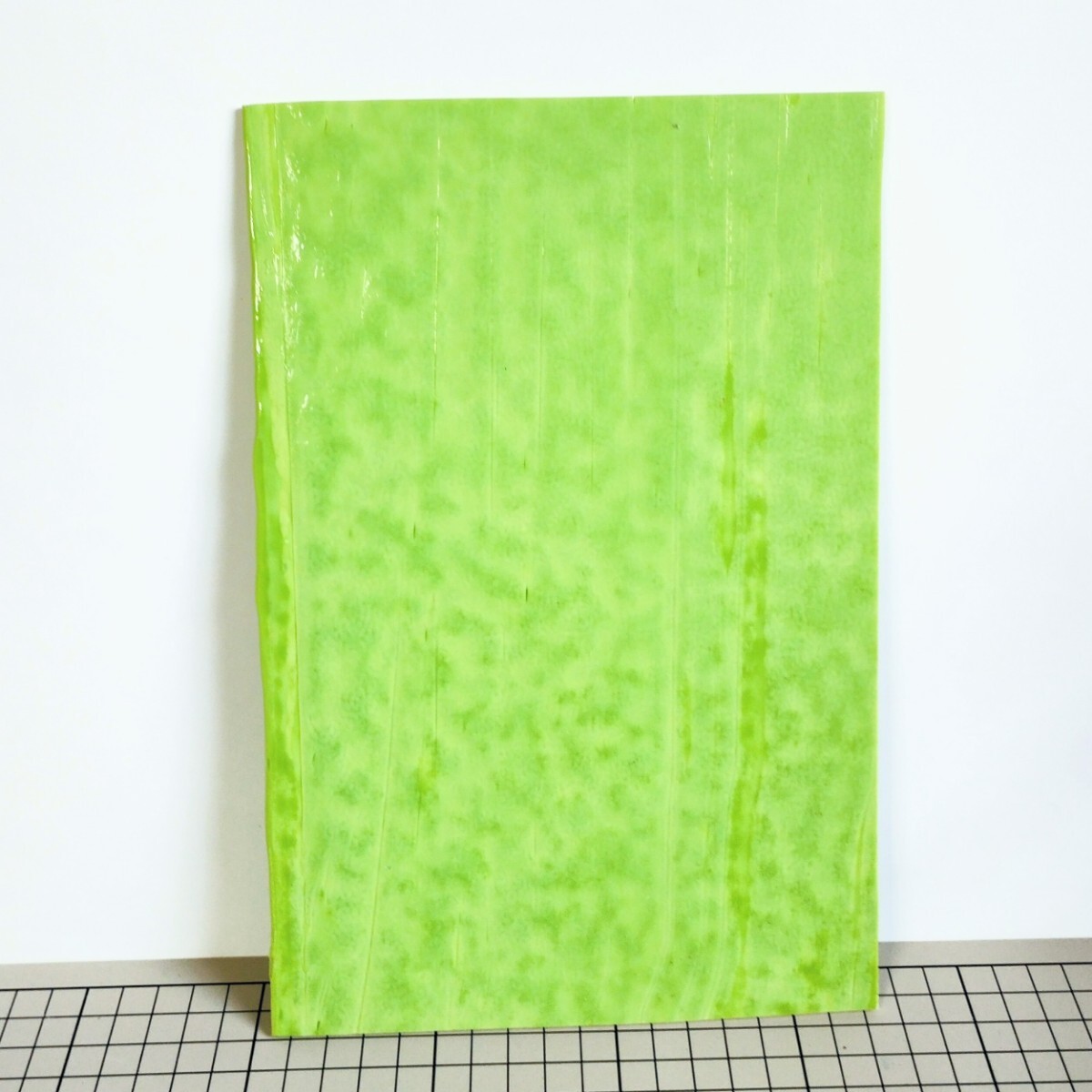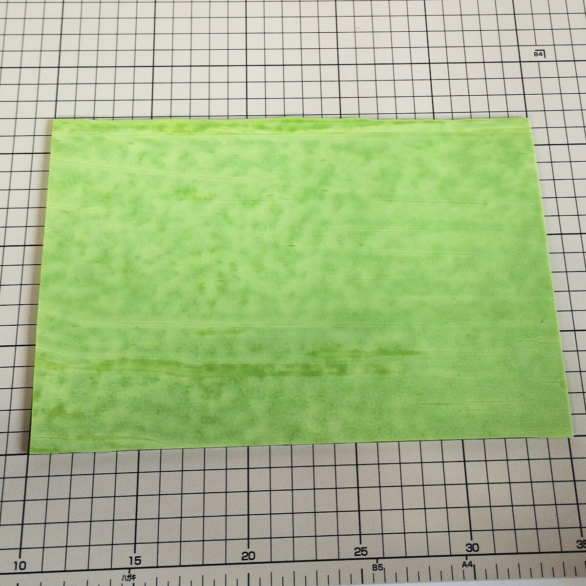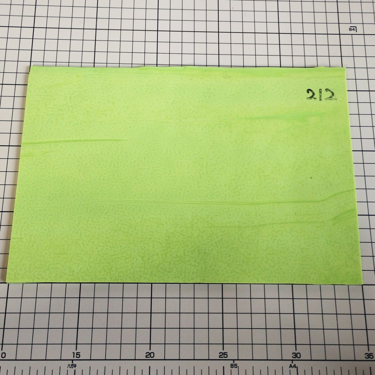 モレッティの板ガラス212ピーチグリーンOP です。約16×25cm、厚さは3〜4mmです。多少の誤差はご容赦ください。購入当初からのマジックの数字書き、多少の欠け、擦り傷等がございます。