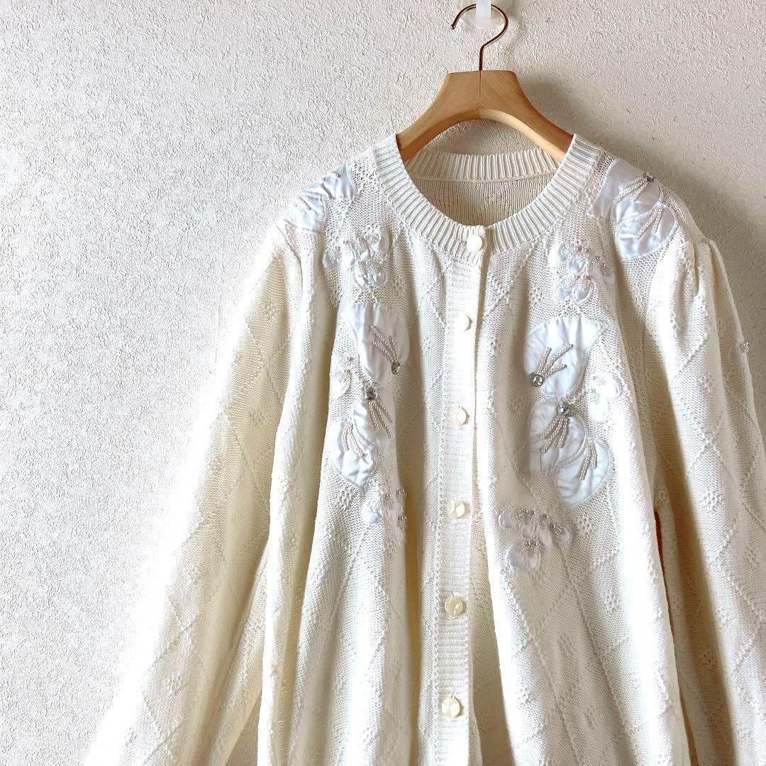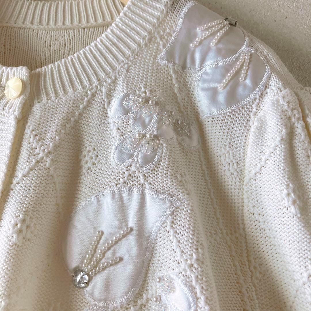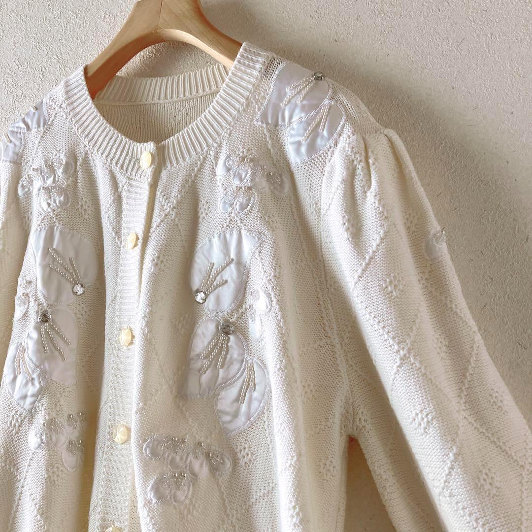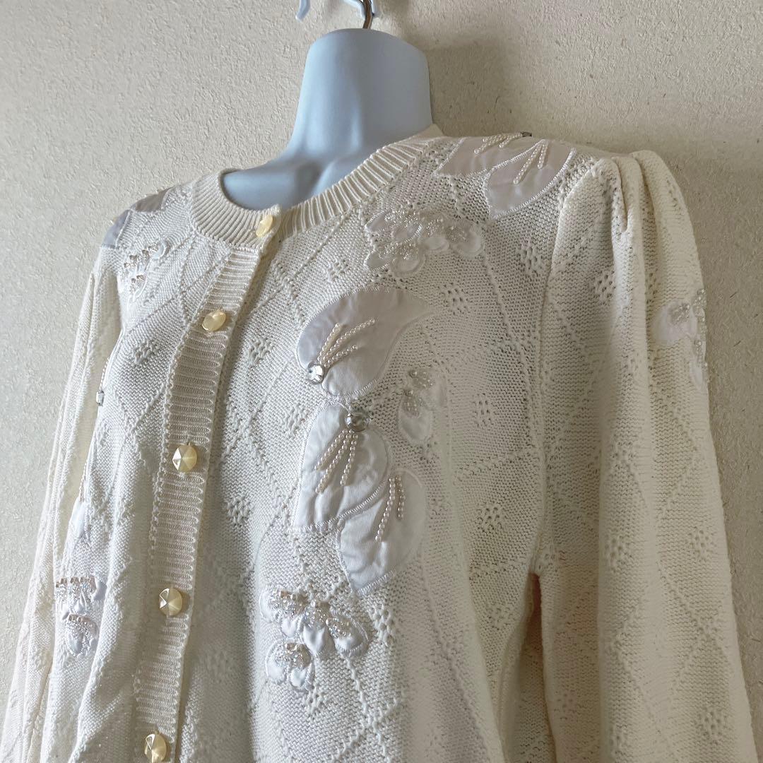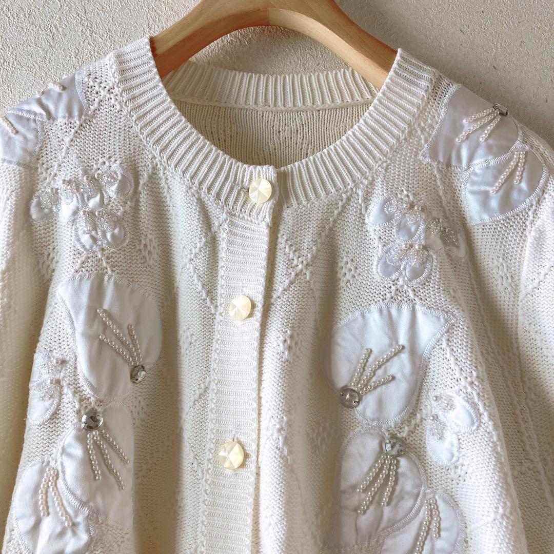 花柄 刺繍 コットン ニット カーディガン 薄手 パール ビジュー 白 100スタ L相当 ゆったり