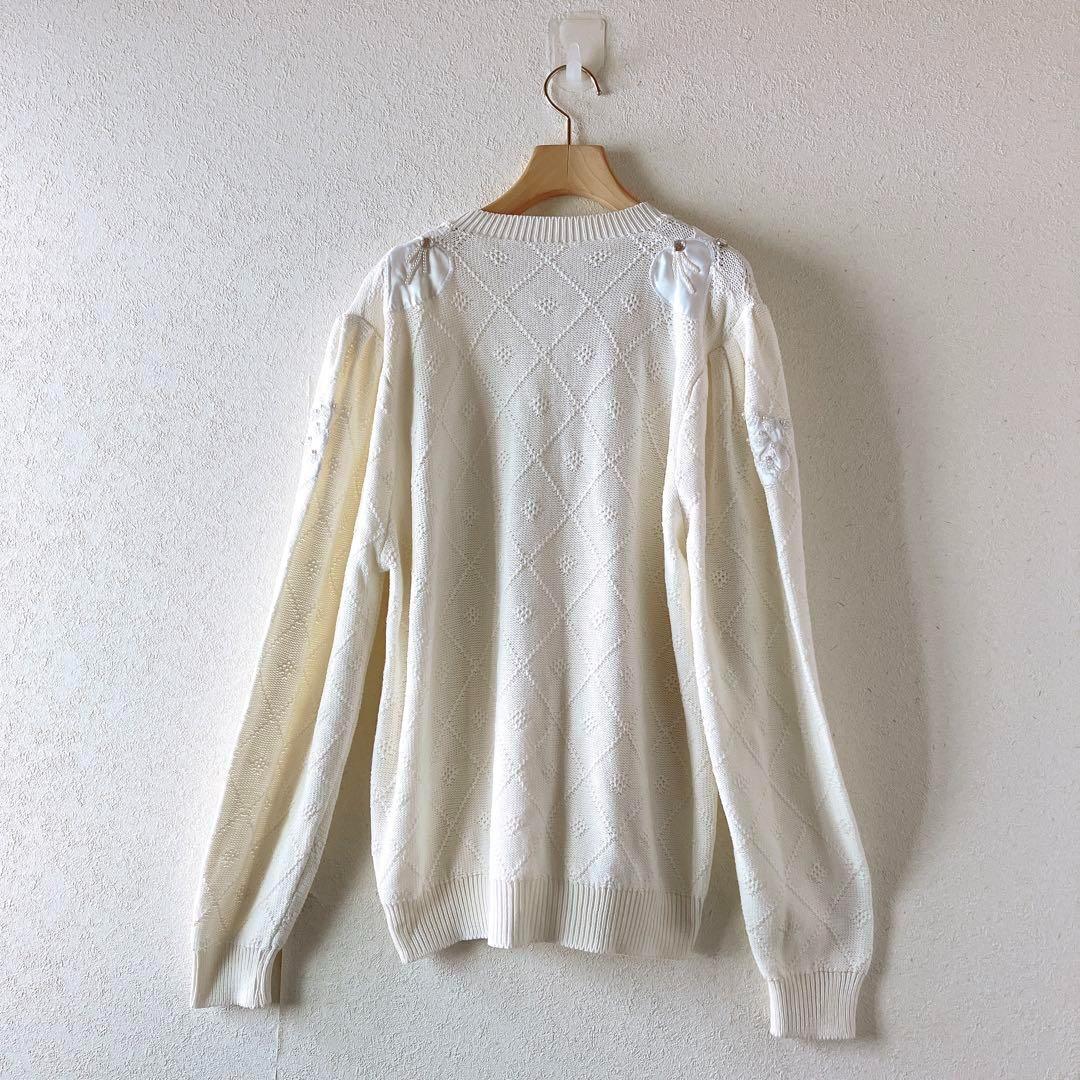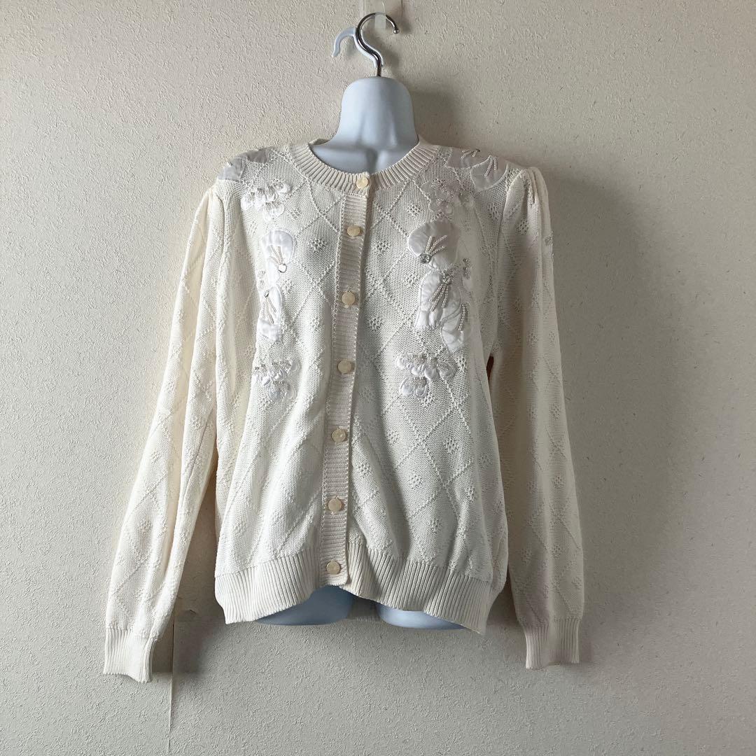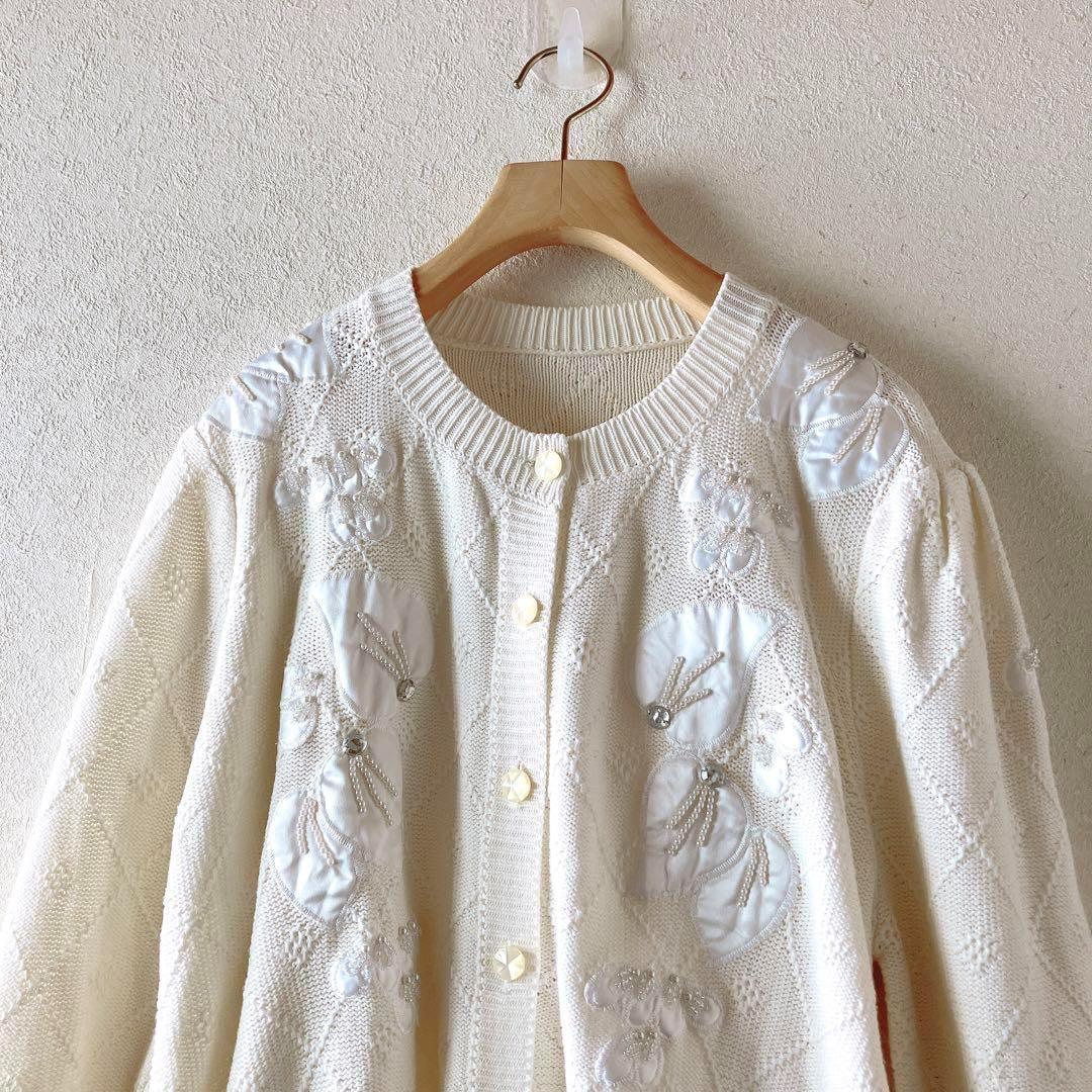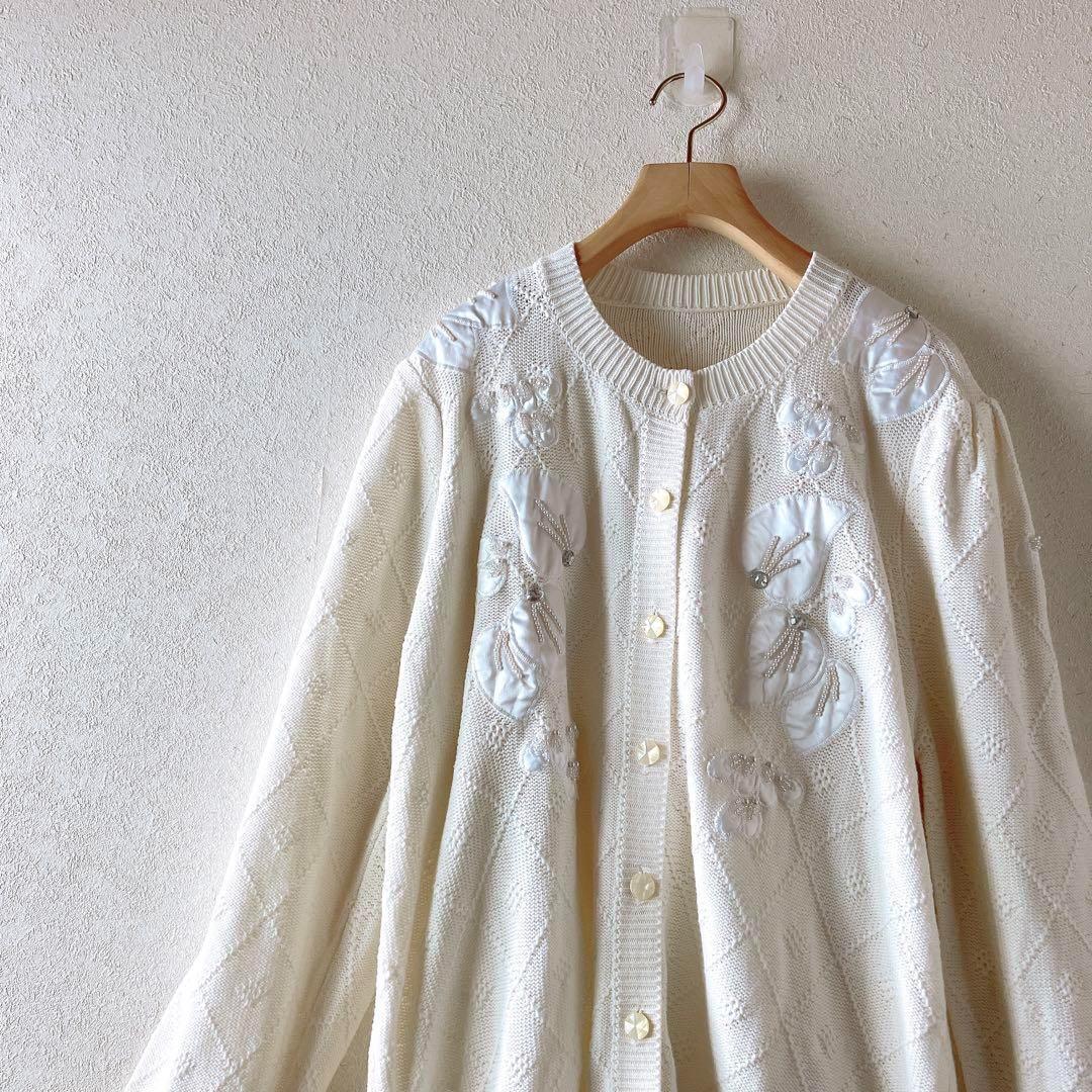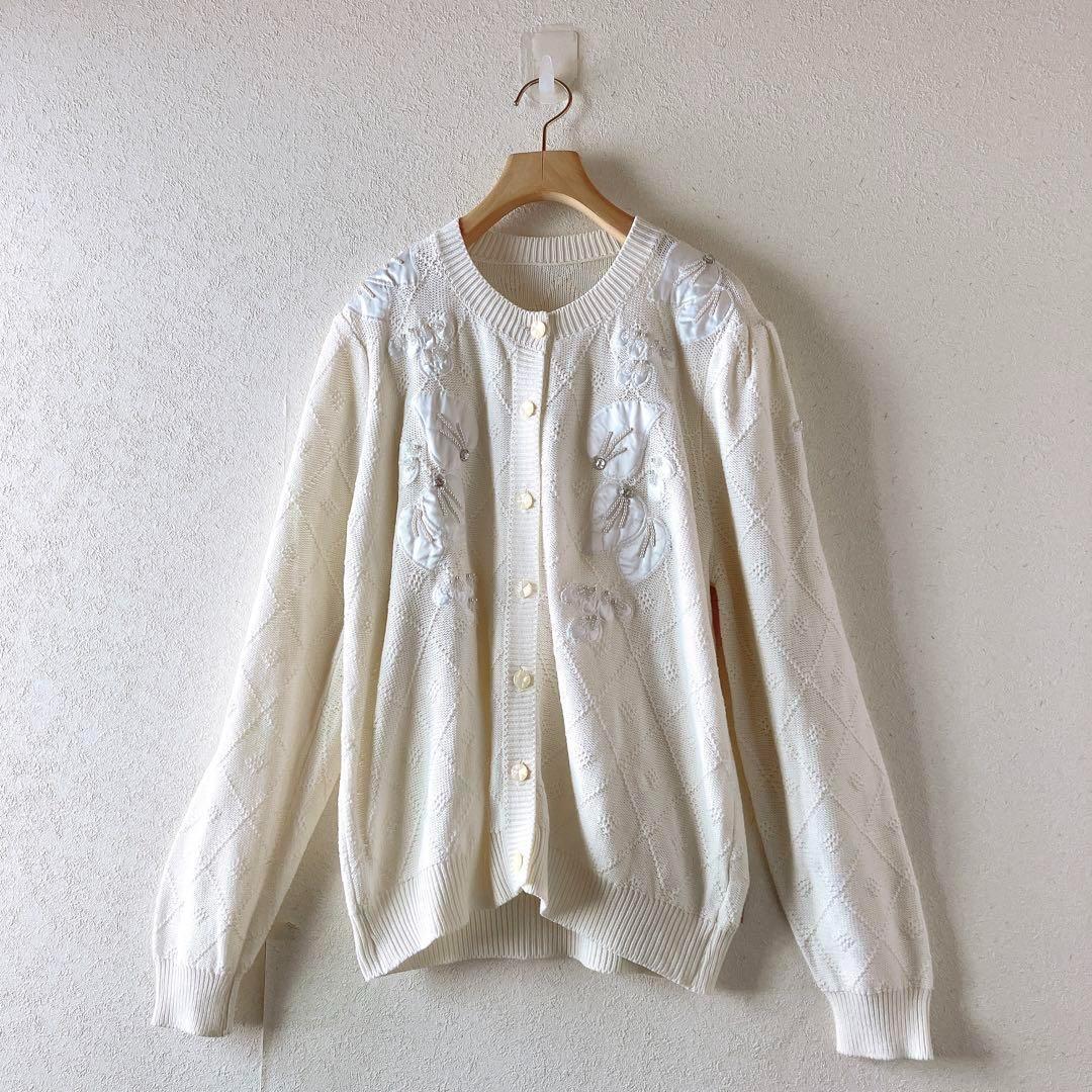 花柄 刺繍 コットン ニット カーディガン 薄手 パール ビジュー 白 100スタ L相当 ゆったり