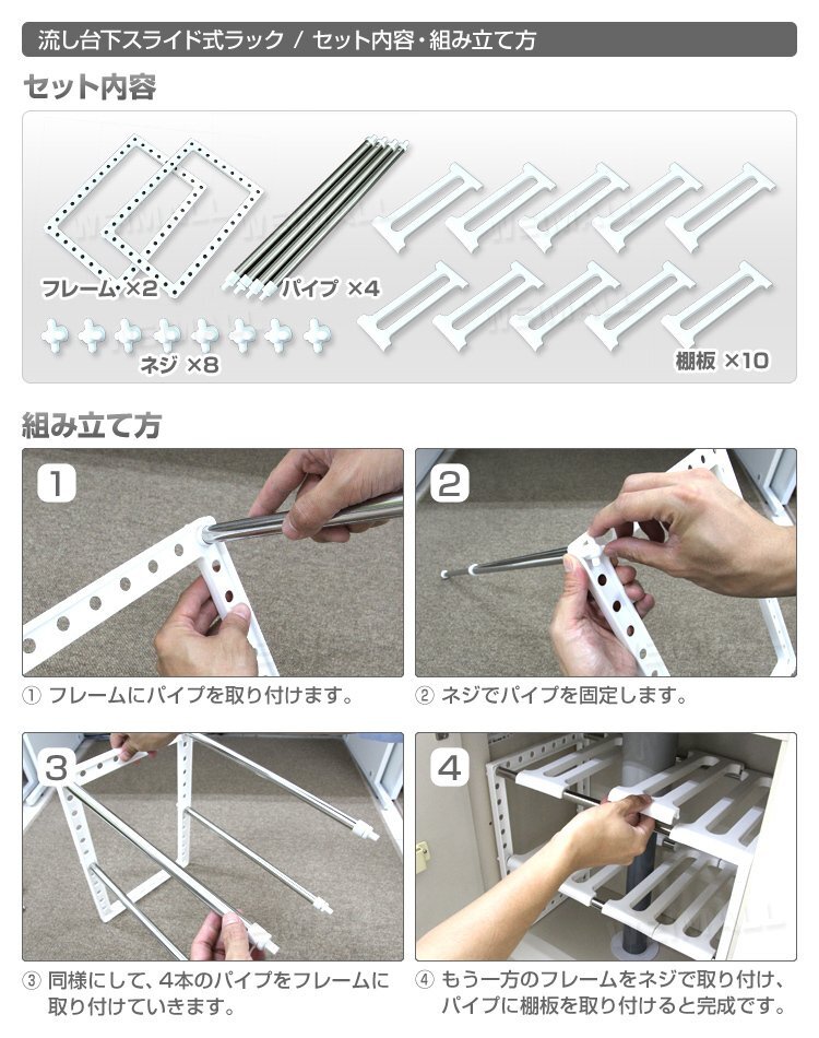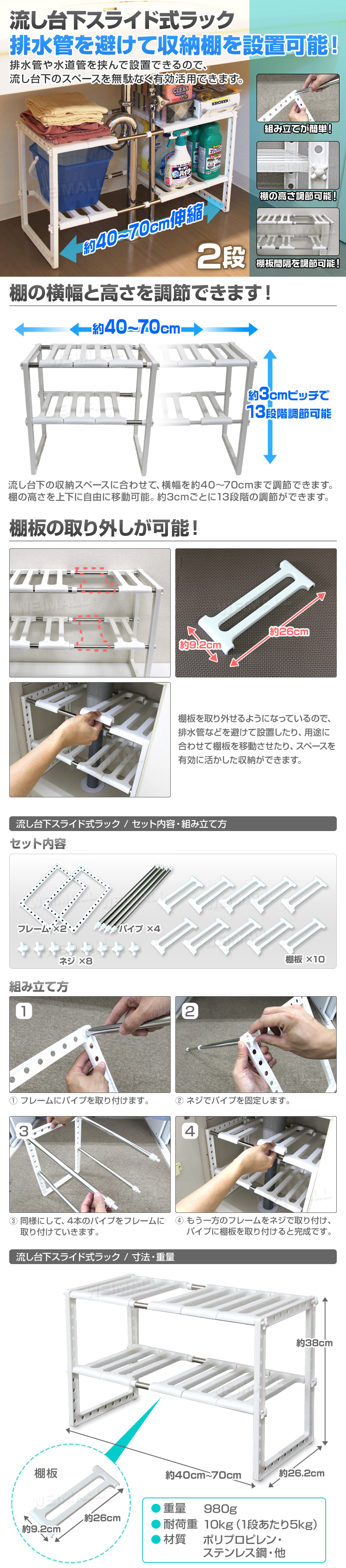 洗面台下をすっきり収納できる便利な収納棚です。 キッチンのシンク下で使うこともできます。 棚板が5枚に分かれているので排水管をよけて簡単に設置できます。 排水管を縦に挟むので棚が無駄なく使えます。 汚れても取り外して簡単水洗い、お掃除ラクラクでいつも清潔に保てます。 収納棚の横幅は収納スペースに合わせて伸縮可能です。 棚板は好きな位置に自由に高さ調節できます。 工具が不要で組み立ても楽々できます。 耐荷重はあわせて10kg(上段:5kg、下段:5kg)です。 【商品仕様】 サイズ(約)W700~400×D262×H380mm 重量(約)980g 材質:ポリプロピレン、ステンレス鋼 他 耐荷重(約):10kg(上段:5kg、下段:5kg) |