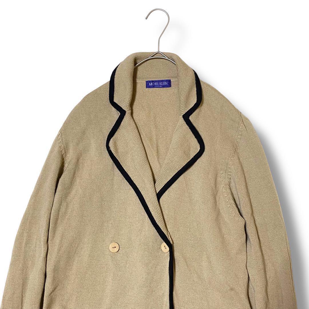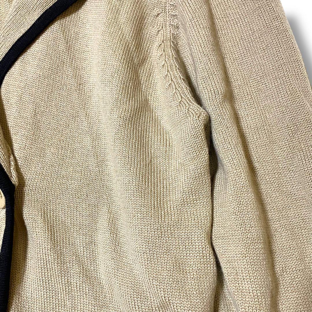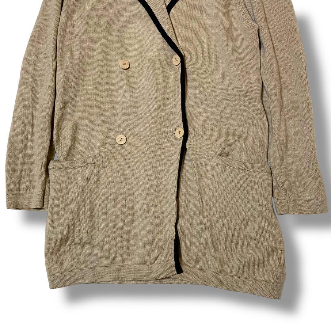 ウール100%のベージュダブルブレストカーディガン、ブラックのトリムが特徴。
