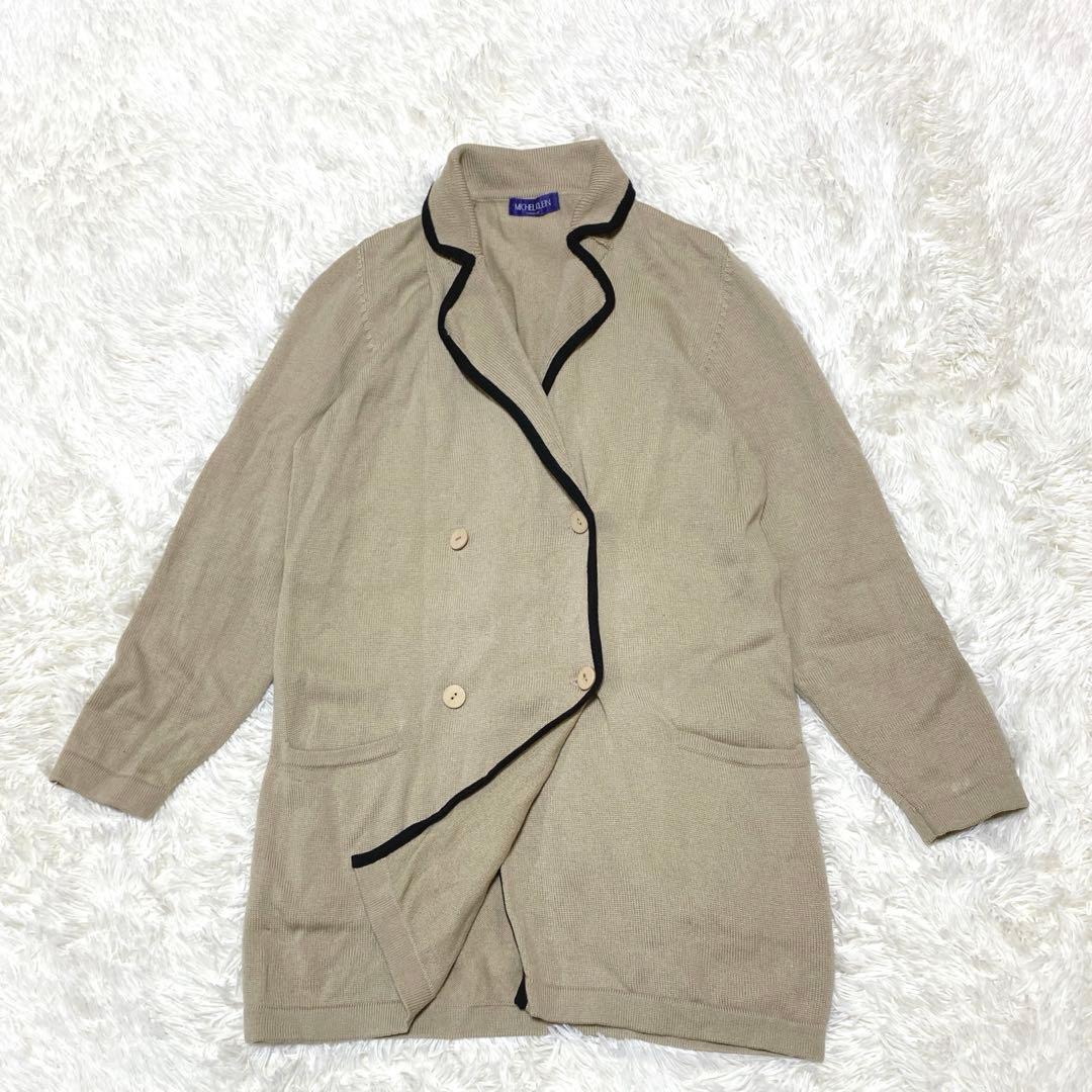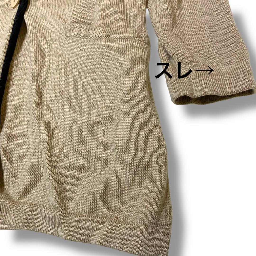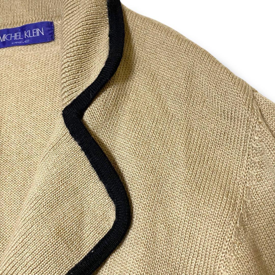 ウール100%のベージュダブルブレストカーディガン、ブラックのトリムが特徴。