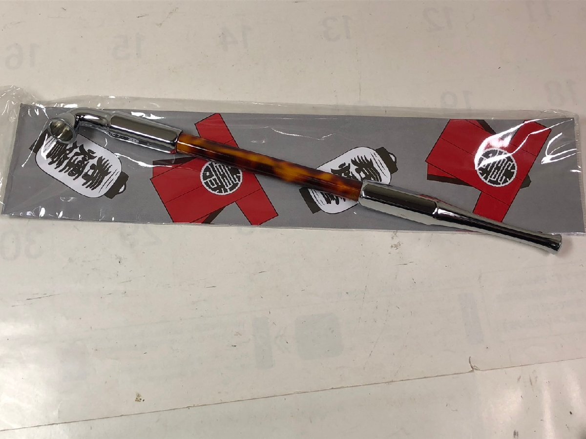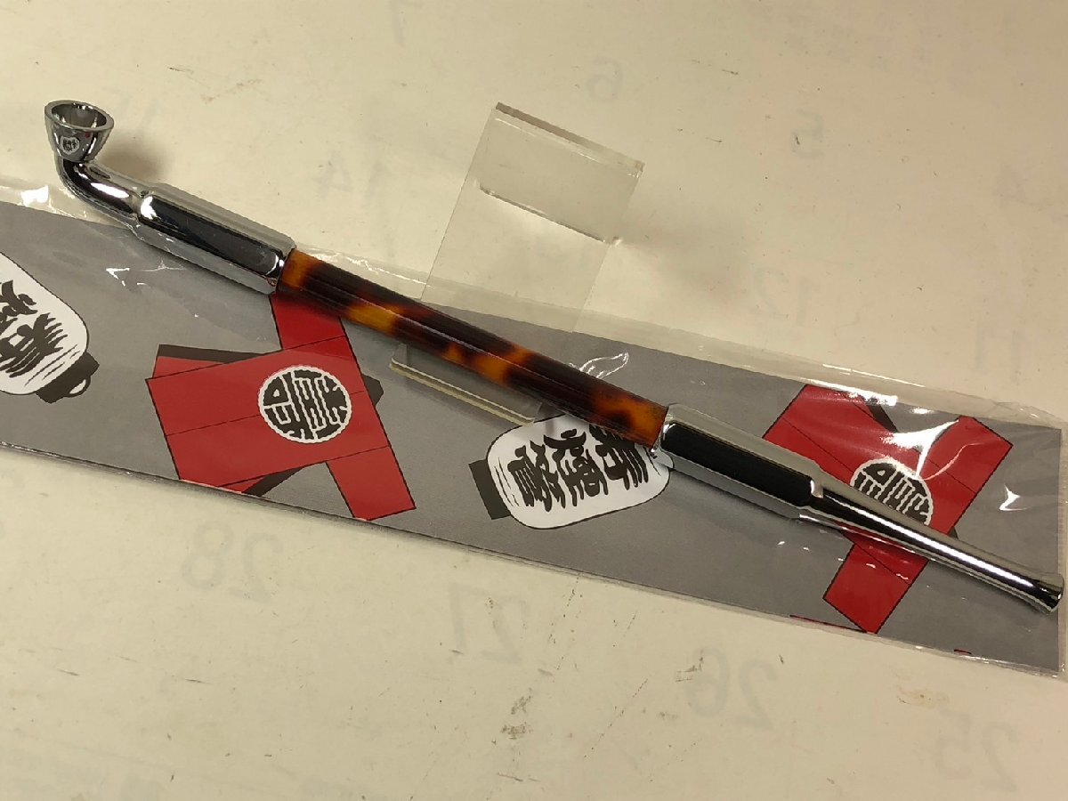 雁首、吸い口、ラオの素材は金属、煙道は煙管用のモールクリーナーを吸い口から差し込んで掃除します。 寿とは柘製作所がある町会名、台紙に描かれている半天は三社祭の寿四丁目の町会半纏。