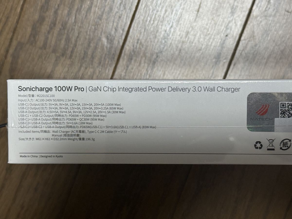新品、未開封■MATECH Sonicharge 100W Pro (PD 充電器 100W 3ポート USB-C + A 急速充電器 ACアダプタ)